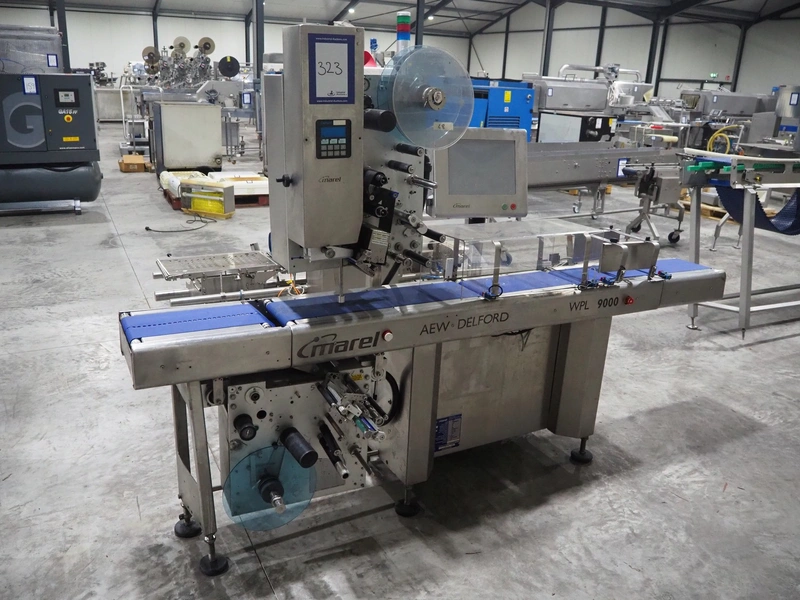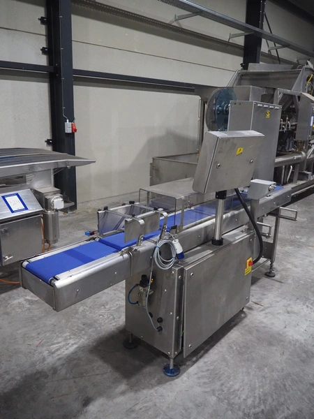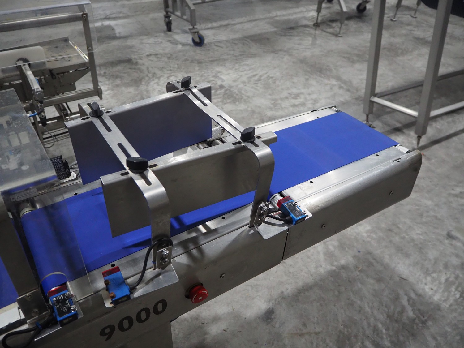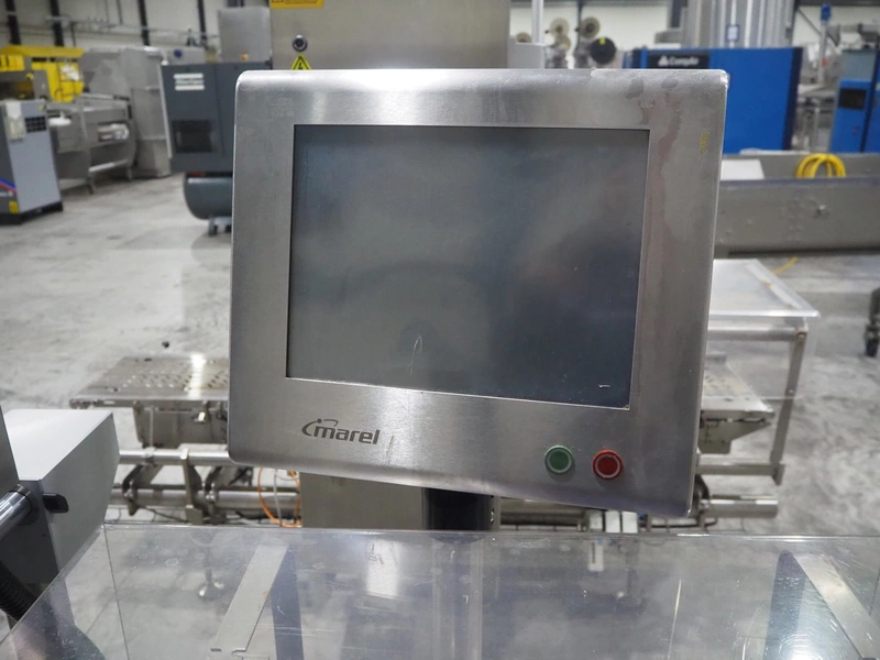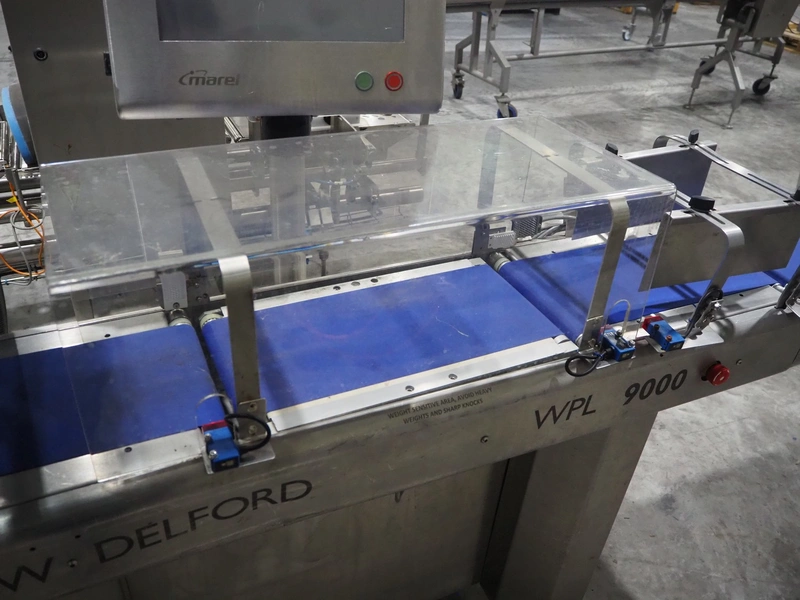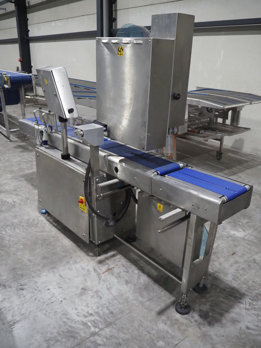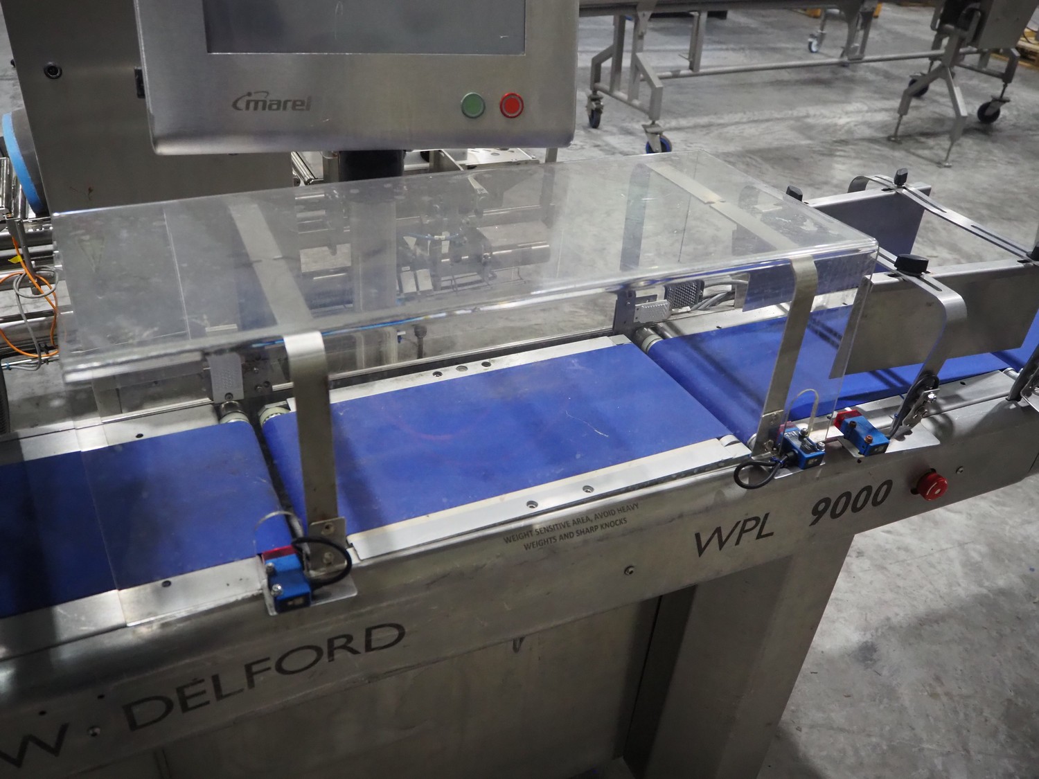 Marel / AEW Delford weighing and labelling machine, model: 9060, serial number: 1049954496084, Max capacity: 5.5 kg, 230 V, 50 Hz, belt speed: 0.3-0.5 m/s, plastic belt, belt width: 195 mm, total dimensions: 2600 mm x 650 mm x 1780 mm.