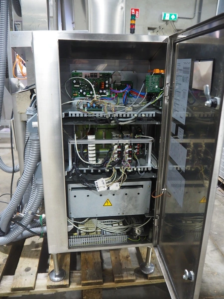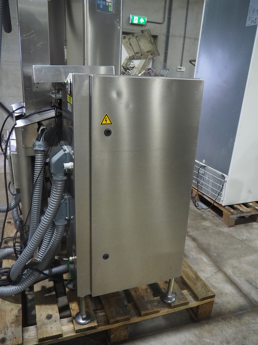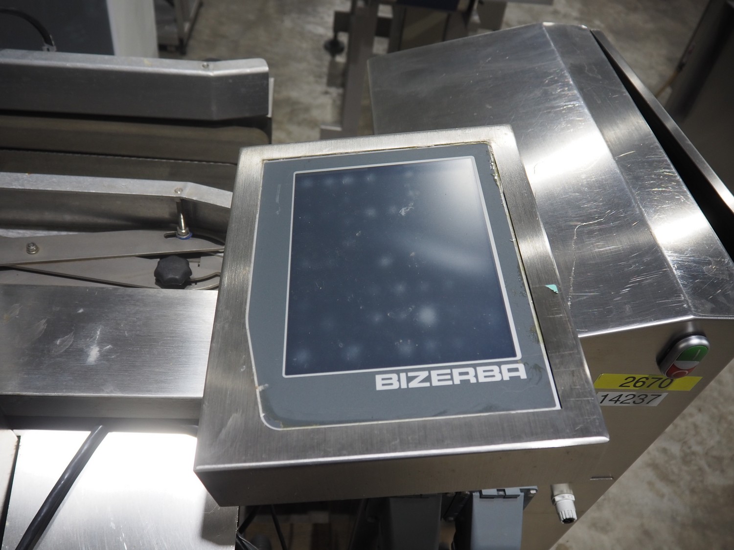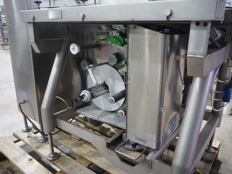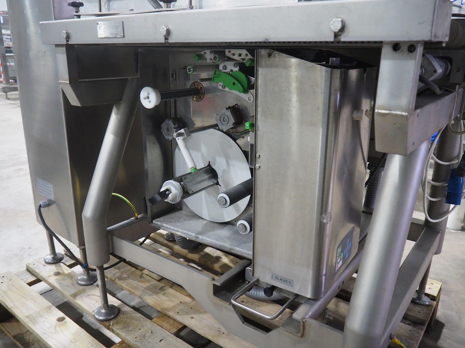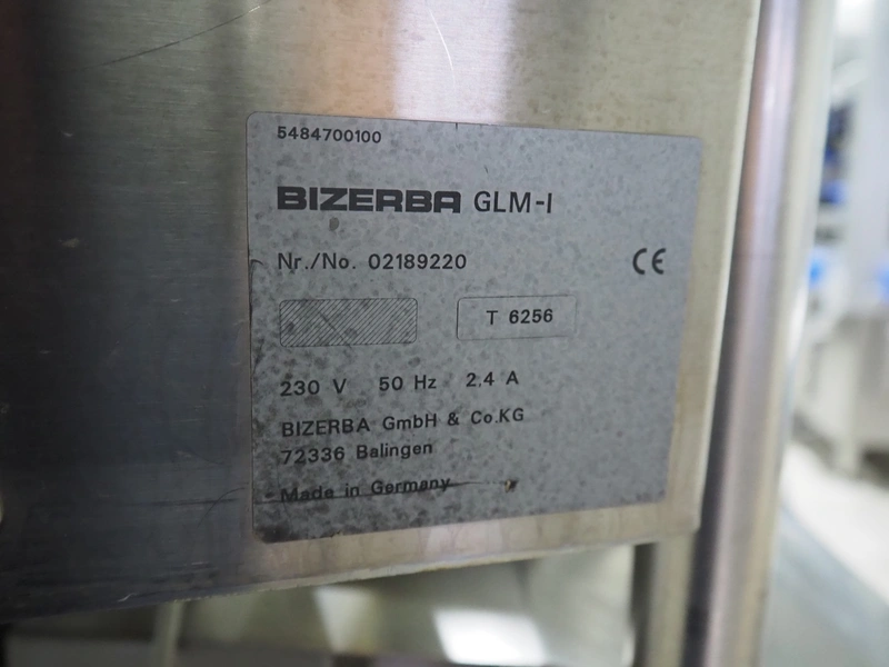Bizerba labelling machine with bottom and top labellers, type labelling unit: GLM-I, 230 V, 50 Hz, 2.4 A, plastic belt, belt width: (3x) 93 mm, total dimensions: 1600 mm x 850 mm x 2250 mm, 350 mm x 530 mm x 1150 mm.
