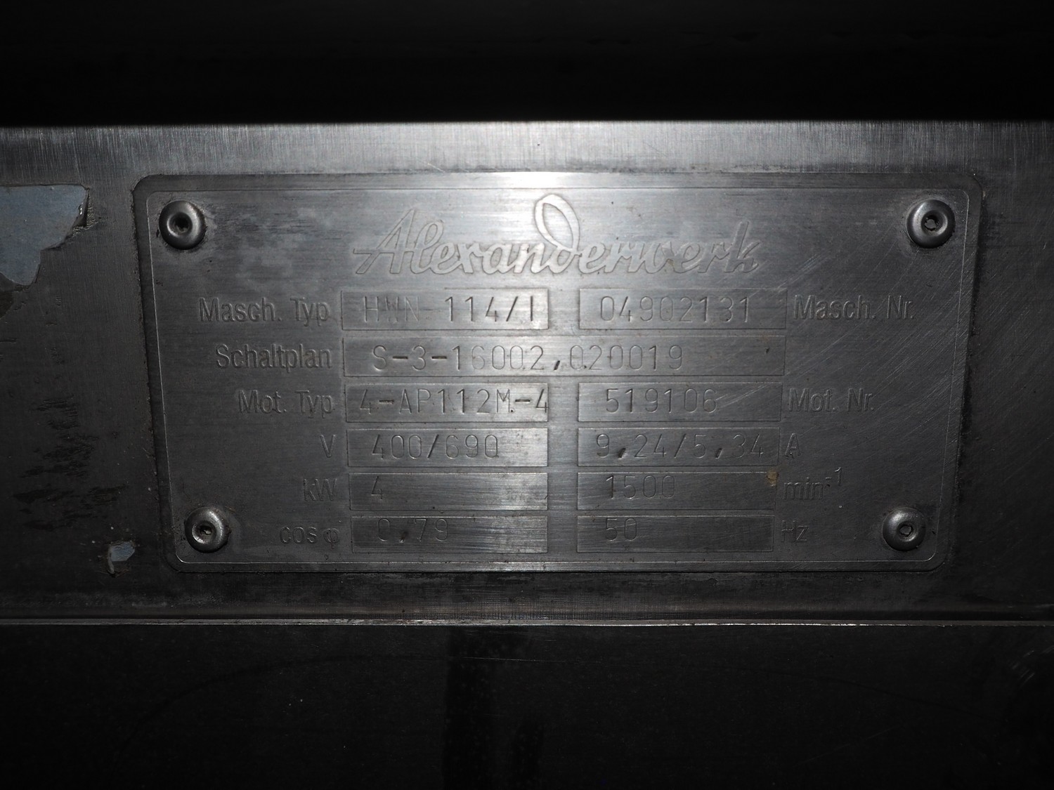 Alexanderwerk grinder, type: HWN 114/1, machine number: 04902131, 400/690 V, 50 Hz, 9.24/5.34 A, 4 kW, plate diameter: 114 mm, total dimensions: 1100 mm x 650 mm x 1130 mm.