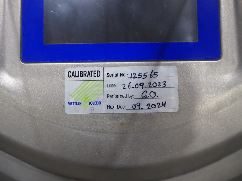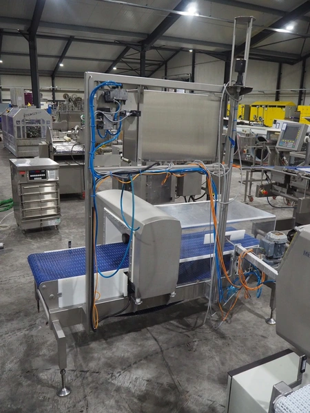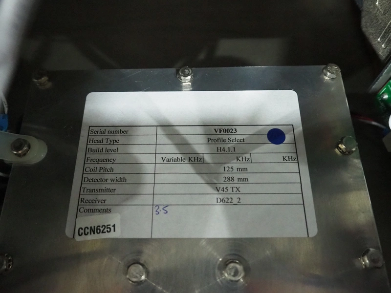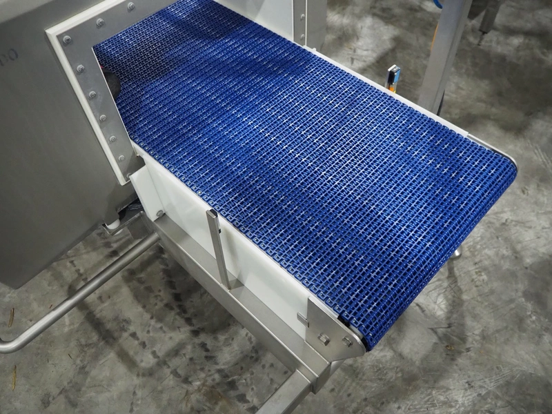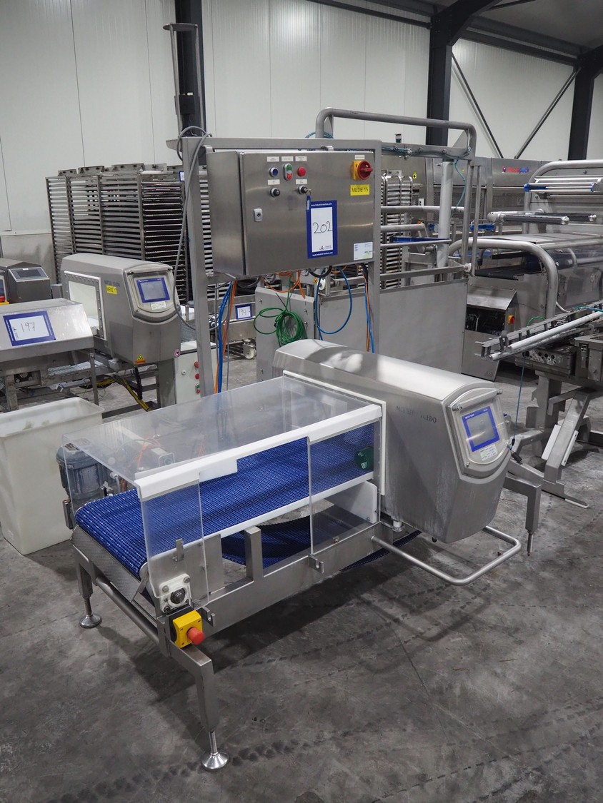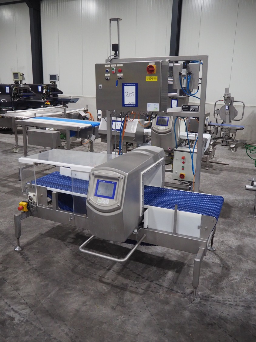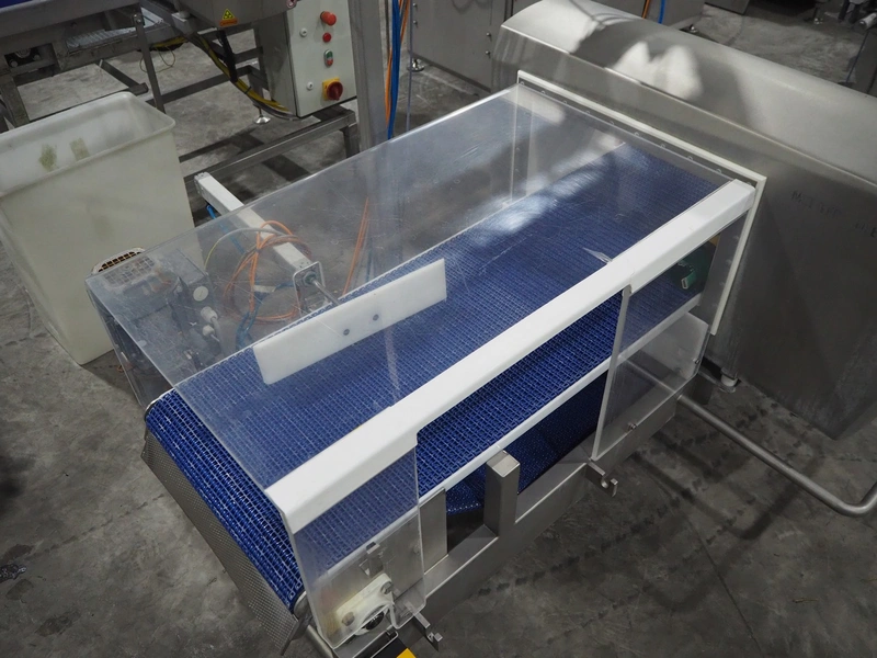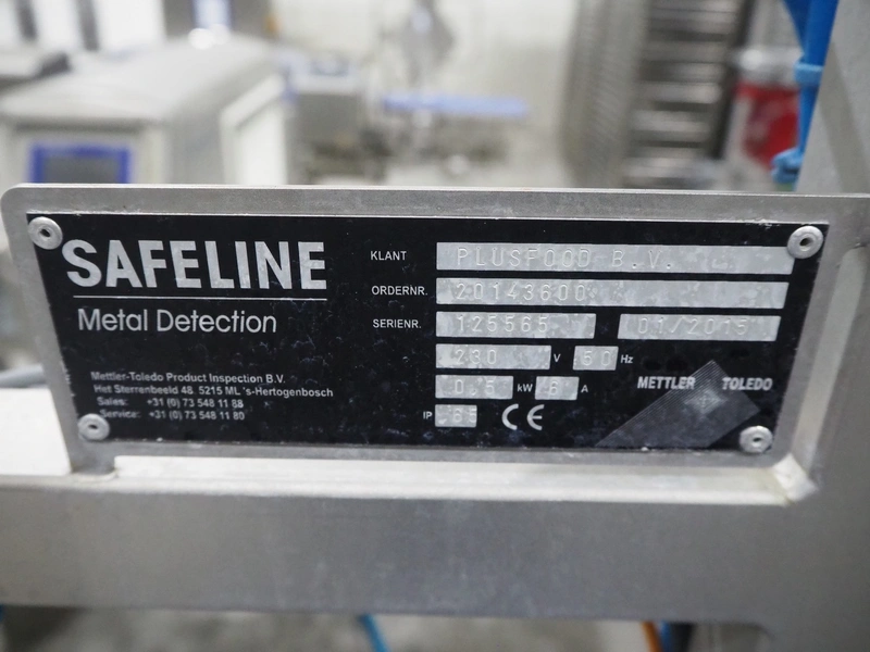 Mettler Toledo safeline metal detector with rejector, serial number: 125565, year of construction: 2015, 50 Hz, 230 V, 50 Hz, 6 A, 0.5 kW, plastic mesh belt, belt width: 430 mm, clearance: 445 mm x 215 mm, total dimensions: 1850 mm x 1470 mm x 2110 mm.