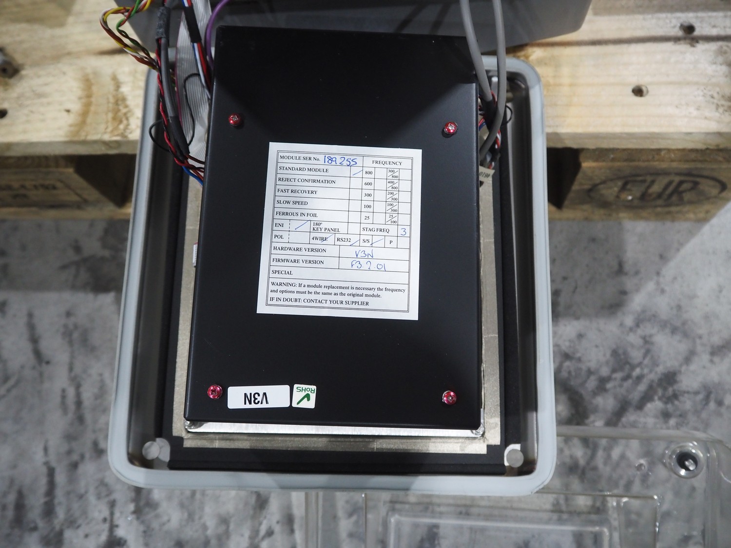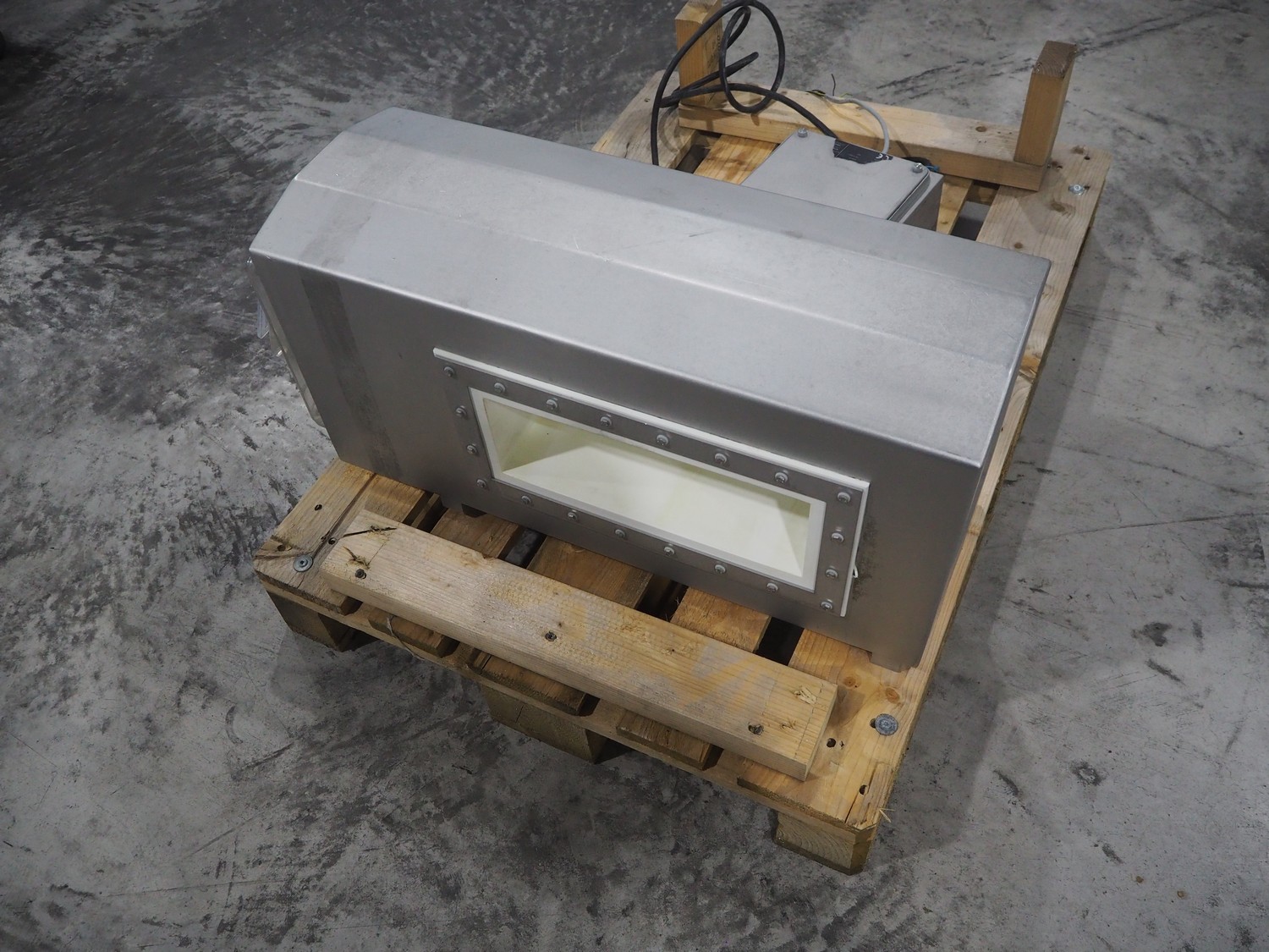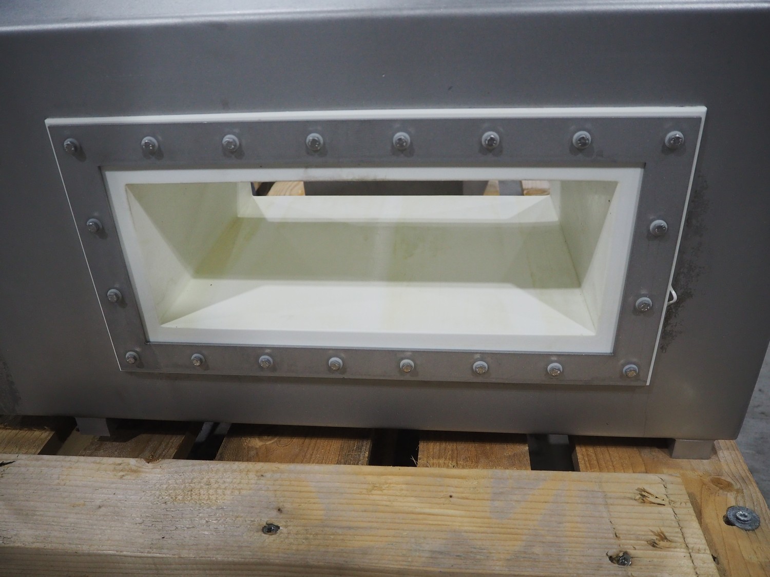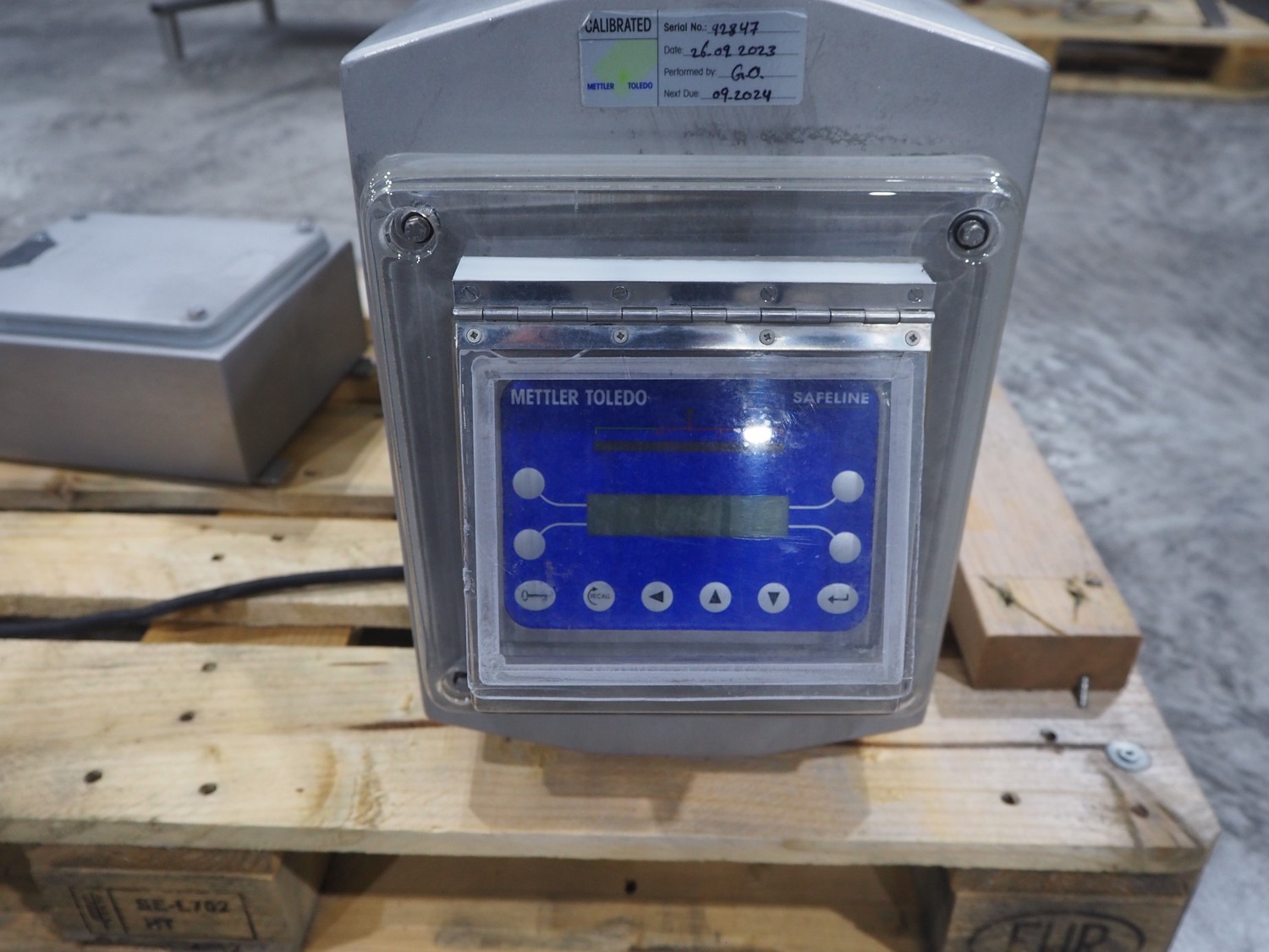 Mettler Toledo Safeline metal detector head, serial number: 92847, 50/60 Hz, 330 Watt, clearance: 350 mm x 125 mm, total dimensions: 870 mm x 290 mm x 410 mm.