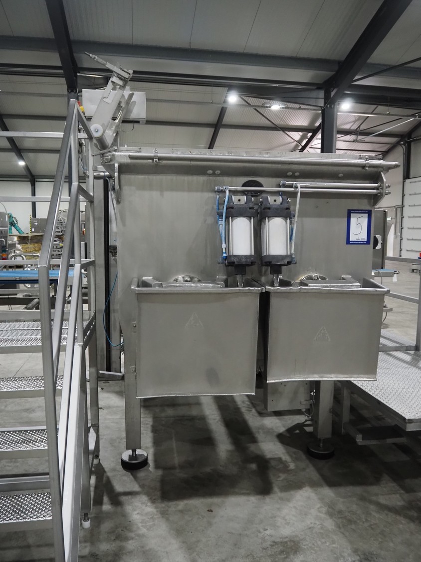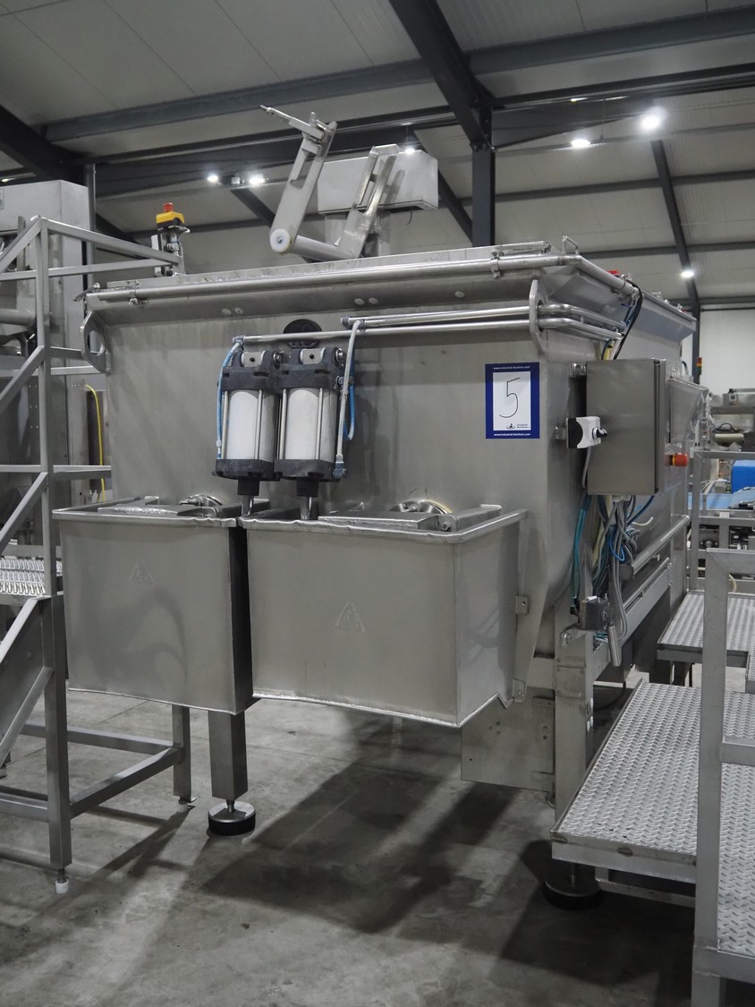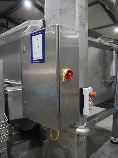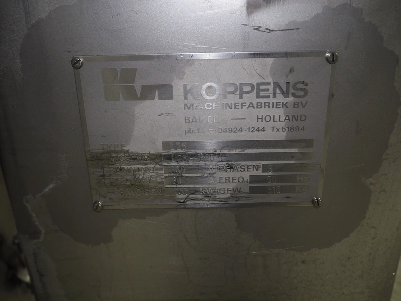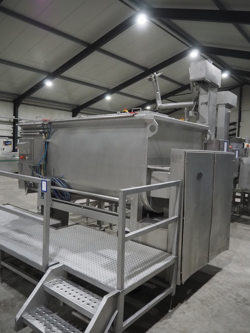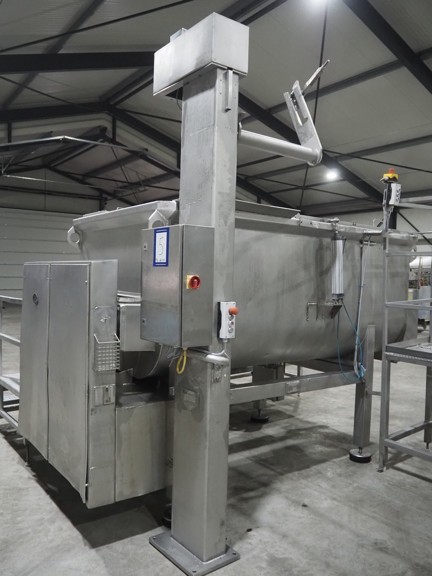Karl Schnell GmbH & Co double shaft ribbon mixer with Koppens lifter for 200 liter meat bins, inside dimensions mixer: 2450 mm x 650 mm x 1090 mm, total dimensions mixer: 3900 mm x 1950 mm x 1980 mm. Type lifter: L 25, machine number: L 25-608, 380 V, 3 Ph, 50 Hz, 3.1 A, 0.55 kW, weight: 310 kg, dimensions lifter: 1900 mm x 800 mm x 2900 mm.