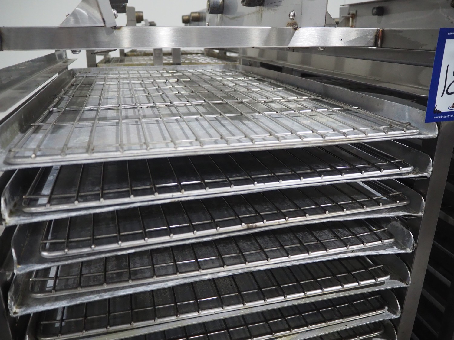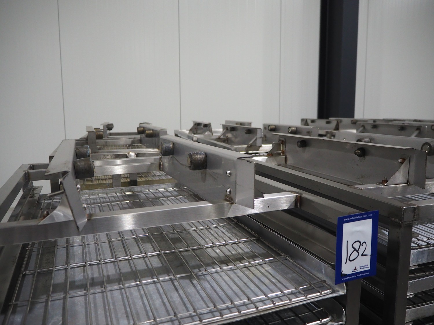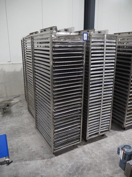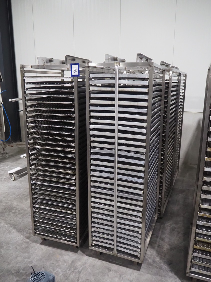 6 s/s trolleys for rotary oven, 32 floors, floor dimensions: 760 mm x 460 mm, total dimensions: (6x) 770 mm x 530 mm x 1830 mm.