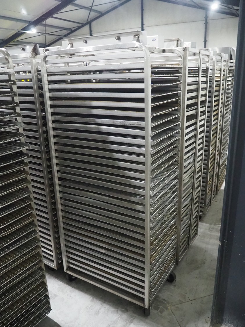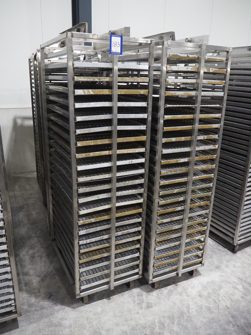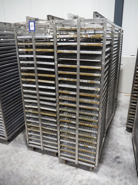 6 s/s trolleys for rotary oven, 32 floors, floor dimensions: 760 mm x 460 mm, total dimensions: (6x) 770 mm x 530 mm x 1830 mm.