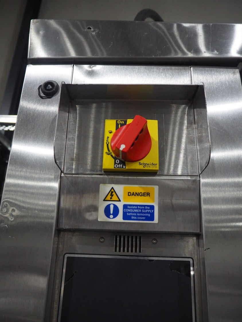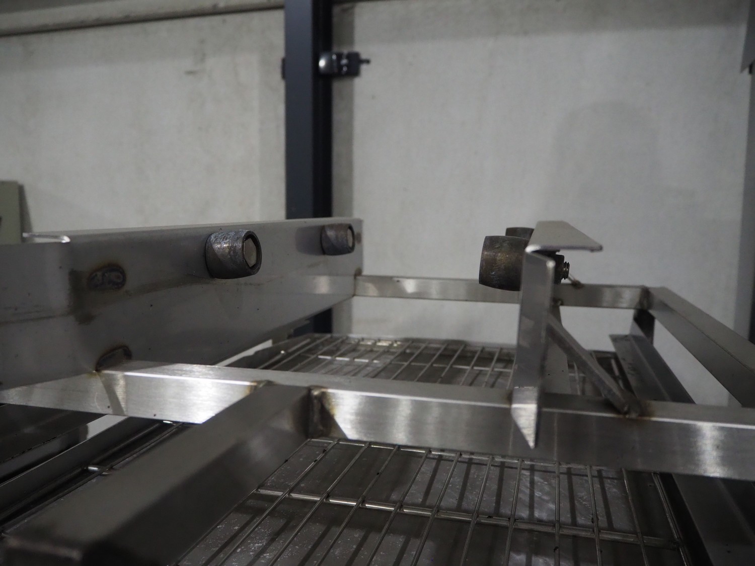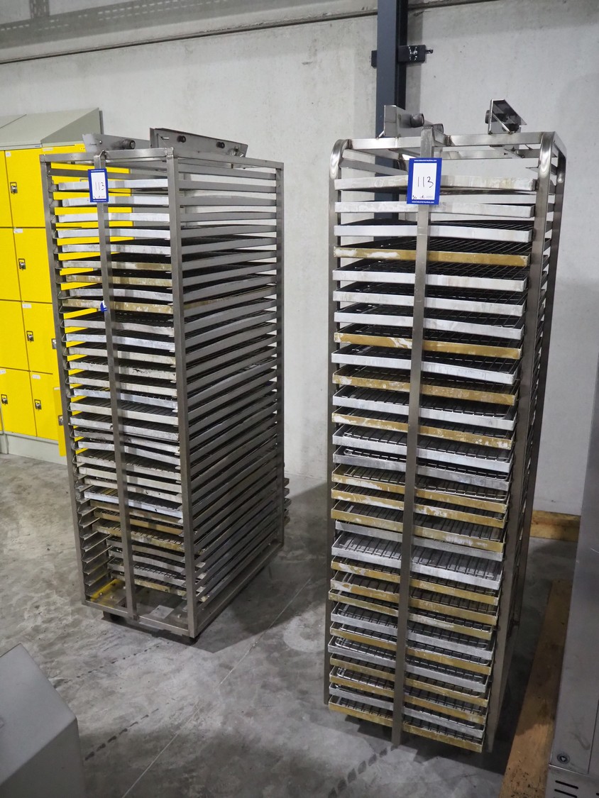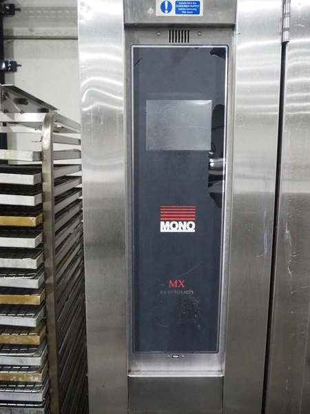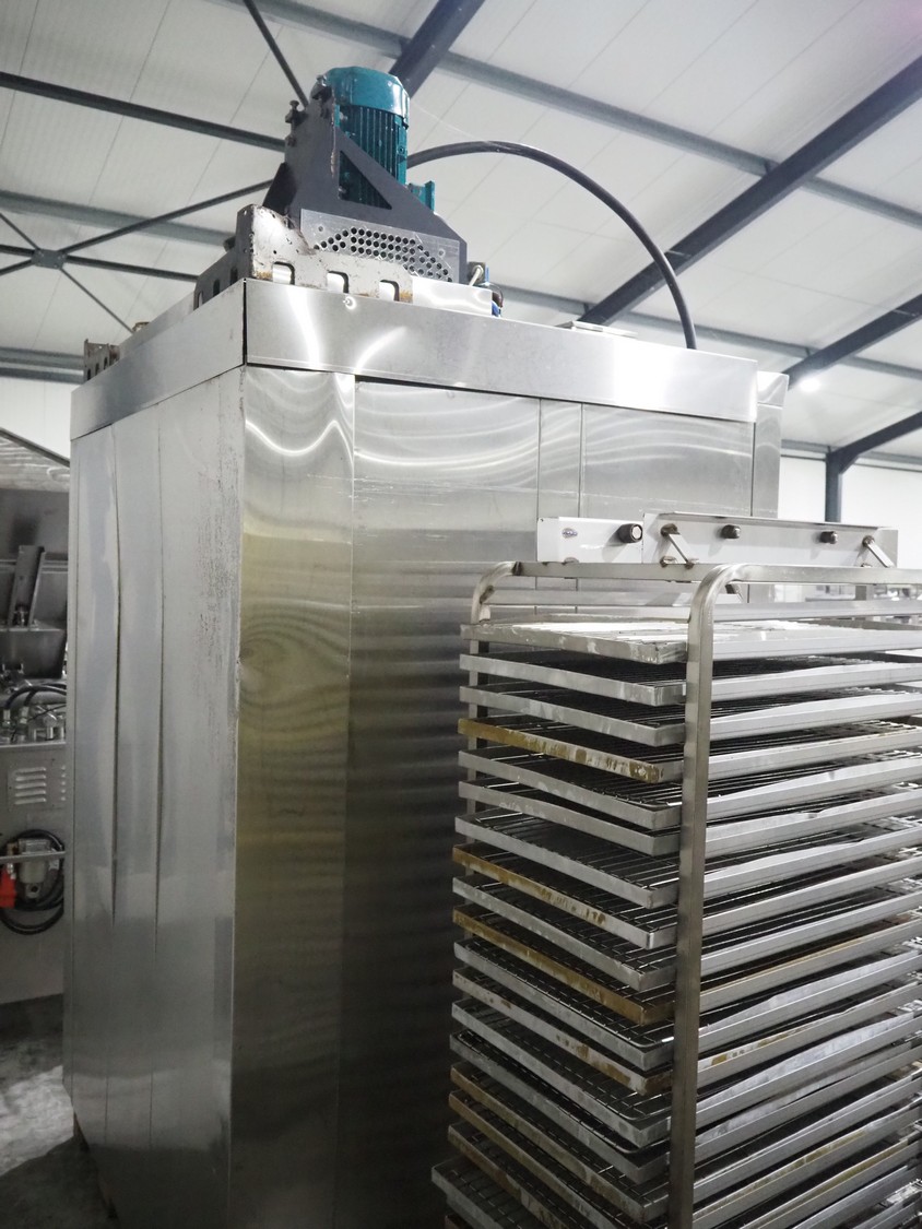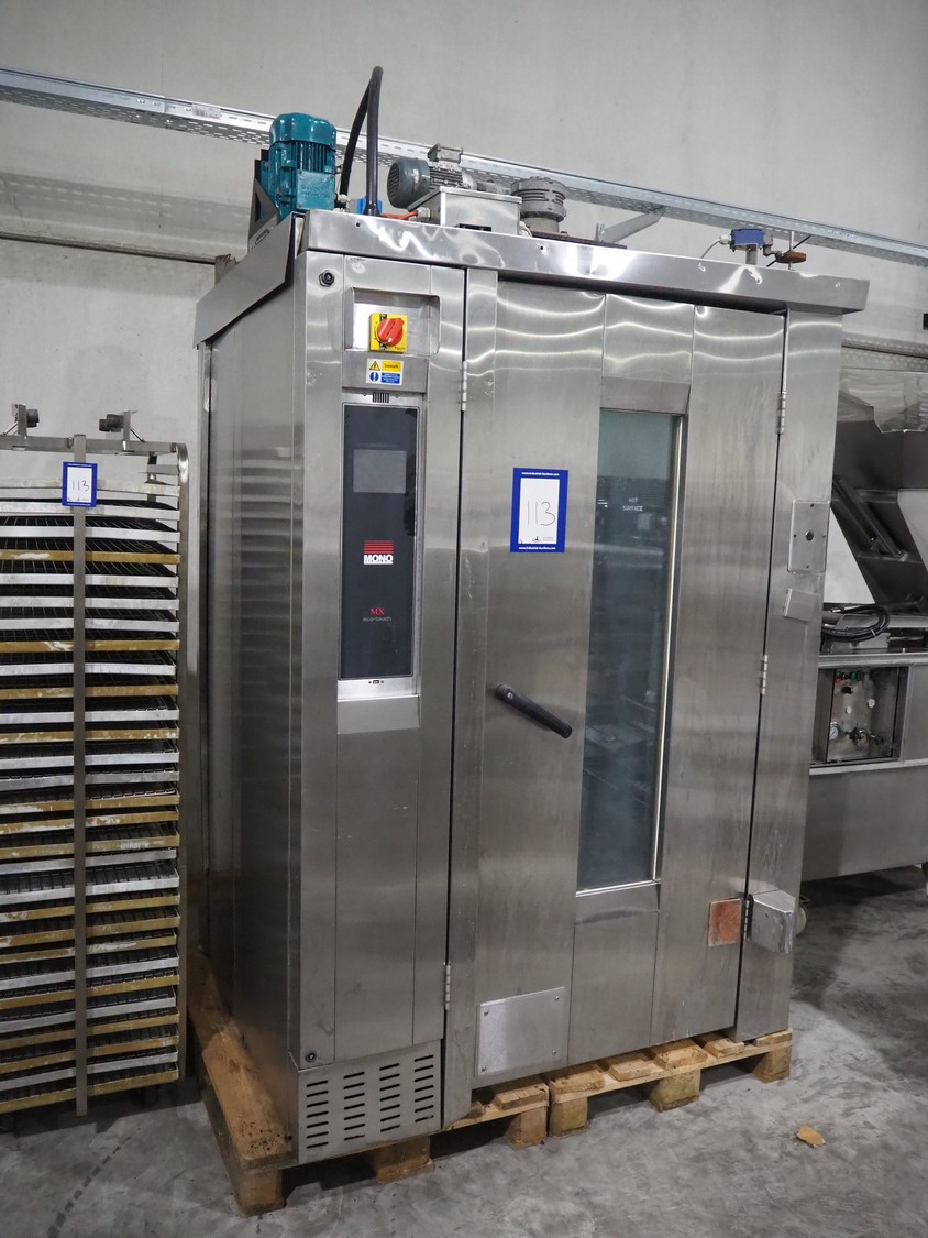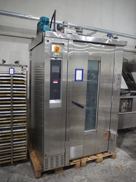 Mono rotary oven with 2 trolleys, inside dimensions: 950 mm x 950 mm x 1950 mm, total dimensions: 1500 mm x 1350 mm x 2600 mm. 2 s/s trolleys, 32 floors, floor dimensions: (32x) 760 mm x 460 mm, total dimensions: (2x) 770 mm x 530 mm x 1830 mm.