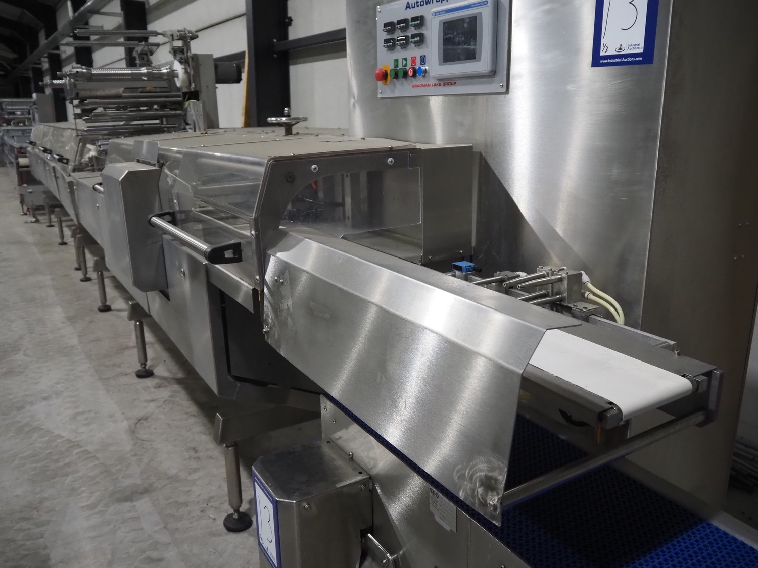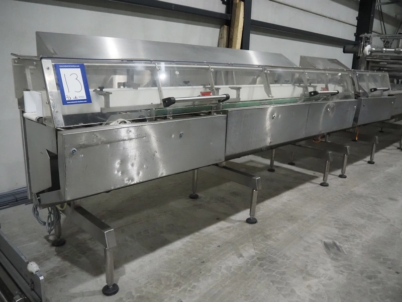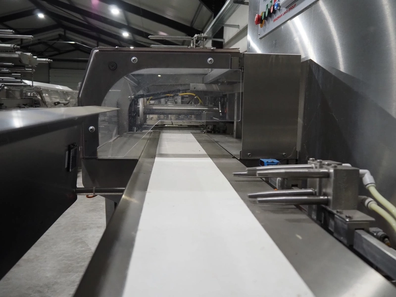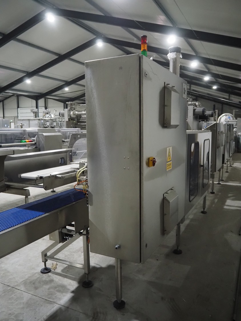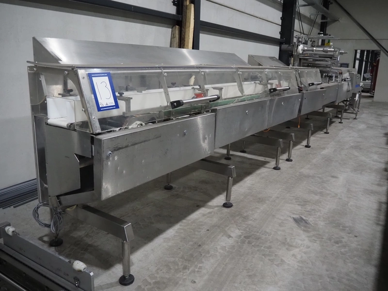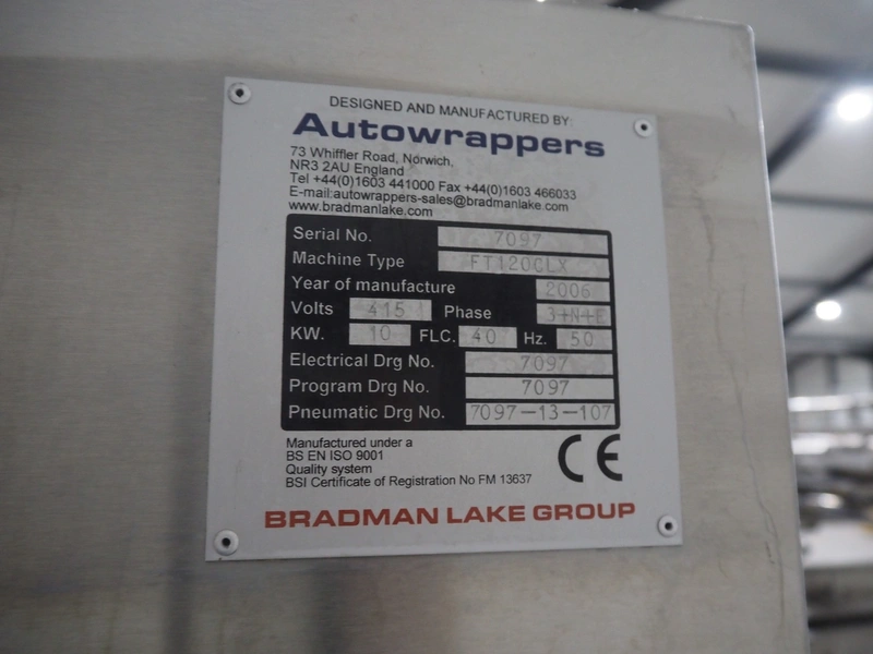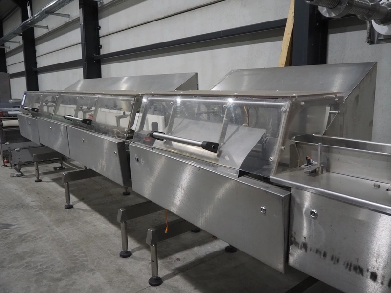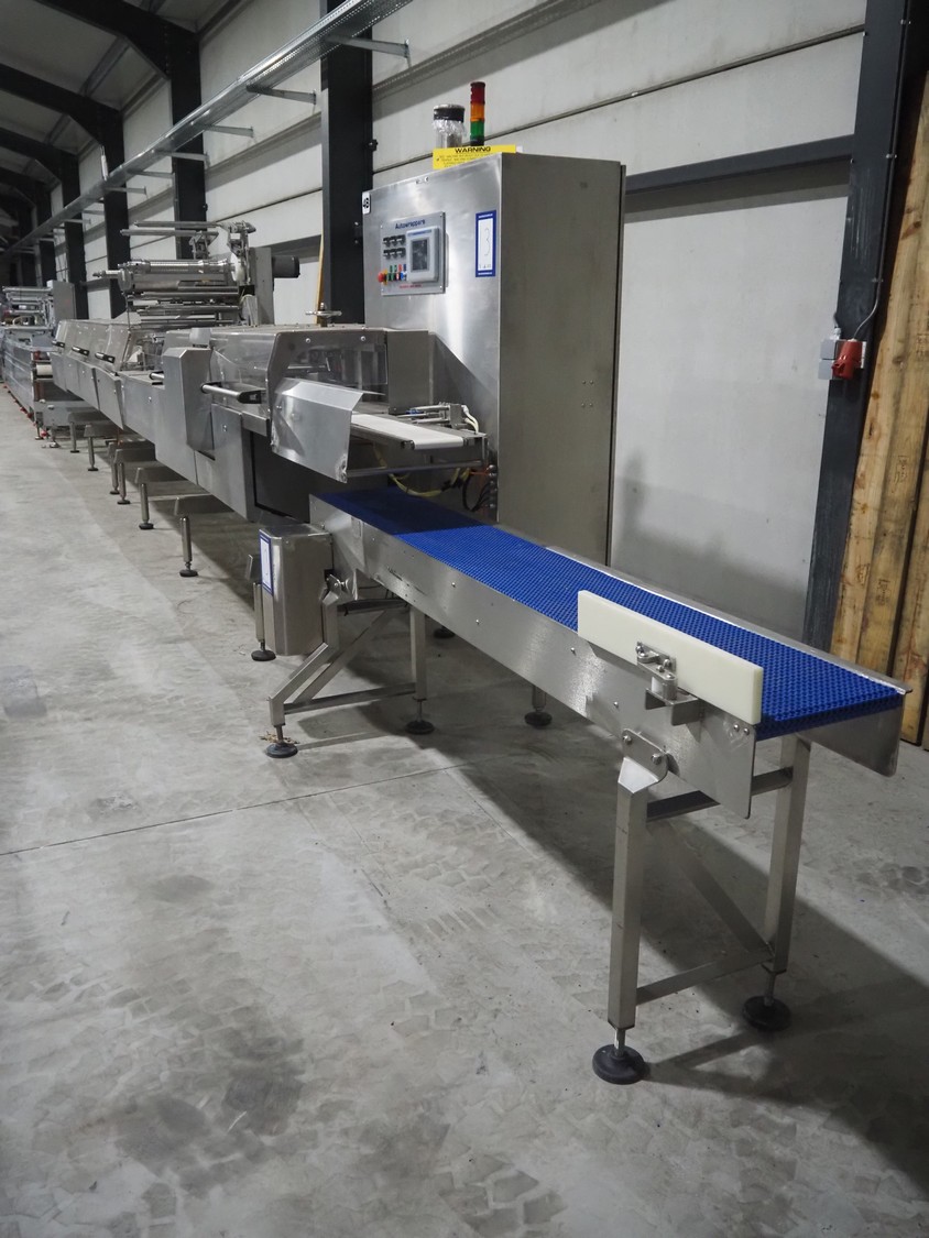 Bradman Lake Group dual feed flow packer, machine type: FT120CLX, serial number: 7098, year of construction: 2006, 415 V, 3 Ph, 50 Hz, 10 kW, plastic belt with dividers, belt width: (2x) 40 mm, divider height: 35 mm, distance between dividers: 300 mm, seal width: 230 mm, total dimensions: 5750 mm x 1200 mm x 2500 mm. Including infeed and outfeed belt, plastic infeed belt , belt width: 160 mm, total dimension: 3500 mm x 980 mm x 1550 mm. plastic outfeed belt, plastic mesh belt, belt width: 300 mm, total dimensions: 2600 mm x 600 mm x 1250 mm.