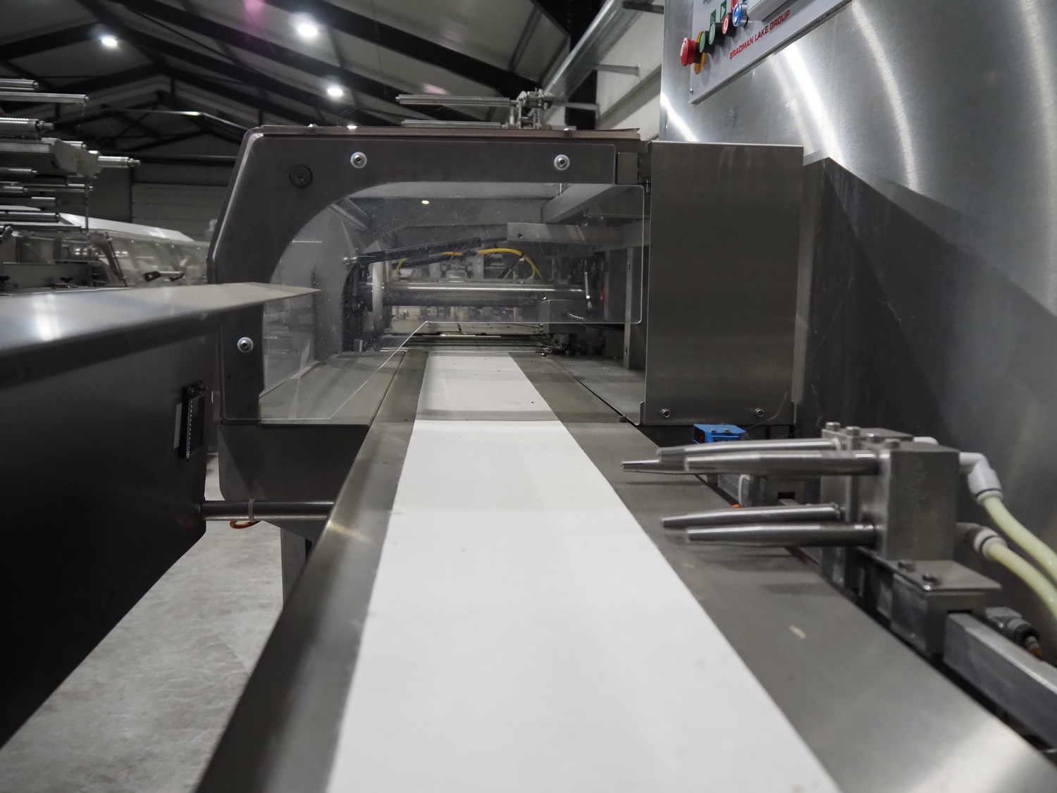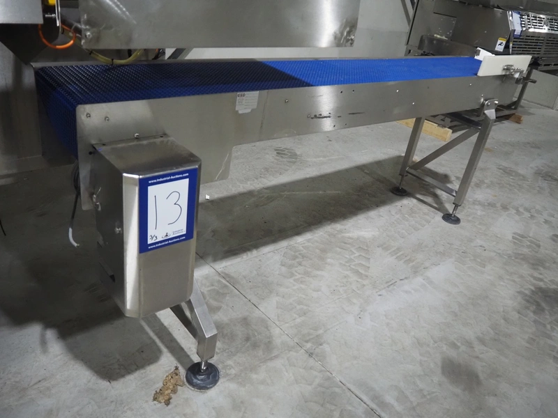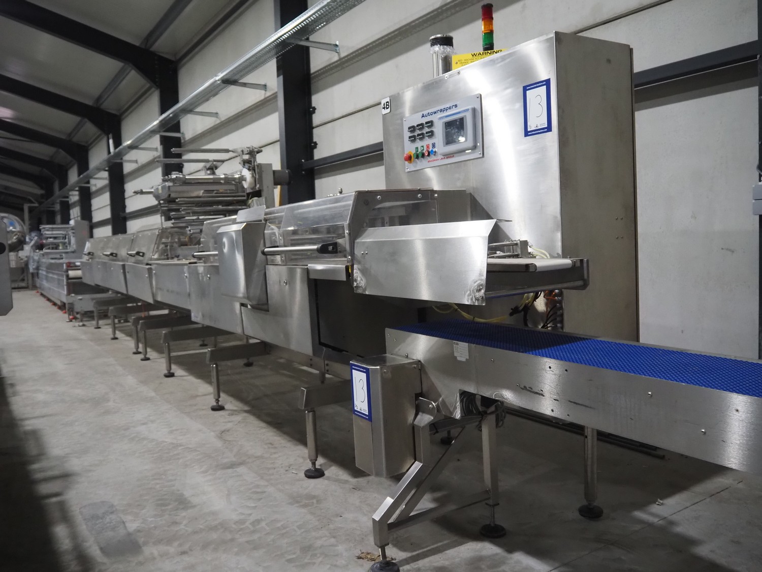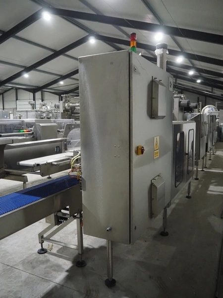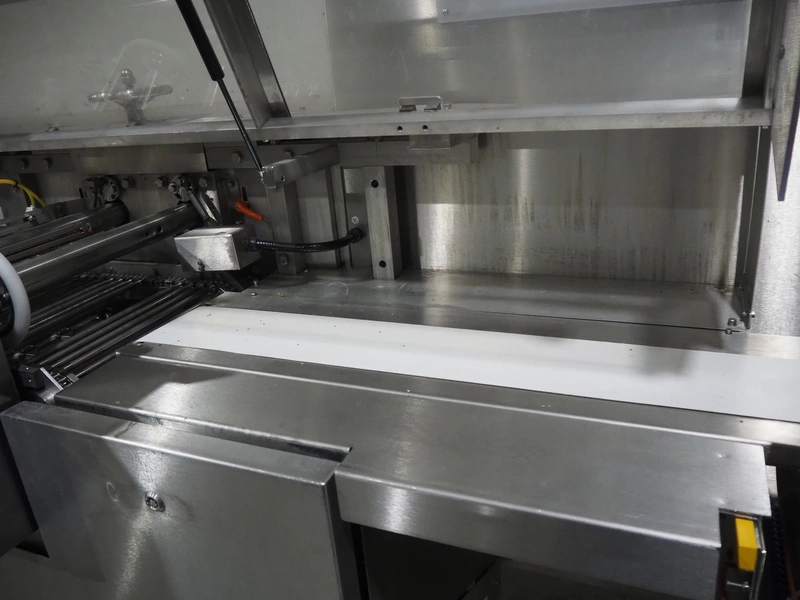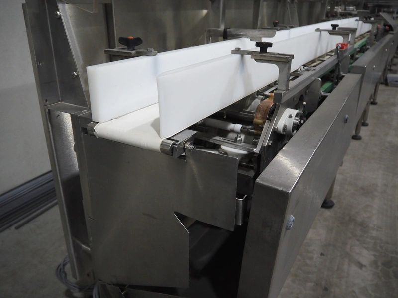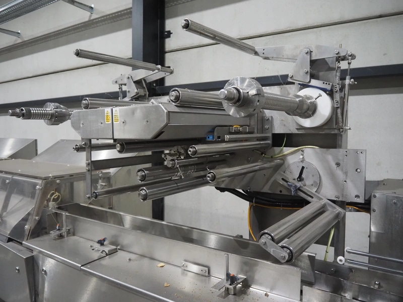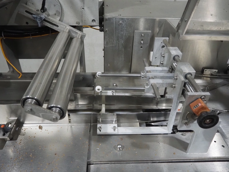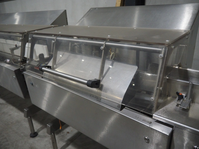 Bradman Lake Group dual feed flow packer, machine type: FT120CLX, serial number: 7098, year of construction: 2006, 415 V, 3 Ph, 50 Hz, 10 kW, plastic belt with dividers, belt width: (2x) 40 mm, divider height: 35 mm, distance between dividers: 300 mm, seal width: 230 mm, total dimensions: 5750 mm x 1200 mm x 2500 mm. Including infeed and outfeed belt, plastic infeed belt , belt width: 160 mm, total dimension: 3500 mm x 980 mm x 1550 mm. plastic outfeed belt, plastic mesh belt, belt width: 300 mm, total dimensions: 2600 mm x 600 mm x 1250 mm.