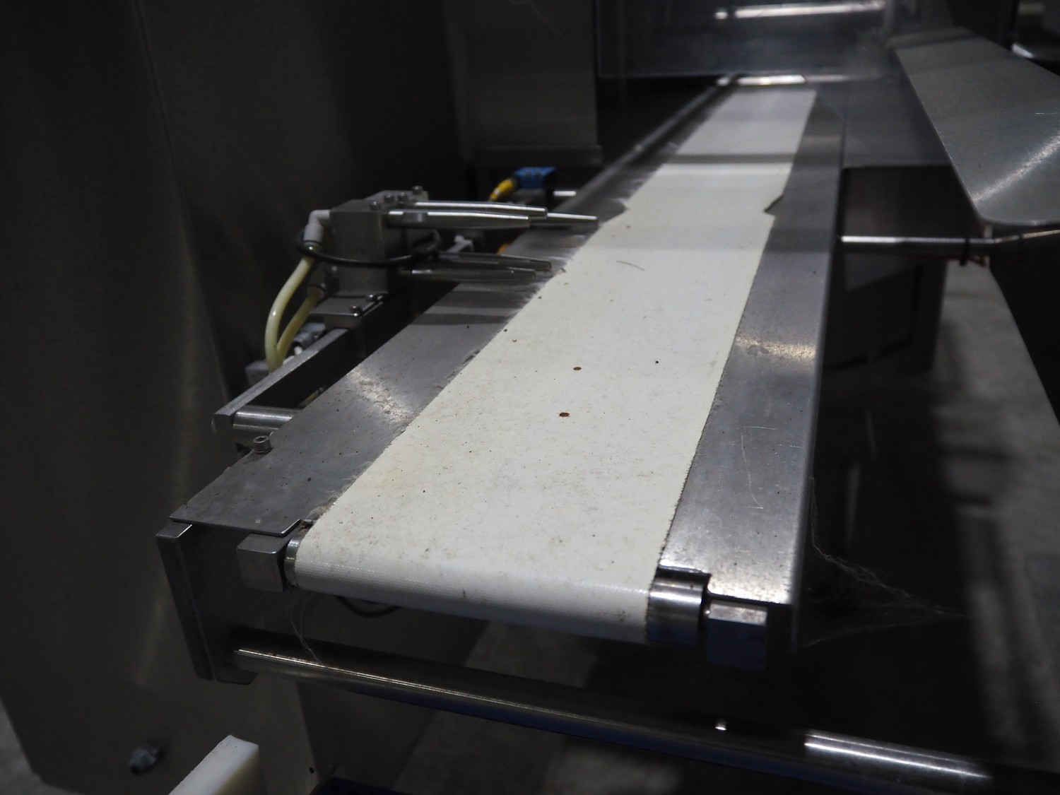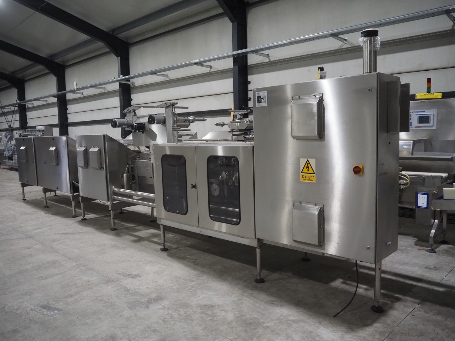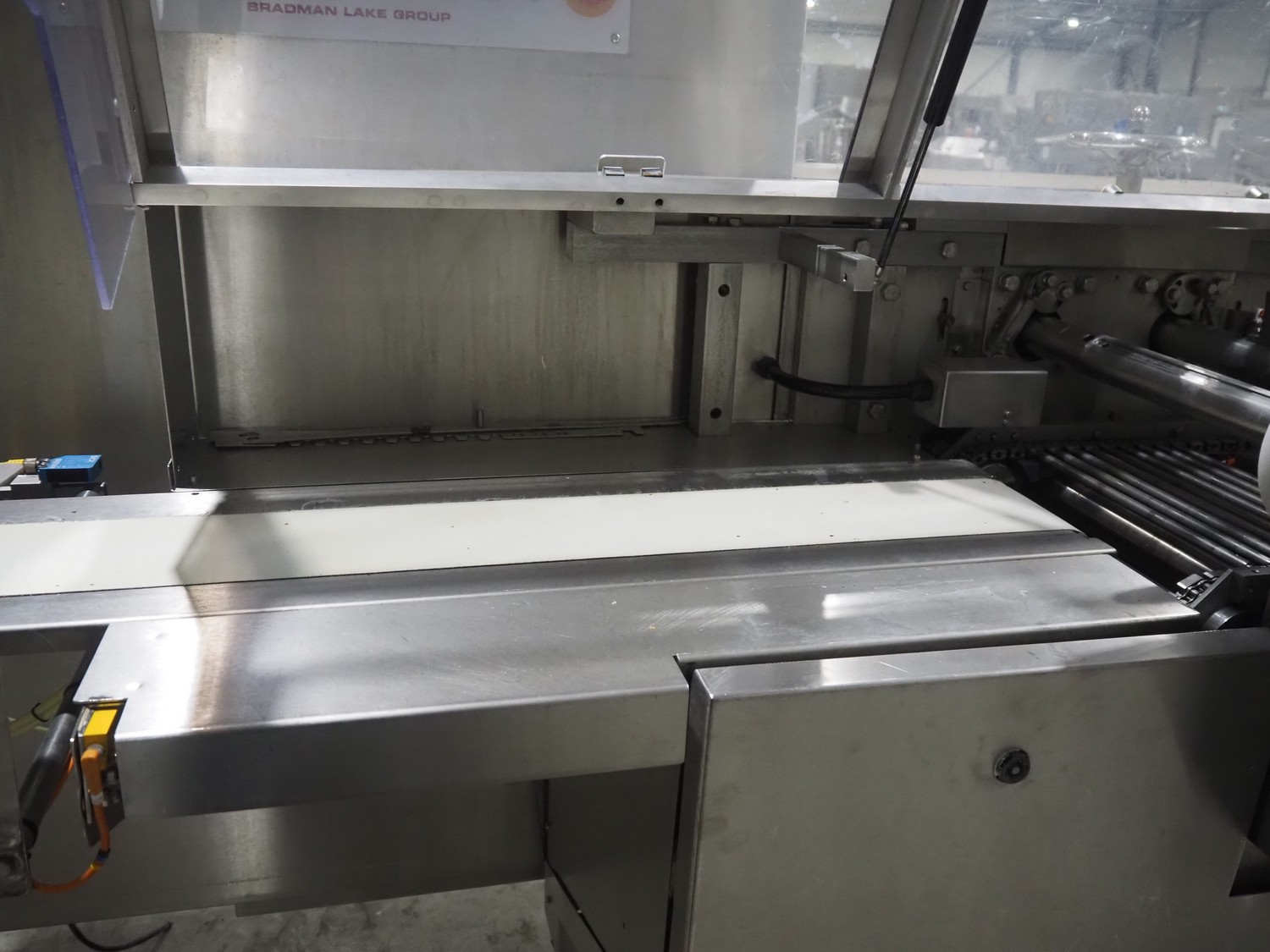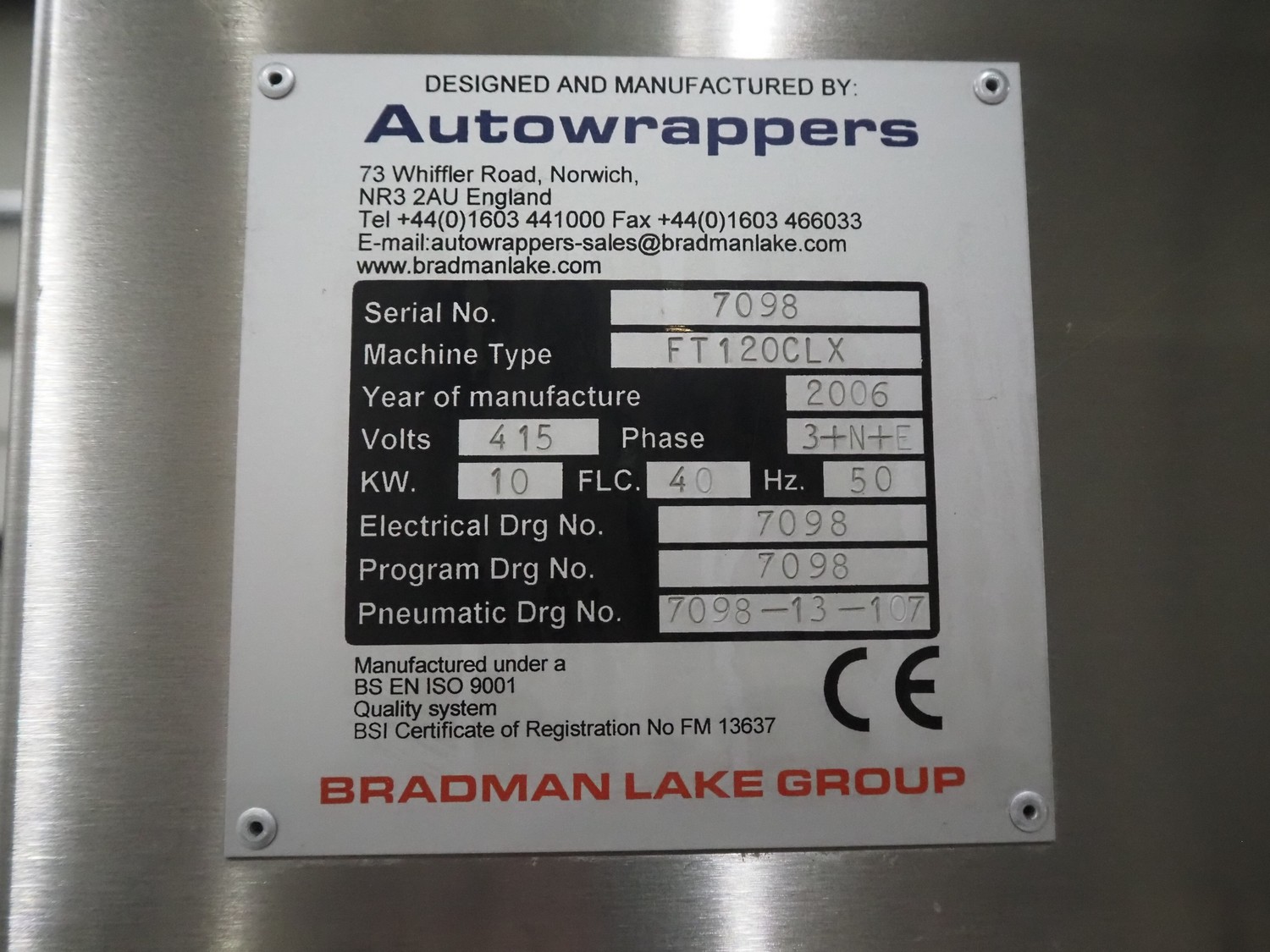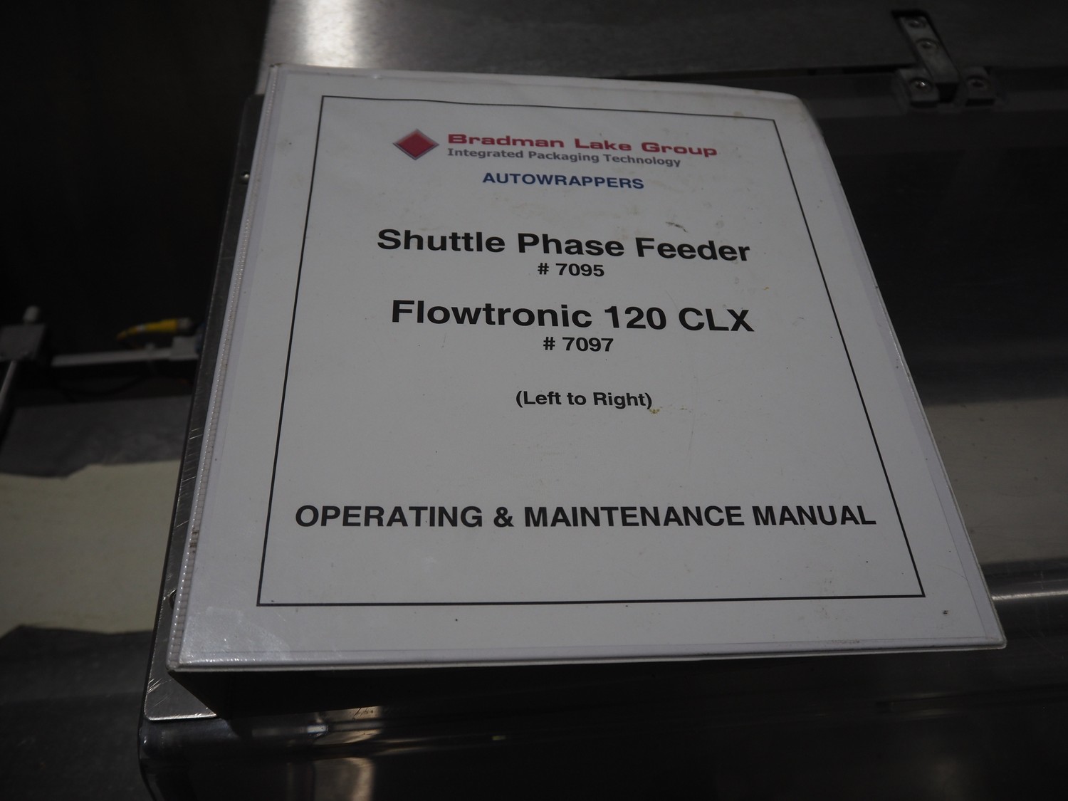 Bradman Lake Group dual feed flow packer, machine type: FT120CLX, serial number: 7097, year of construction: 2006, 415 V, 3 Ph, 50 Hz, 10 kW, plastic infeed belt with dividers, belt width: (2x) 40 mm, divider height: 35 mm, distance between dividers: 300 mm, seal width: 230 mm, total dimensions: 5750 mm x 1200 mm x 2500 mm. Including infeed and outfeed belt, plastic mesh infeed belt, 160 mm, total dimensions: 3500 mm x 980 mm x 1550 mm. Plastic outfeed belt, belt width: 300 mm, total dimensions: 2600 mm x 600 mm x 1250 mm.