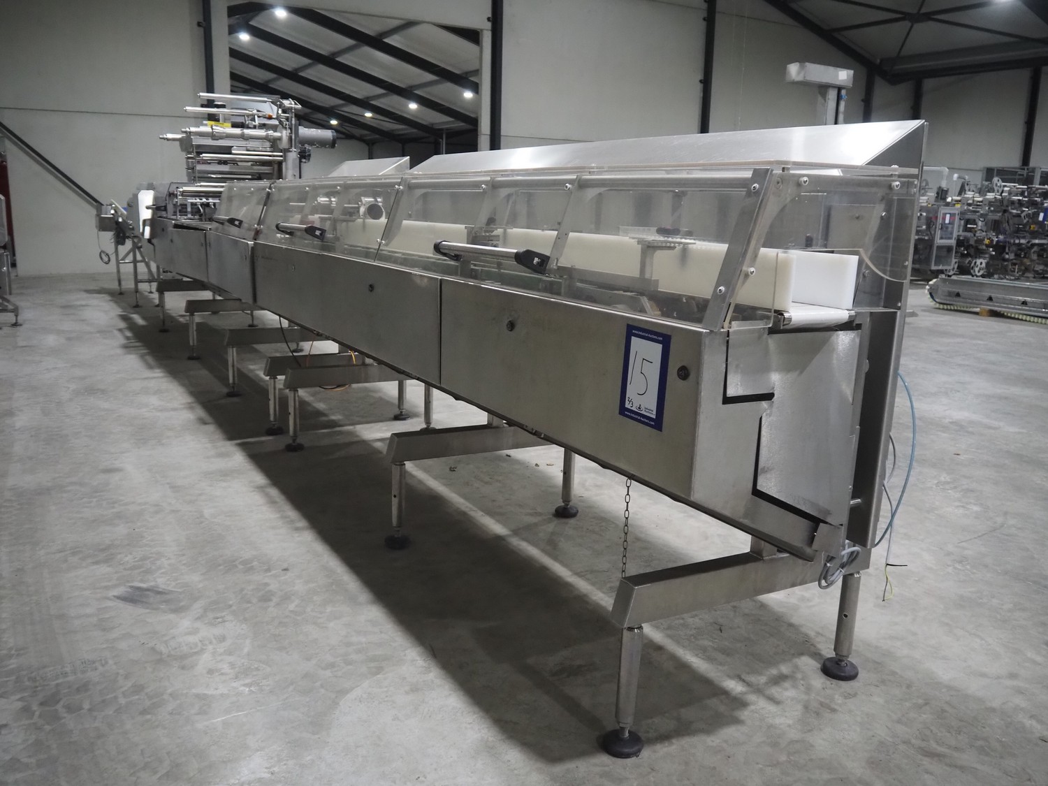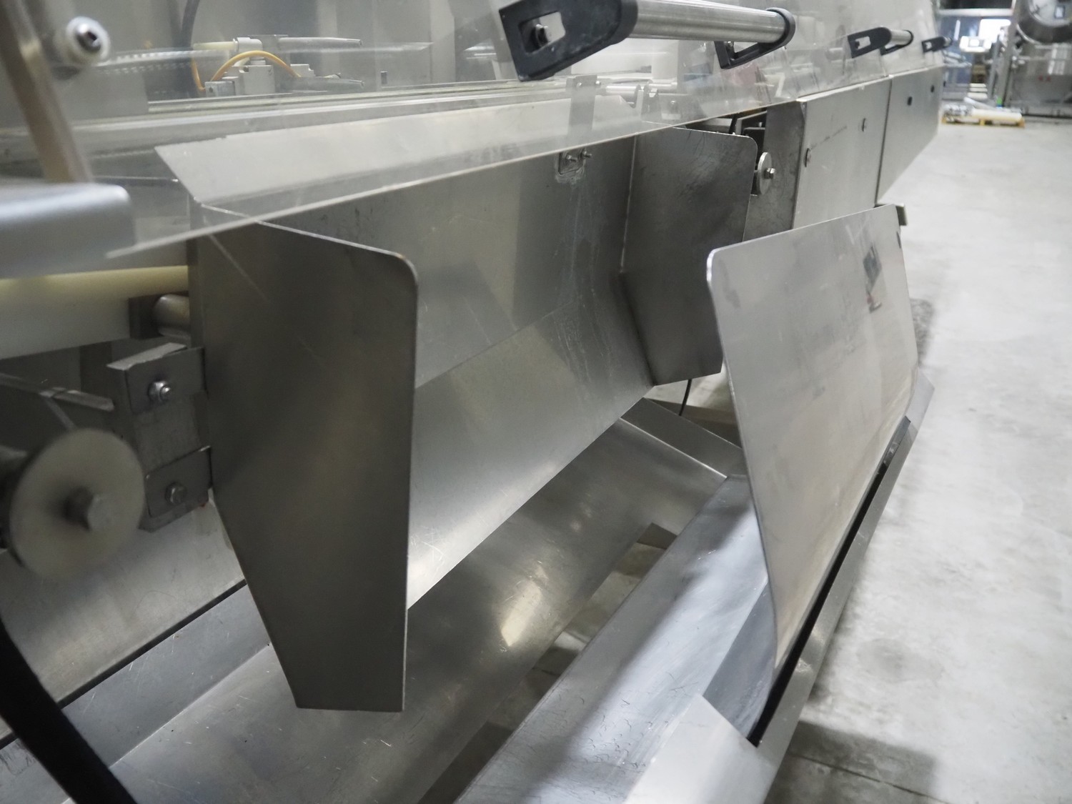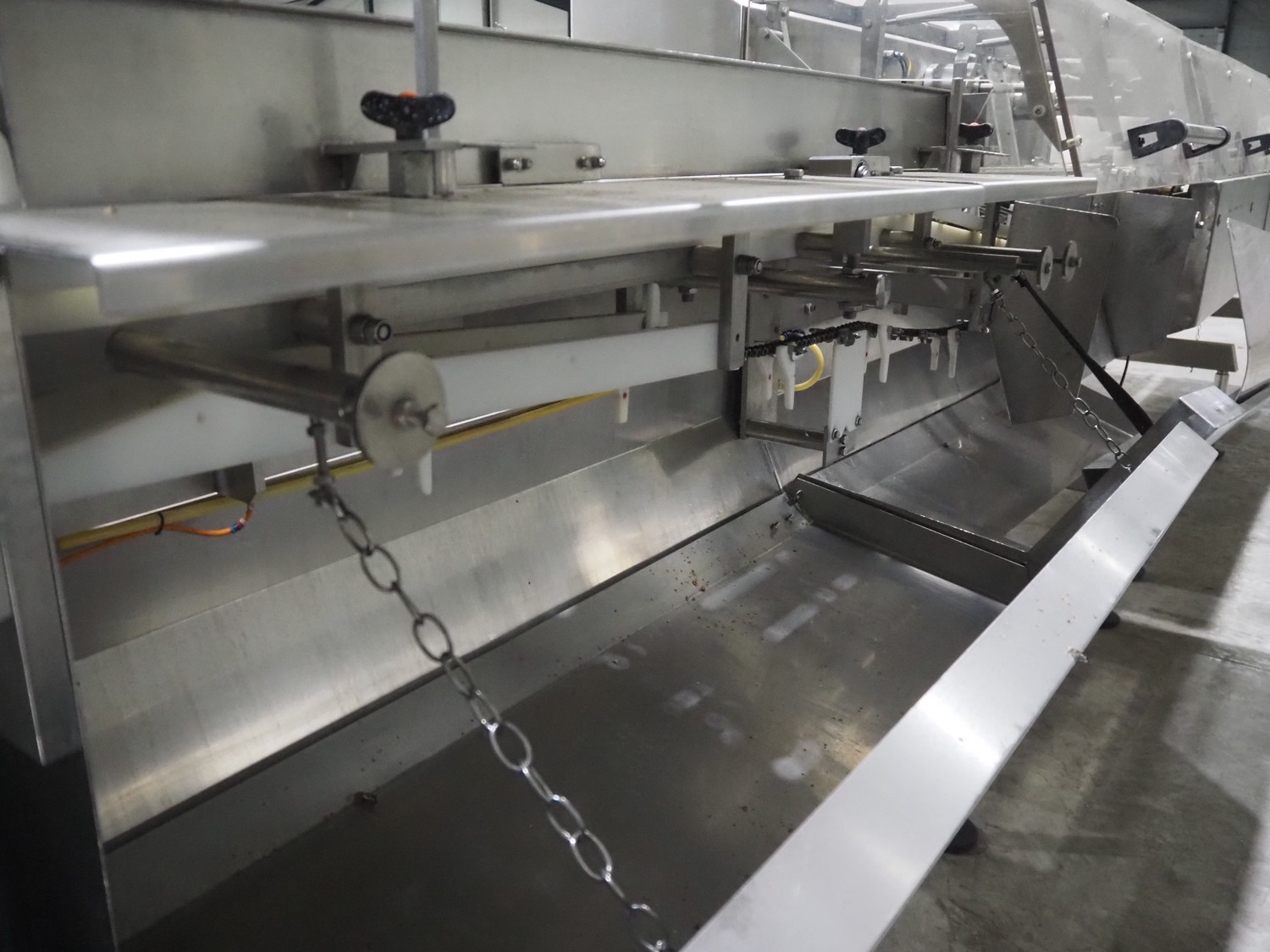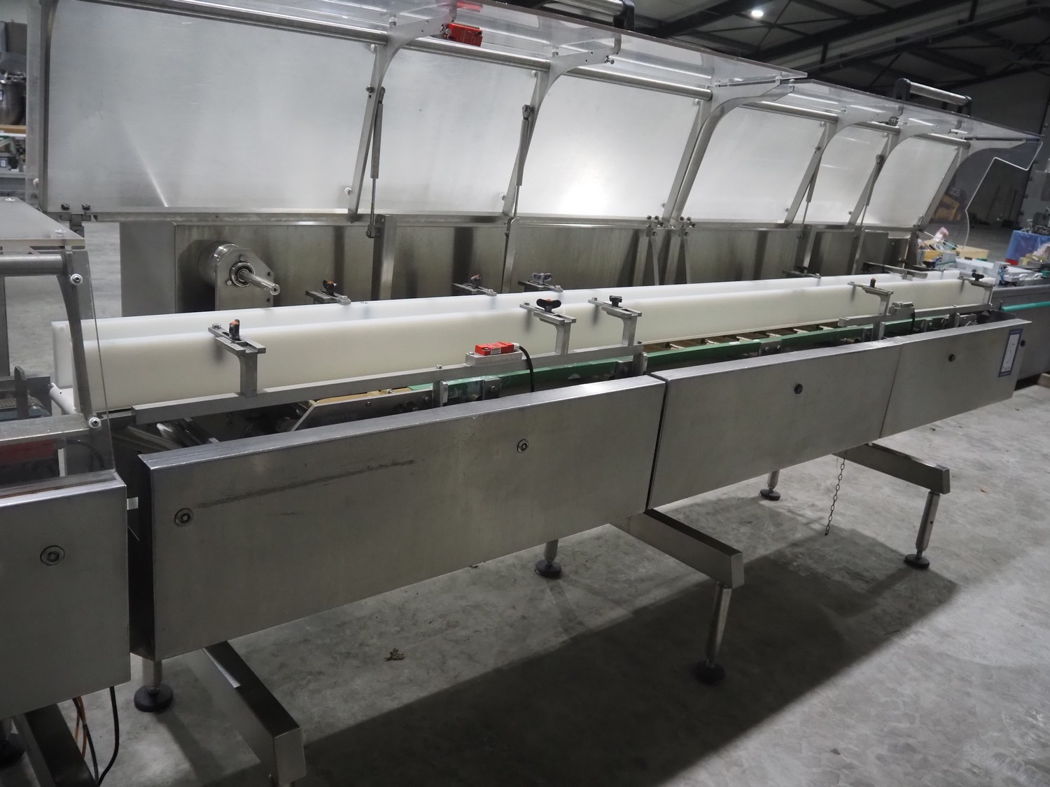 Bradman Lake Group dual feed flow packer, machine type: FT120CLX, serial number: 7097, year of construction: 2006, 415 V, 3 Ph, 50 Hz, 10 kW, plastic infeed belt with dividers, belt width: (2x) 40 mm, divider height: 35 mm, distance between dividers: 300 mm, seal width: 230 mm, total dimensions: 5750 mm x 1200 mm x 2500 mm. Including infeed and outfeed belt, plastic mesh infeed belt, 160 mm, total dimensions: 3500 mm x 980 mm x 1550 mm. Plastic outfeed belt, belt width: 300 mm, total dimensions: 2600 mm x 600 mm x 1250 mm.