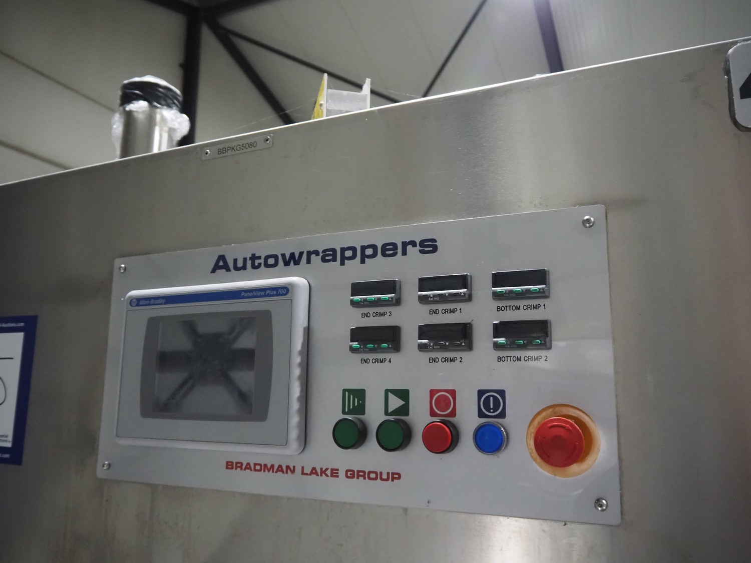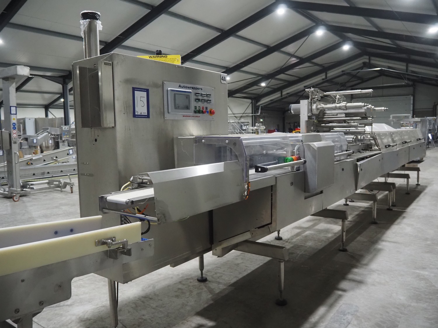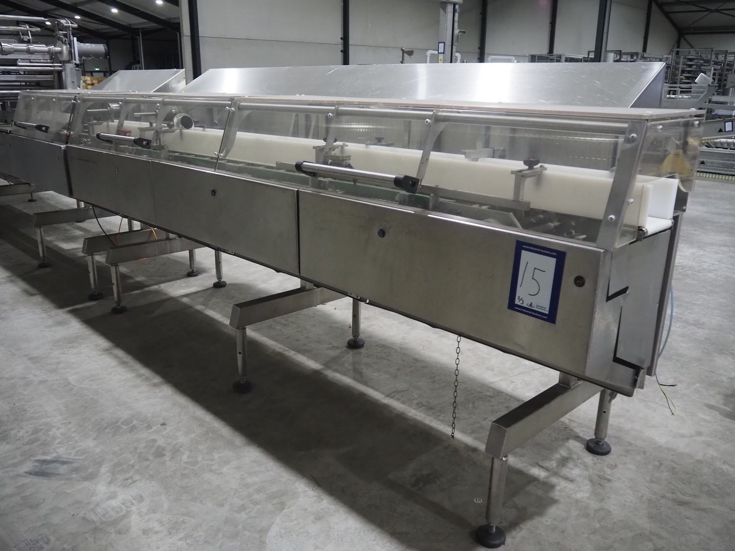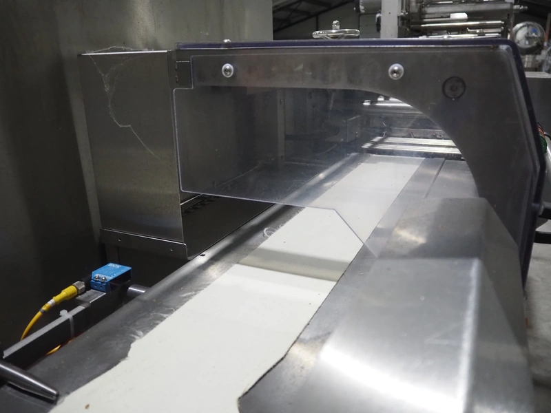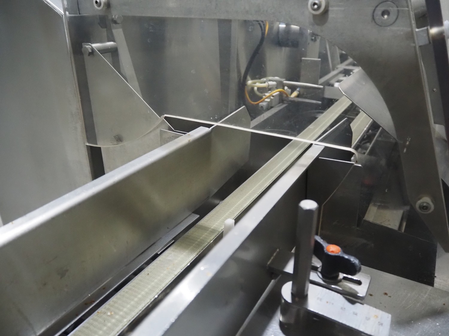 Bradman Lake Group dual feed flow packer, machine type: FT120CLX, serial number: 7097, year of construction: 2006, 415 V, 3 Ph, 50 Hz, 10 kW, plastic infeed belt with dividers, belt width: (2x) 40 mm, divider height: 35 mm, distance between dividers: 300 mm, seal width: 230 mm, total dimensions: 5750 mm x 1200 mm x 2500 mm. Including infeed and outfeed belt, plastic mesh infeed belt, 160 mm, total dimensions: 3500 mm x 980 mm x 1550 mm. Plastic outfeed belt, belt width: 300 mm, total dimensions: 2600 mm x 600 mm x 1250 mm.