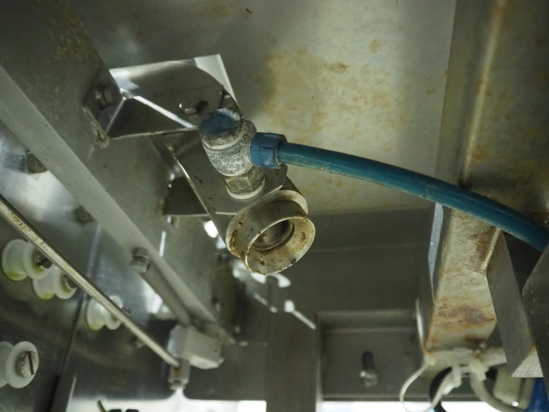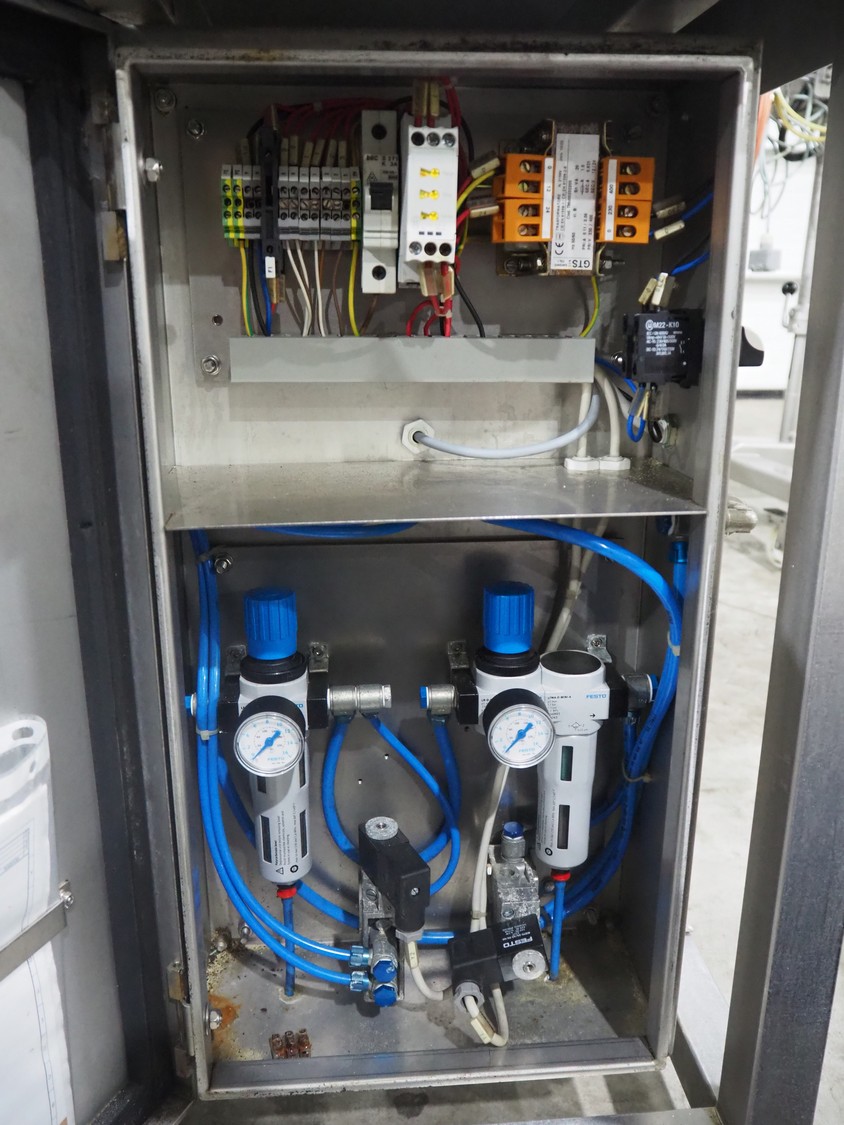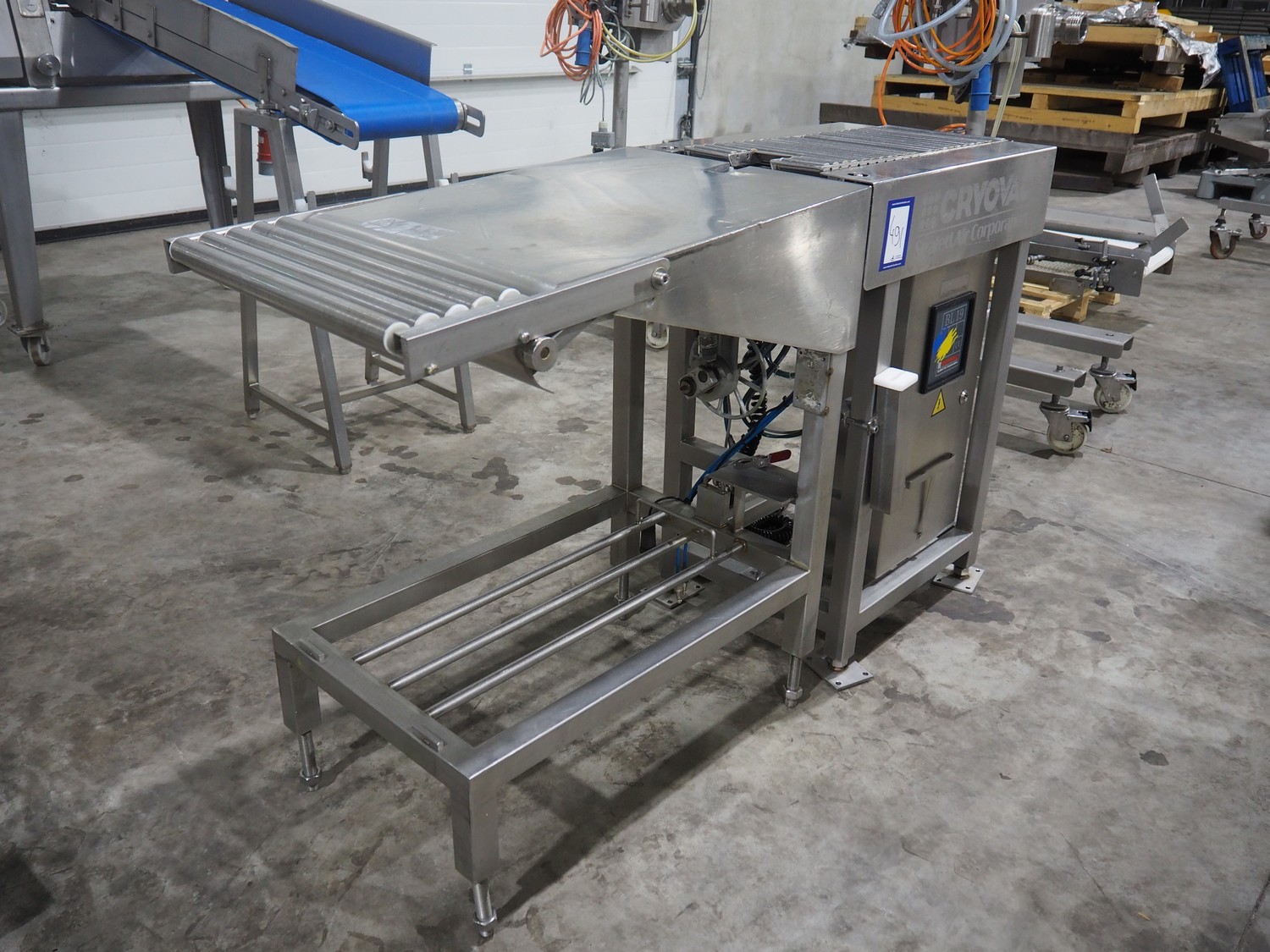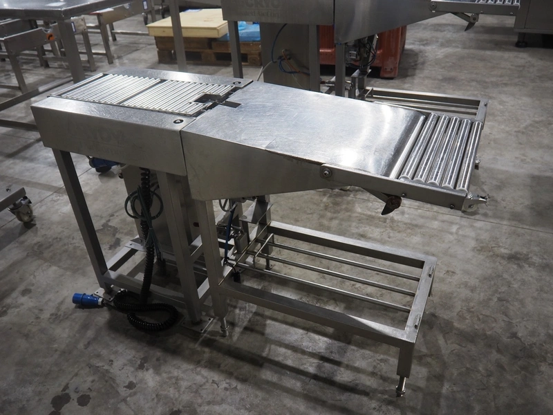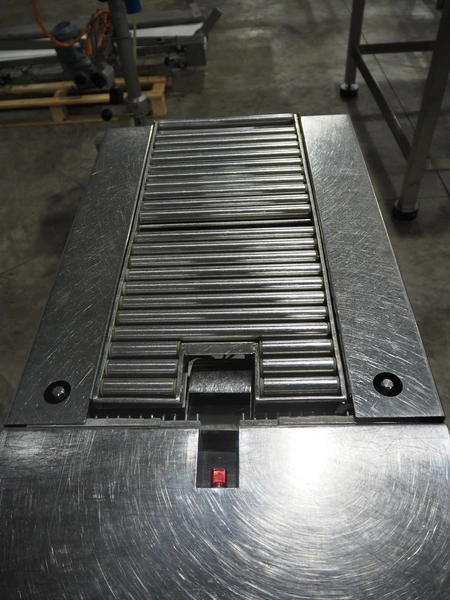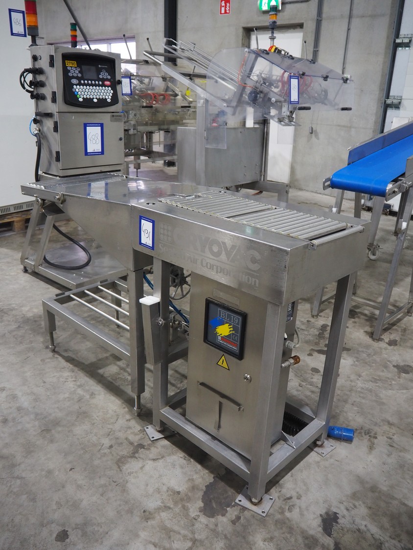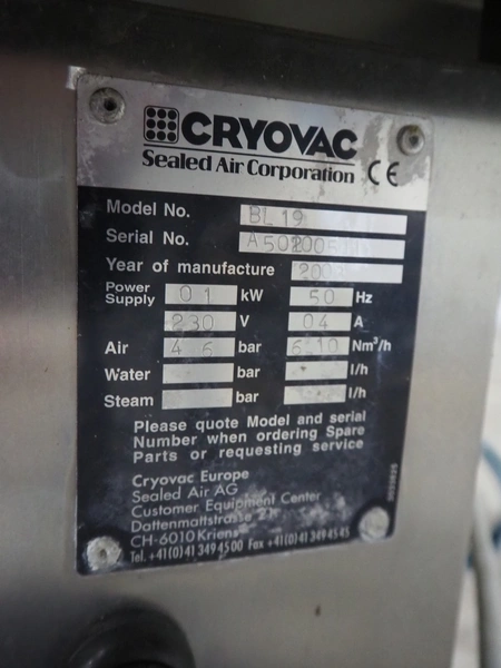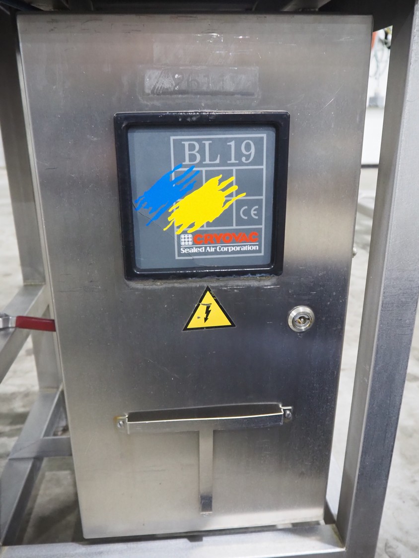 Cryovac bag blower, model: BL 19, serial number: A50200511, year of construction: 2003, 230 V, 50 Hz, 0.4 A, 0.1 kW, s/s rollers, roller width: 420 mm, 250 mm, total dimensions: 1400 mm x 520 mm x 900 mm.