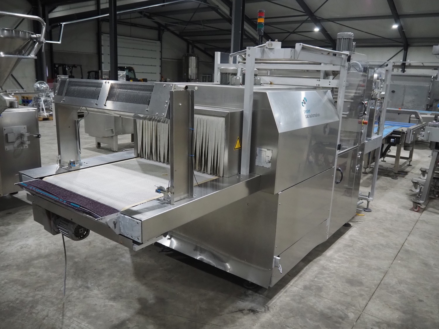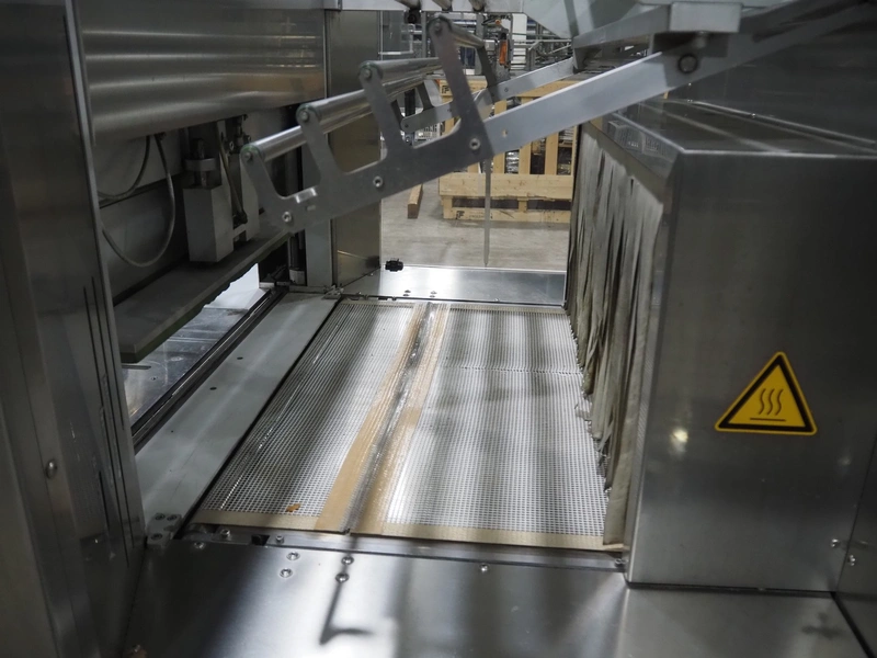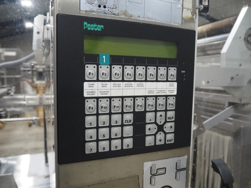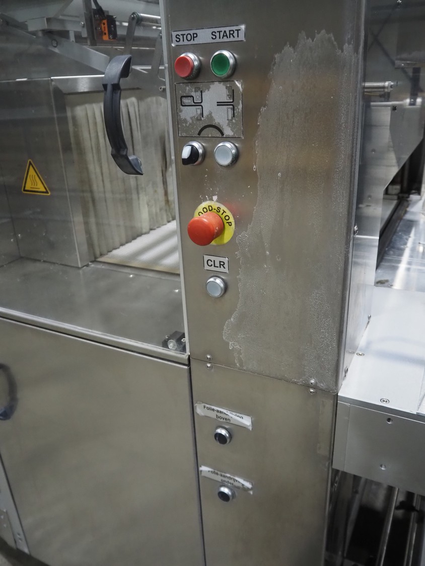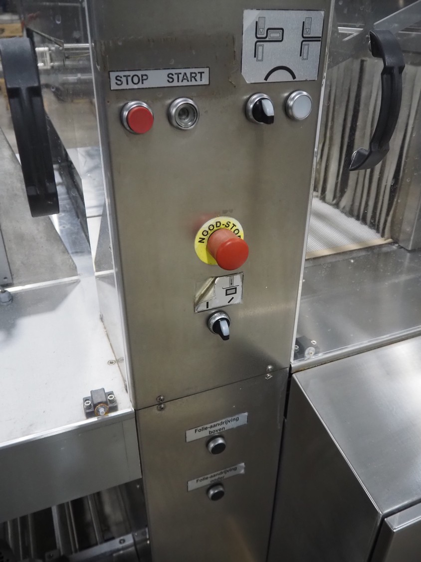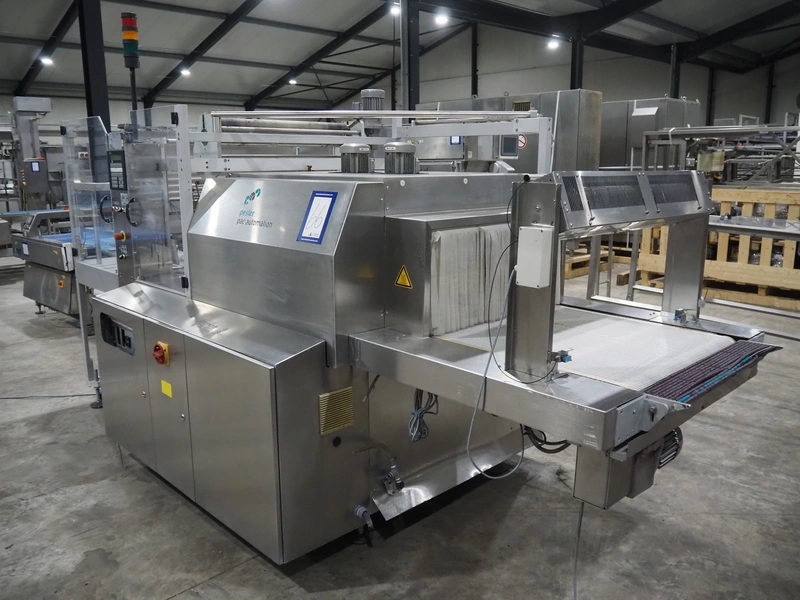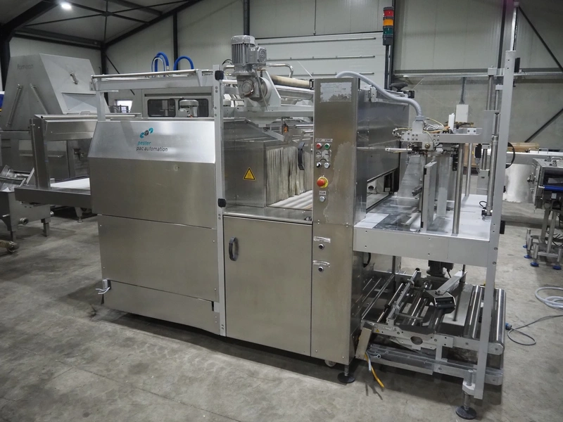 Pester Pac Automation shrink wrap and seal machine, type: PEWO-pack 800/therm III 800 E, machine number: 10671A, year of construction: 2003, 3x400 V, 50 Hz, 25.5 A, 16.5 kW, plastic belt, belt width: 780 mm, clearance: 780 mm x 350 mm, seal length: 850, steel rollers: roller length: 845 mm, total dimensions: 3850 mm x 1650 mm x 2300 mm. Incomplete.