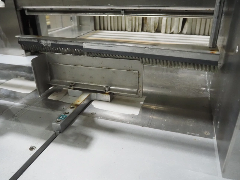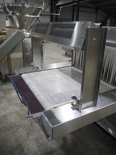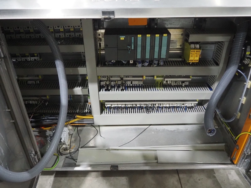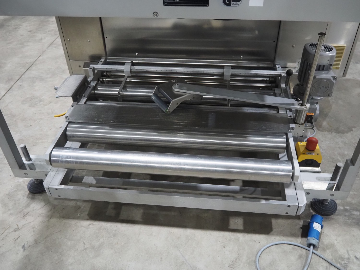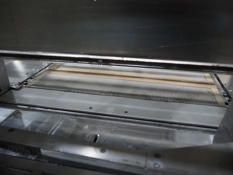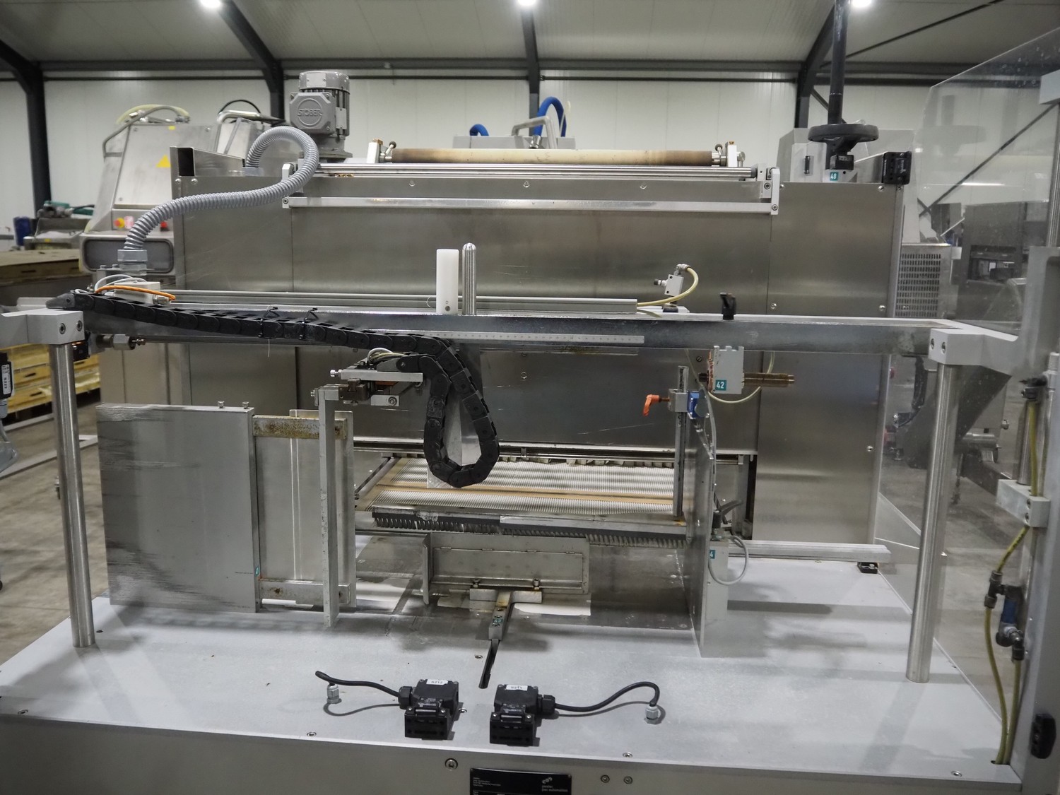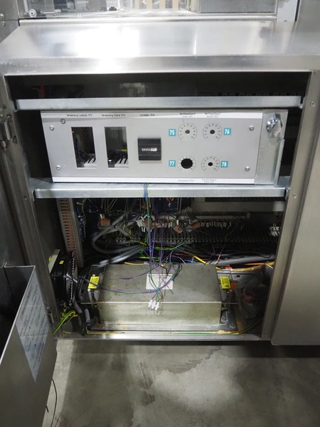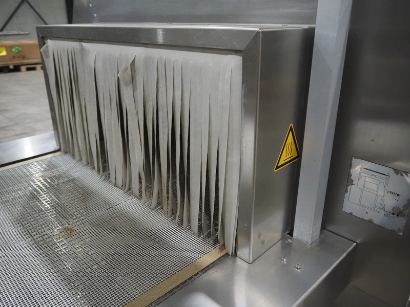 Pester Pac Automation shrink wrap and seal machine, type: PEWO-pack 800/therm III 800 E, machine number: 10671A, year of construction: 2003, 3x400 V, 50 Hz, 25.5 A, 16.5 kW, plastic belt, belt width: 780 mm, clearance: 780 mm x 350 mm, seal length: 850, steel rollers: roller length: 845 mm, total dimensions: 3850 mm x 1650 mm x 2300 mm. Incomplete.