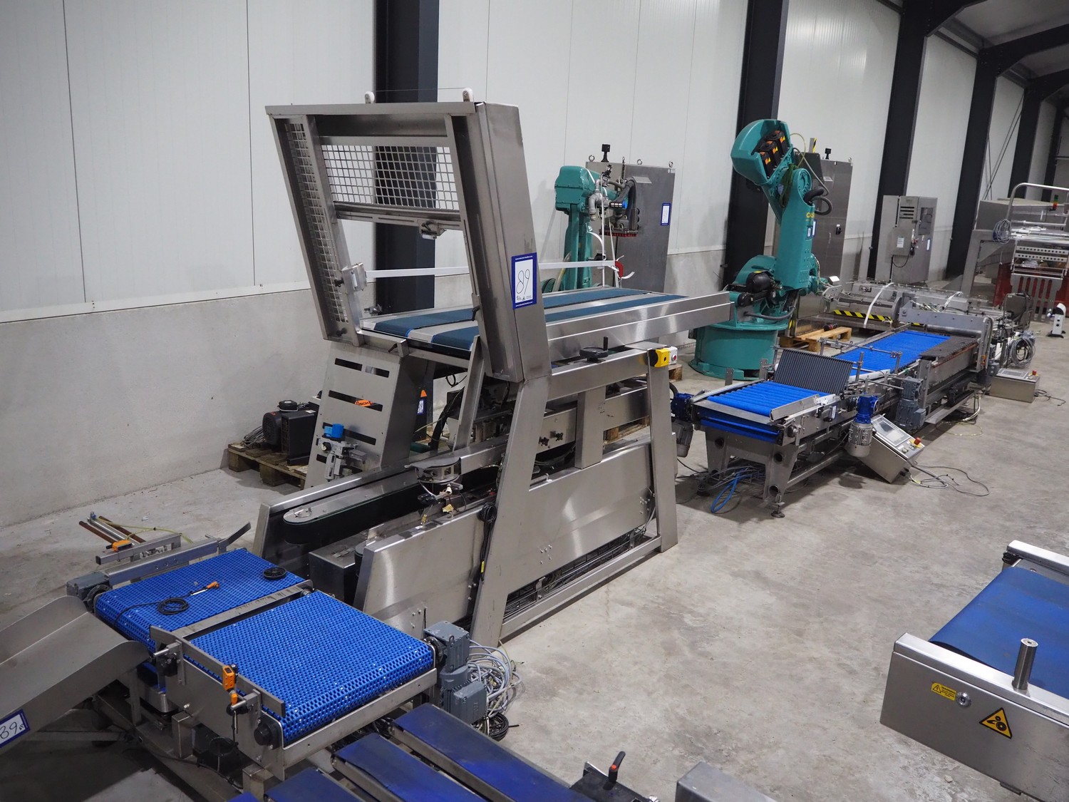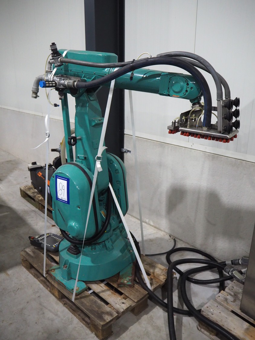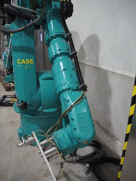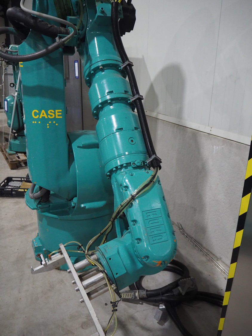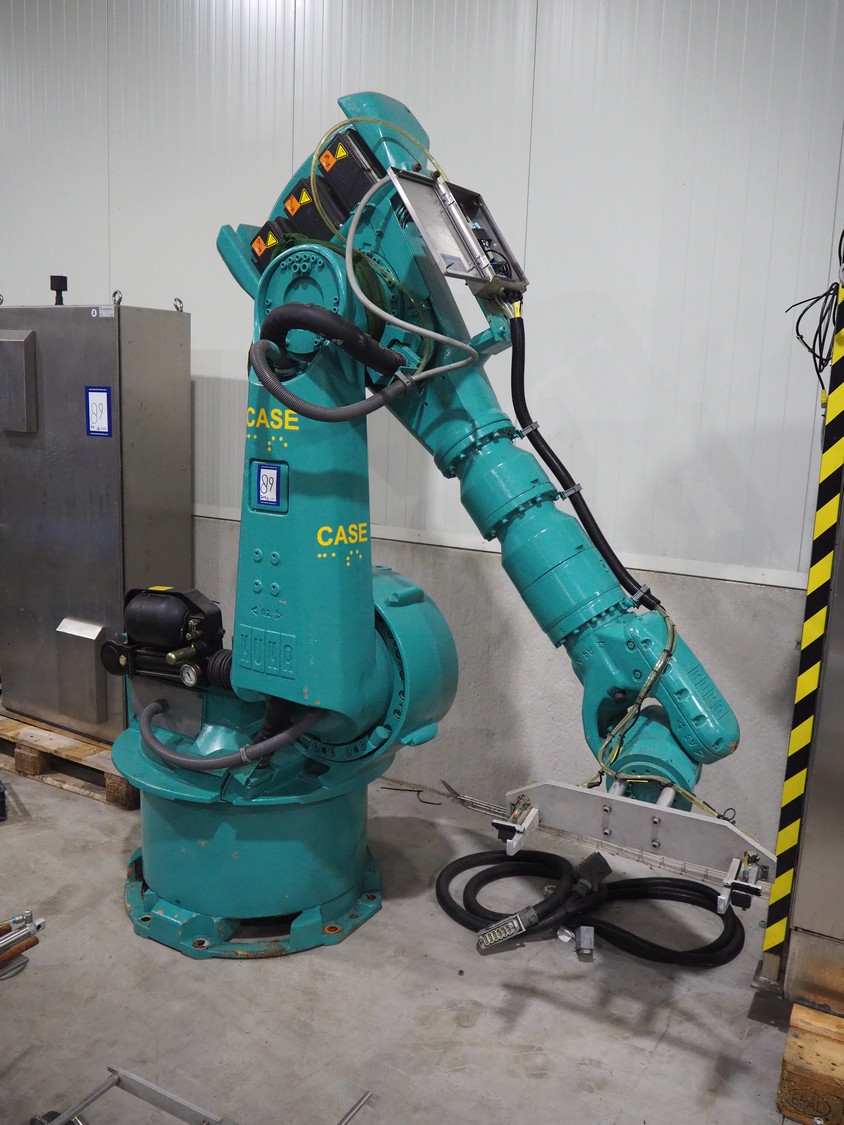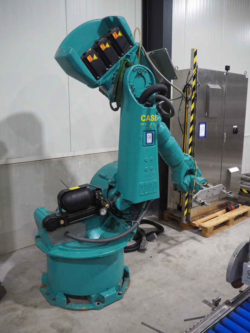 Kuka packaging robot, consisting of: Kuka robot, number: 991134623, 1600 mm x 800 mm x 1800 mm, ABB Robotics robot, dimensions: 2200 mm x 1100 mm x 2550 mm, 2 pallets with switch cabinets, dimensions: 1200 mm x 800 mm x 2250 mm, 1200 mm x 800 mm x 1950 mm, Busch pump, model: Mink MM 1144 BV, dimensions: 1200 mm x 800 mm x 650 mm, infeed conveyor, clearance: 285 mm, plastic belt, belt width: (2x) 200 mm, dimensions: 2850 mm x 1200 mm x 2100 mm, infeed belt, plastic mesh belt, belt width: 530 mm, total dimensions: 1650 mm x 1170 mm x 650 mm, roller conveyor, plastic rollers, roller width: 490 mm, total dimensions: 4150 mm x 1100 mm x 1000 mm, transport belt, coat belt, belt width: 545 mm, total dimensions: 1200 mm x 1150 mm x 1000 mm, pallet with racks, dimensions: 2300 mm x 1800 mm x 600 mm. Technical condition unknown.