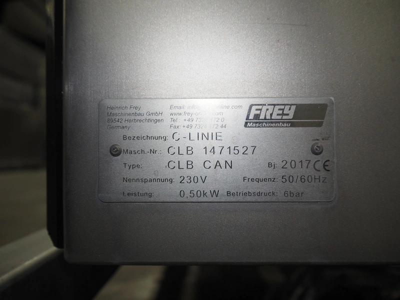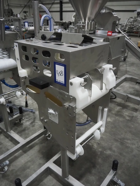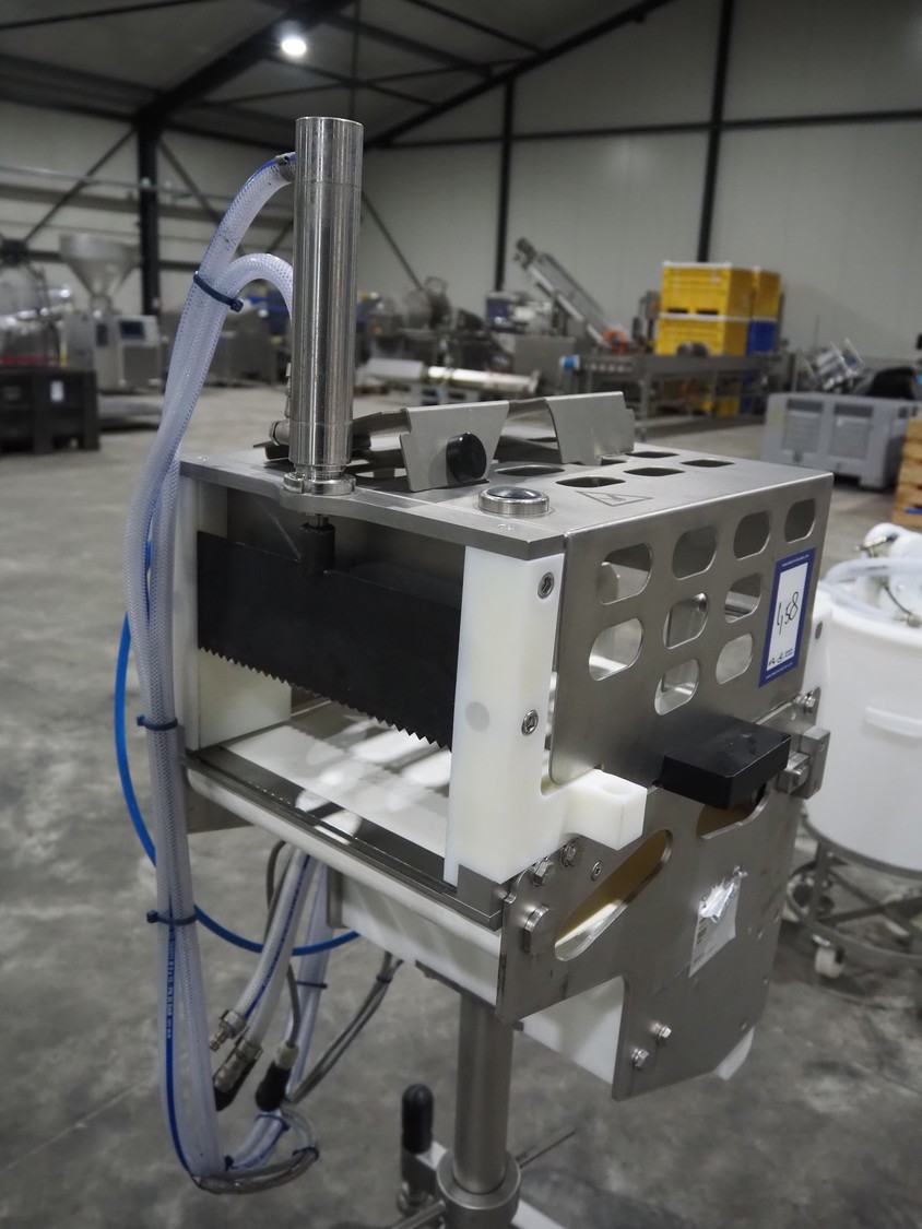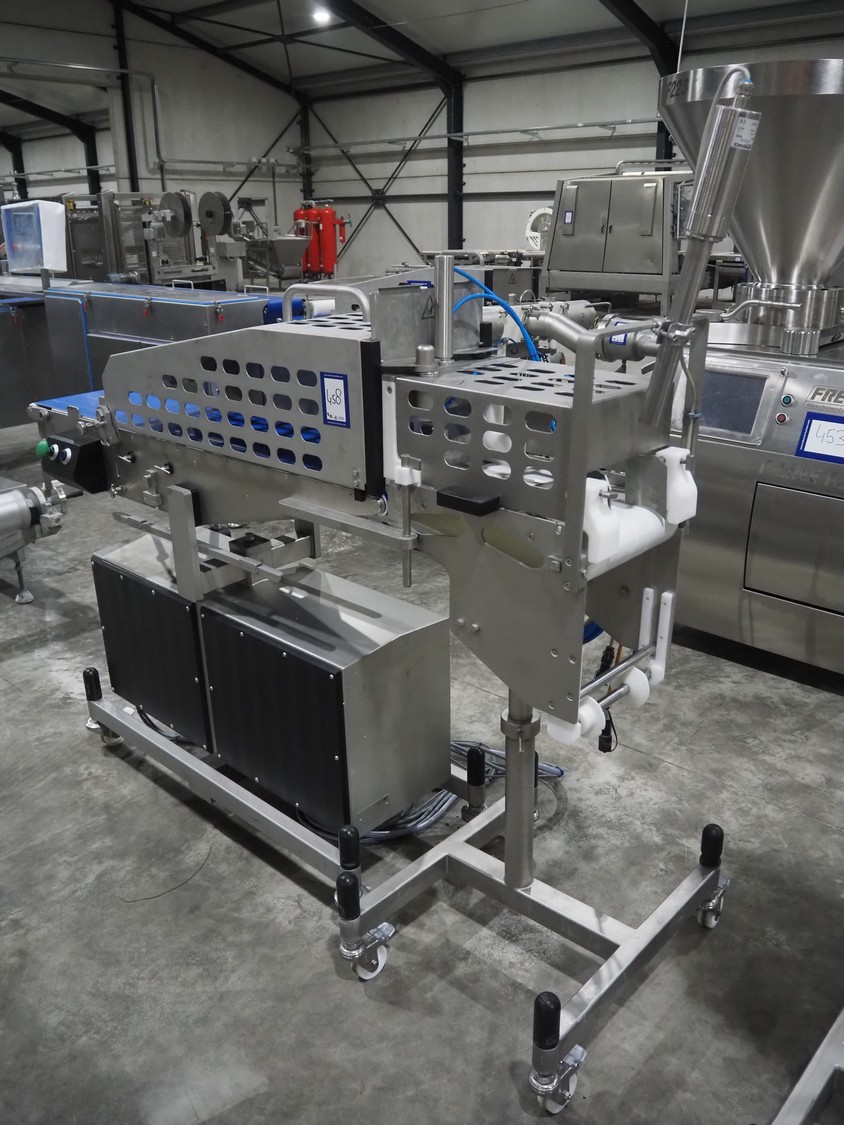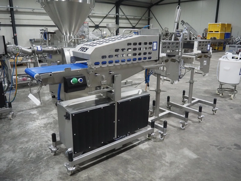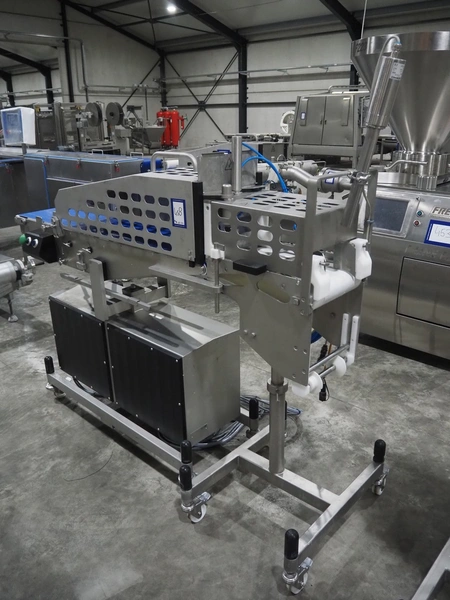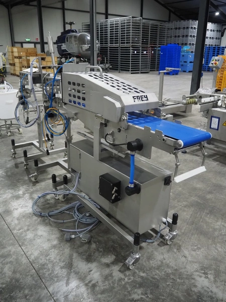Frey Maschinenbau GmbH mobile minced meat portioner, type: CLB CAN, machine number: CLB 1471527, year of construction: 2017, 230 V, 50/60 Hz, 0.50 kW, plastic belt, belt width: (2x) 300 mm, clearance: 300 mm x 70 mm, total dimensions: 2050 mm x 700 mm x 1750 mm. Including 2 mobile portioning devices, plastic belt, belt width: 300 mm, knife width: 235 mm, total dimensions: 680 mm x 550 mm x 1730 mm and 680 mm x 550 mm x 1470 mm.