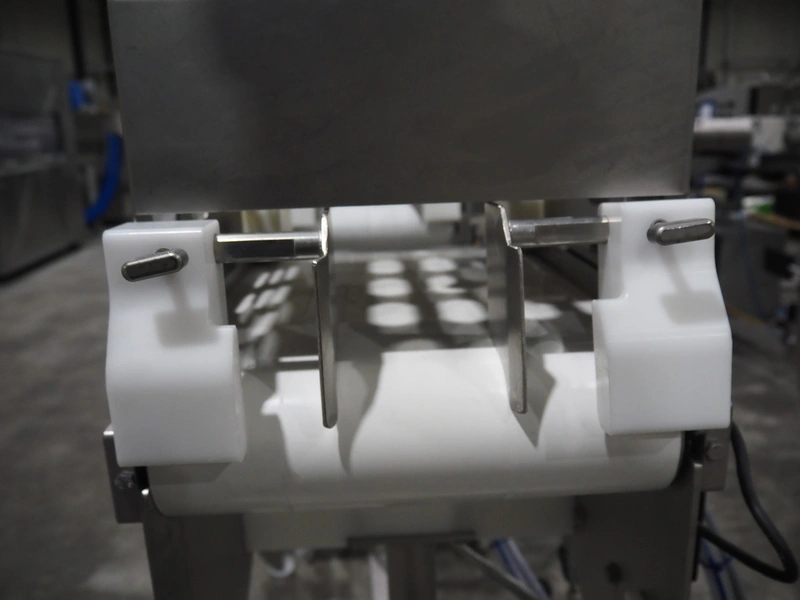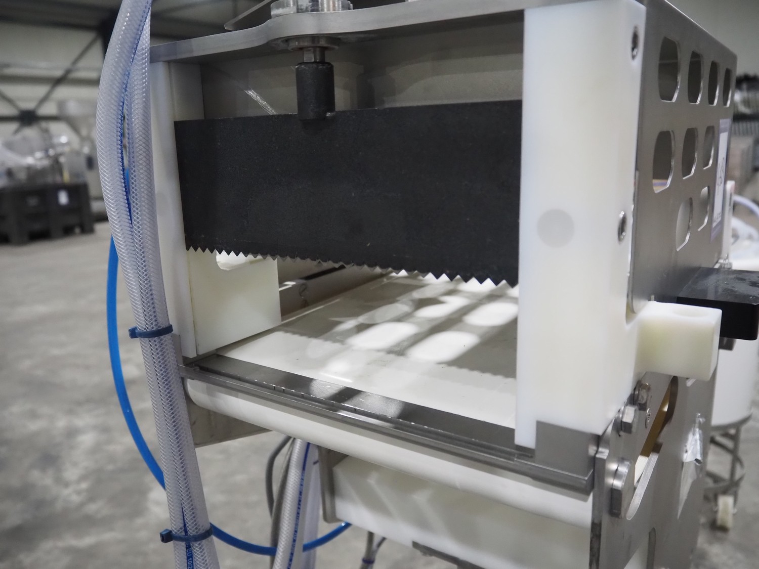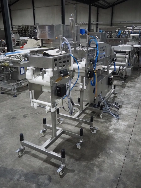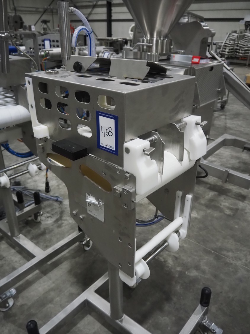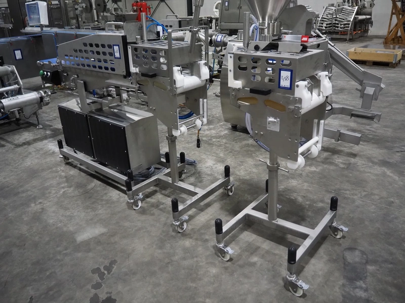 Frey Maschinenbau GmbH mobile minced meat portioner, type: CLB CAN, machine number: CLB 1471527, year of construction: 2017, 230 V, 50/60 Hz, 0.50 kW, plastic belt, belt width: (2x) 300 mm, clearance: 300 mm x 70 mm, total dimensions: 2050 mm x 700 mm x 1750 mm. Including 2 mobile portioning devices, plastic belt, belt width: 300 mm, knife width: 235 mm, total dimensions: 680 mm x 550 mm x 1730 mm and 680 mm x 550 mm x 1470 mm.