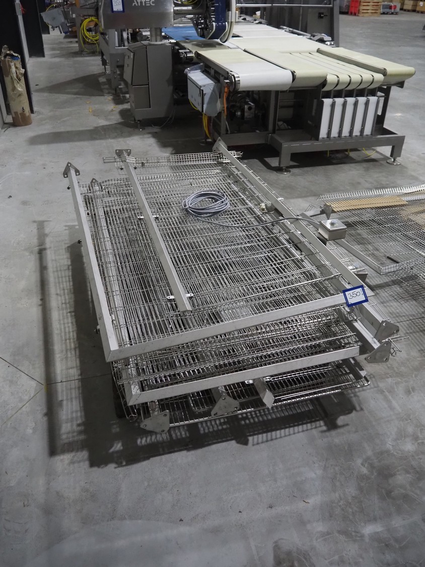 Attec Food Technology fully automatic pig cutting line consisting of: steel hanging line, dimensions: 6500 mm x 400 mm x 1700, Attec automatic primal cutting line, type: AGOL-850, order number: ON17163, year of construction: 2015, 400 V, 3 Ph, 50 Hz, 45 kW, capacity: 800 pigs/hr, product: pork carcasses, left & right, s/s outfeed belt for waste pork legs, belt width: 290 mm, automatic measuring system for precise and individual cuts of individual pork carcass, plastic belt, belt width: 800 mm, 1300 mm, 500 mm, 300 mm, 100 mm and s/s protection fence, total dimensions: 9800 mm x 4200 mm x 2200 mm. Line is never used.