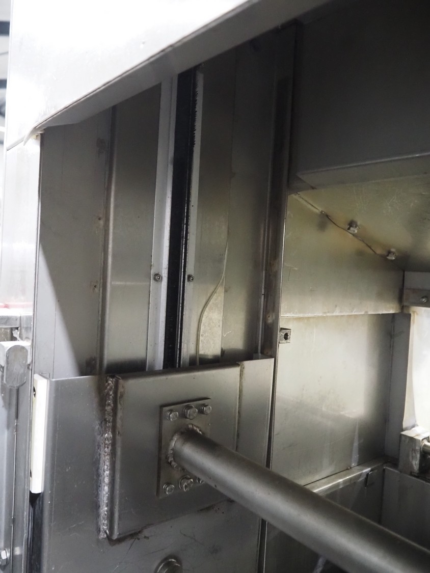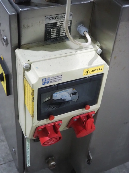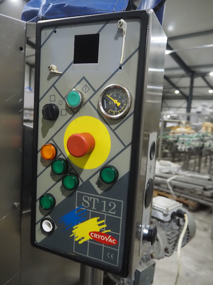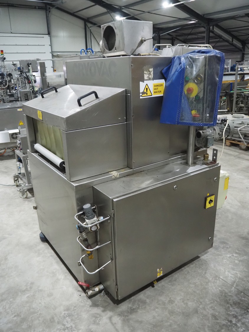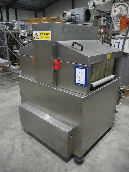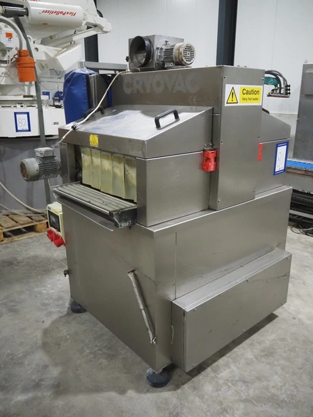 Cryovac dip tank, model number: ST12 ELH, serial number: A51500108, year of construction: 1997, 380/415 V, 50 Hz, 51 A, 6 bar, s/s mesh belt, belt width: 600 mm, clearance: 650 mm x 230 mm, total dimensions: 1300 mm x 1250 mm x 1600 mm.