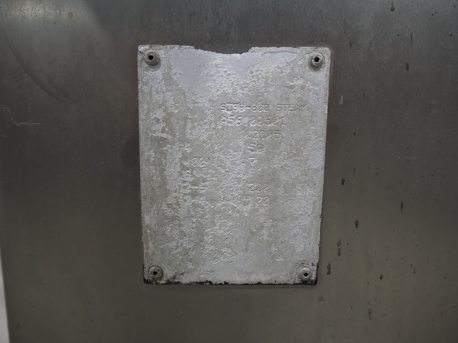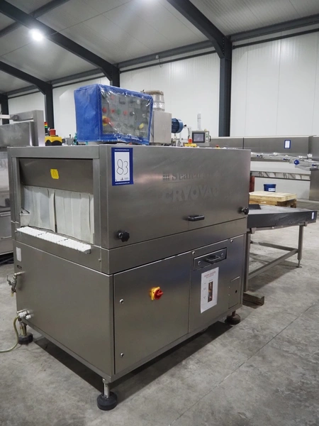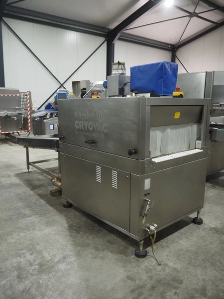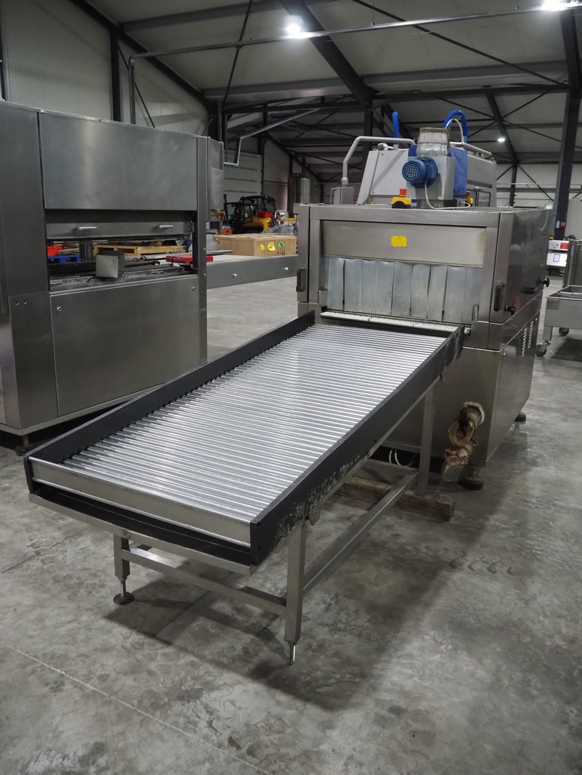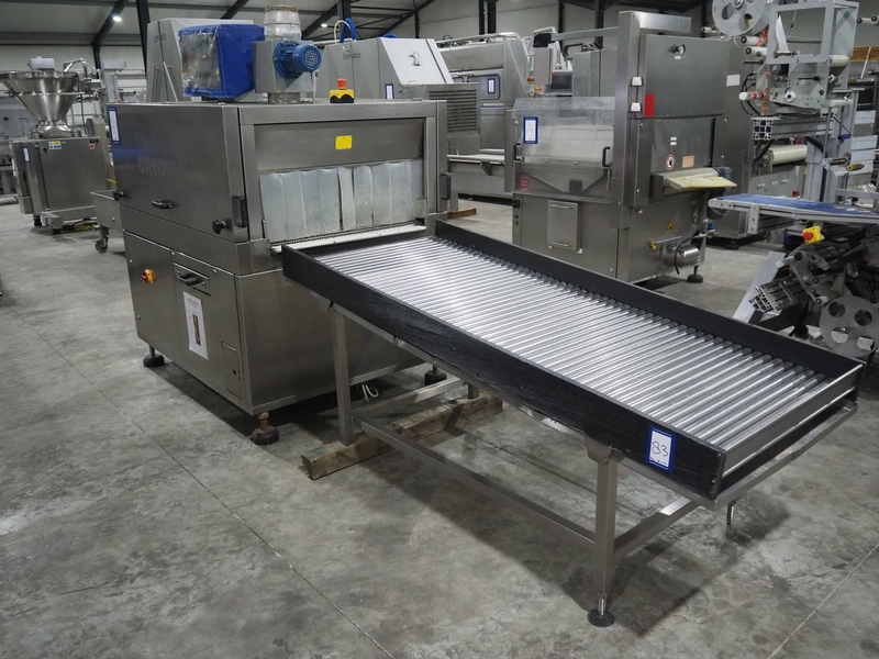 Cryovac shrink tunnel, model number: ST98-800 STEAM, serial number: A56122511, year of construction: 2005, belt width: 870 mm, clearance: 800 mm x 300 mm, total dimensions: 1500 mm x 1200 mm x 1900 mm. Including outfeed roller conveyor, s/s rollers, roller width: 800 mm, total dimensions roller conveyor: 2000 mm x 850 mm x 940 mm.