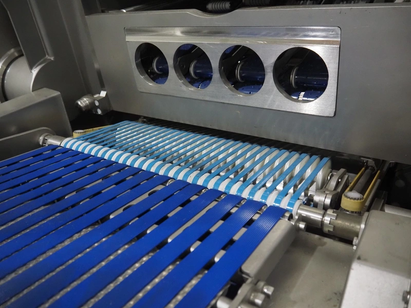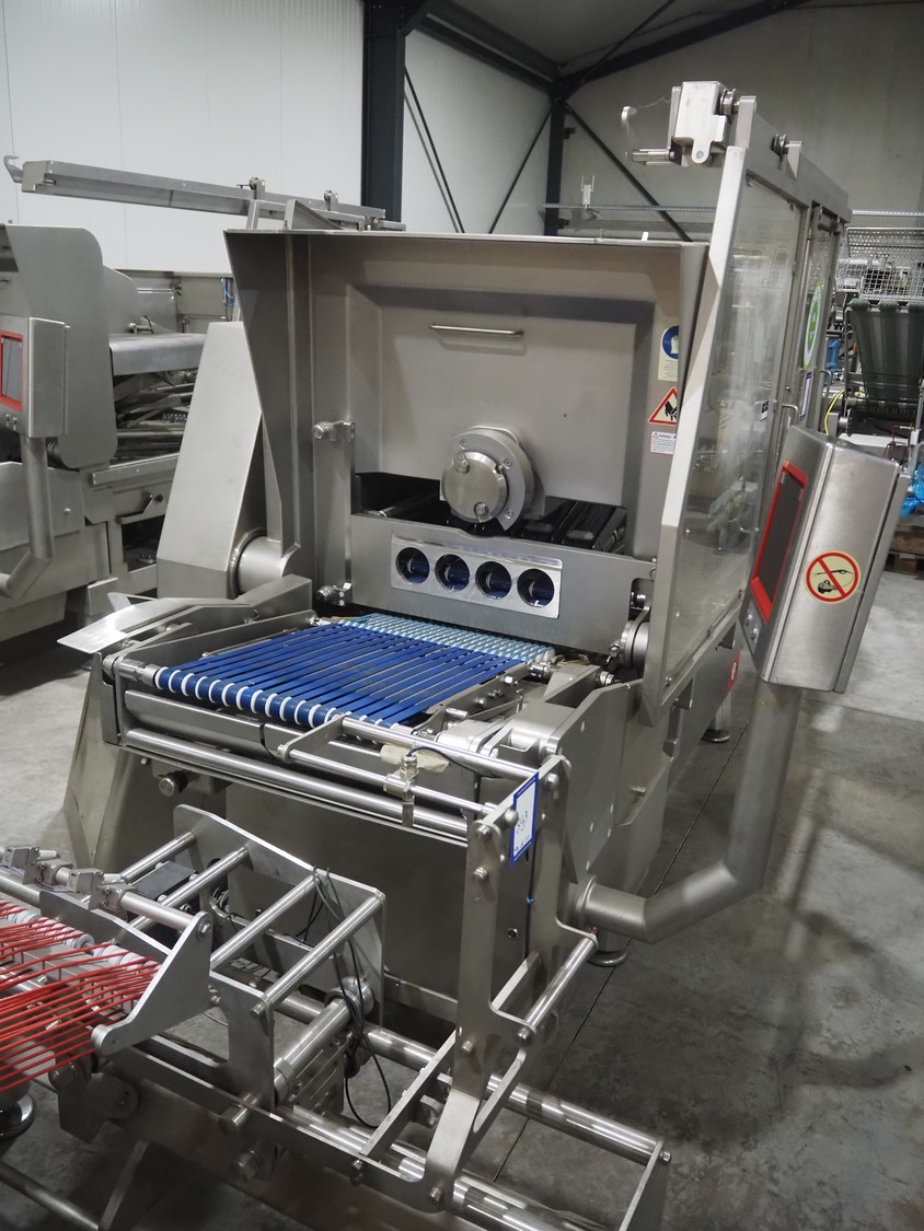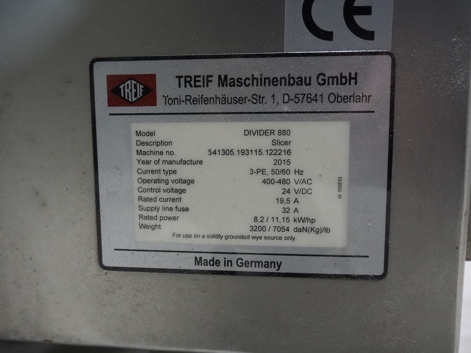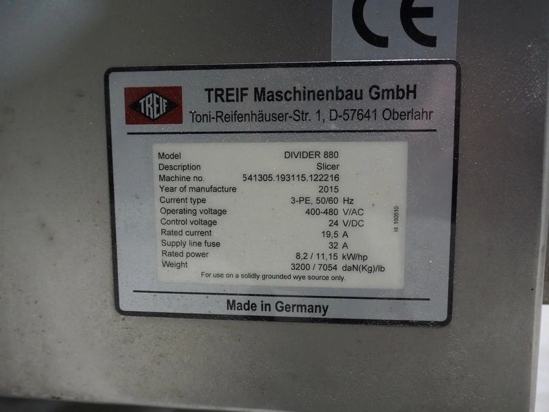 - Slicer, model: Divider 880, machine number: 541305.193115.122216, year of construction: 2015, 400/480 V, 3 Ph, 50/60 Hz, 19.5 A, 8.2 kW, weight: 3200 kg, 4 lanes, plastic wire belt, belt width: 480 mm, dimensions: 6200 mm x 2080 mm x 2700 mm;
