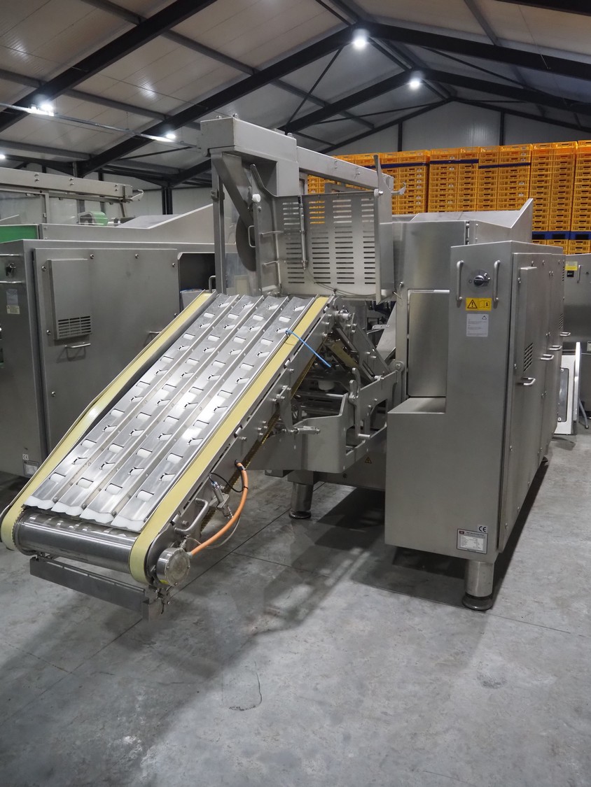 Tray feeder line, model: Einlegerlinie, machine number: 430009.156236.108465, year of construction: 2011, 400 V, 3 Ph, 50/60 Hz, 24 A, 13 kW, weight: 2300 kg, plastic belt, belt width: 550 mm, dimensions: 5680 mm x 1850 mm x 1950 mm.