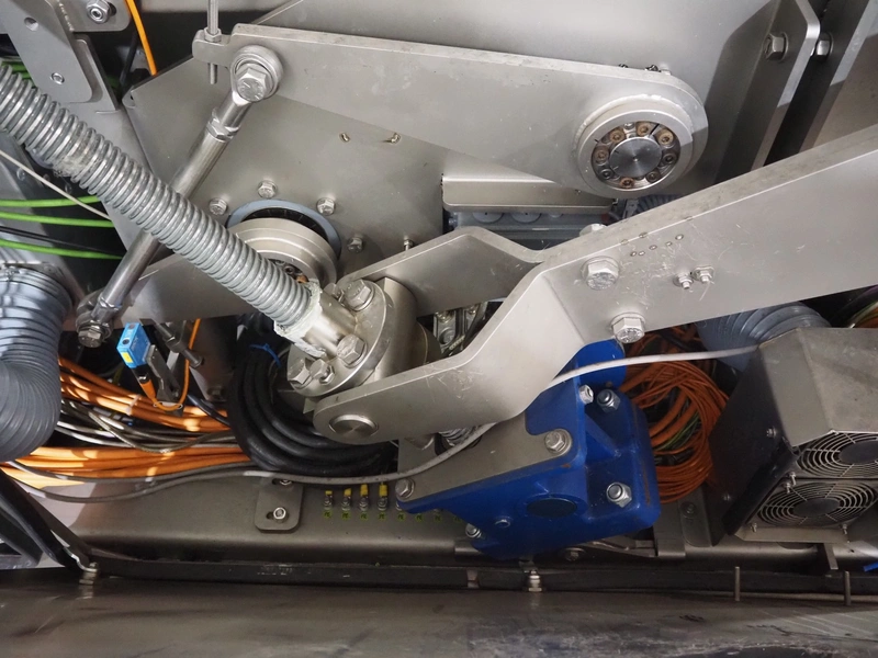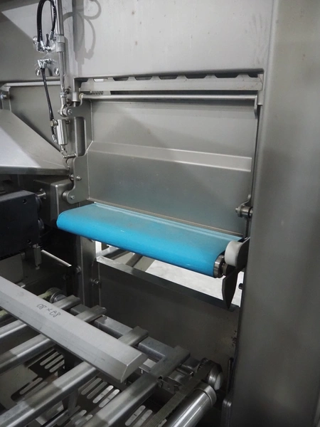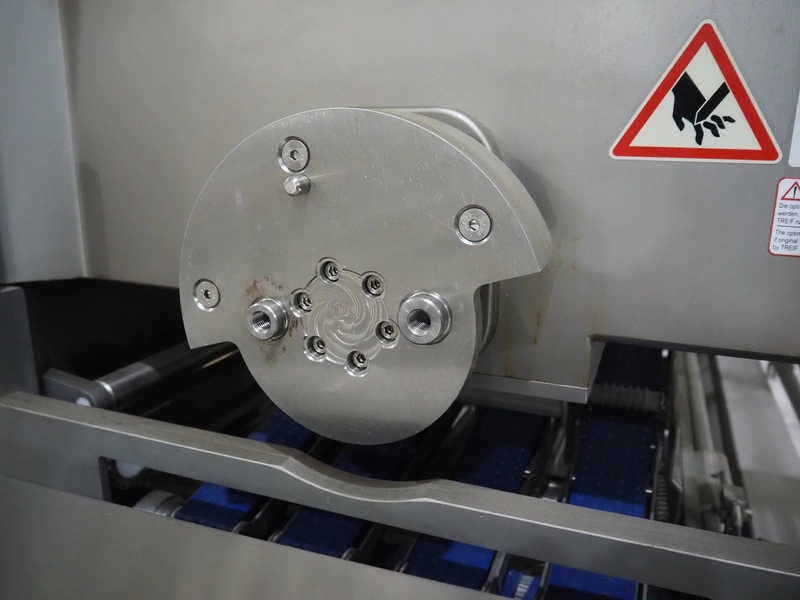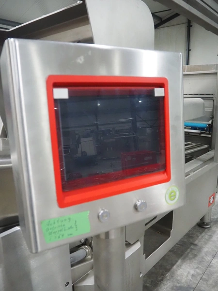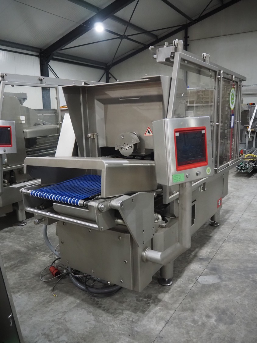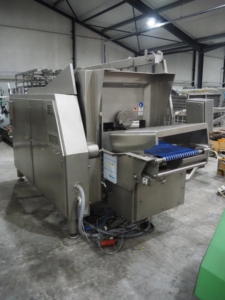 Treif Maschinenbau GmbH slicer, model: Divider 880, machine number: 541301.160825.111010, year of construction: 2012, 400/480 V, 3 Ph, 50/60 Hz, 19.5 A, 8.2 kW, weight: 1950 kg, 4 lanes, plastic infeed belt, belt width: 445 mm, dimensions slicer: 5100 mm x 1870 mm x 2700 mm. Technical condition unknown.