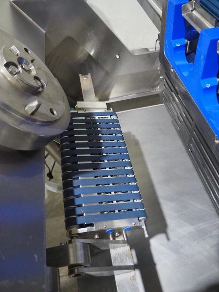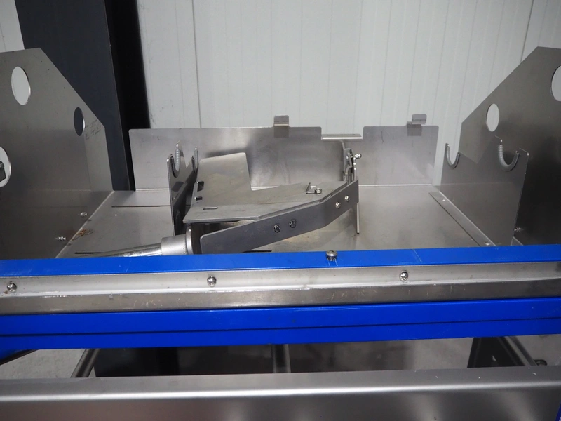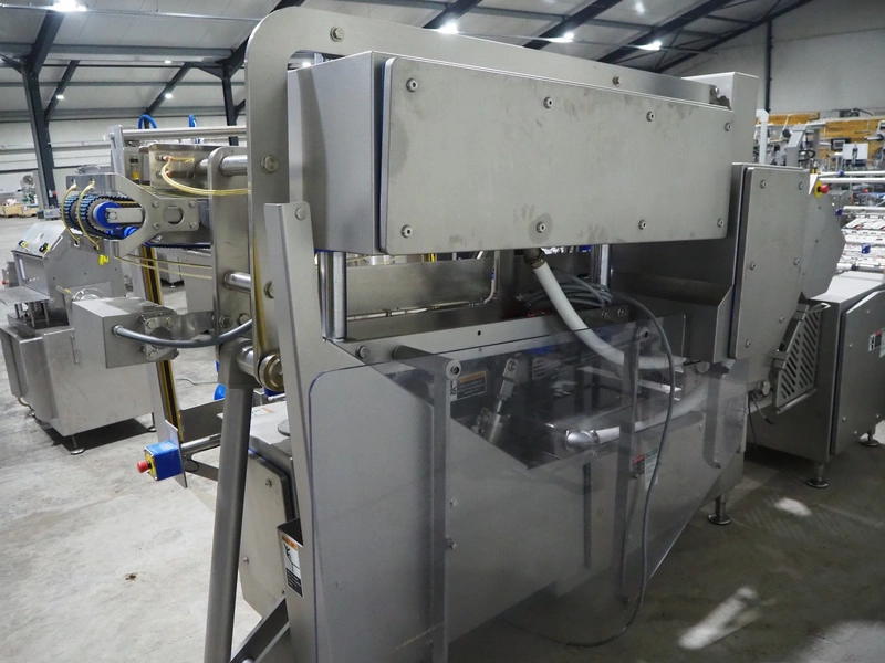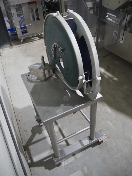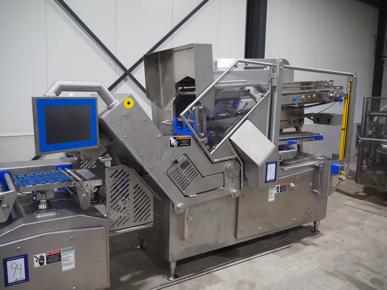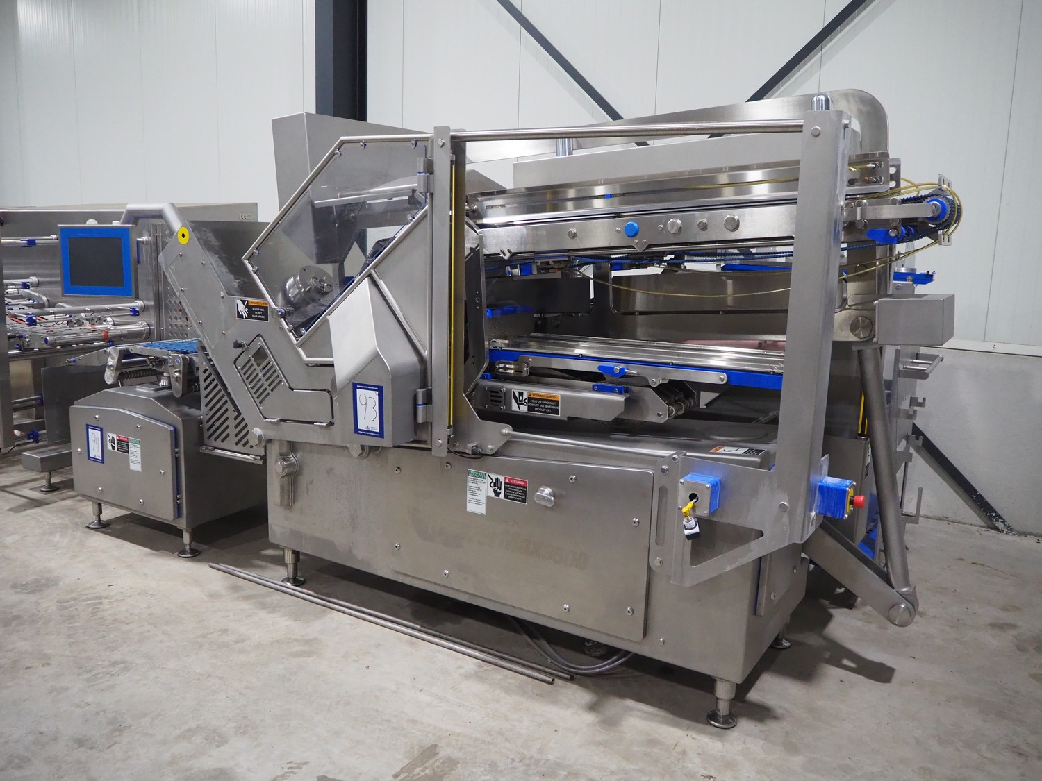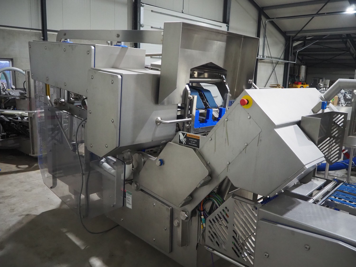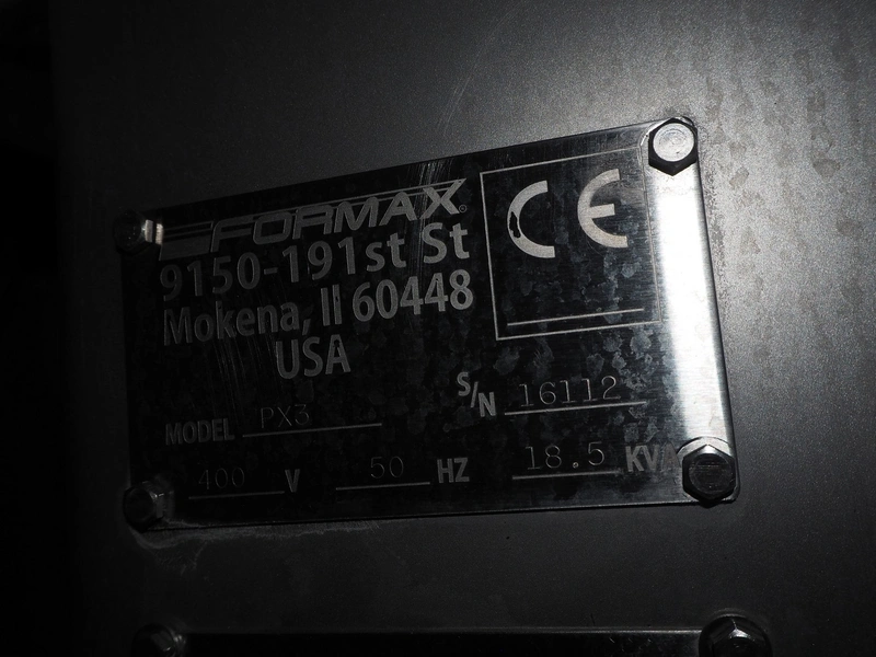Formax slicer, model: PowerMax 3500, serial number: PX3.5-16112, 400 V, 3 Ph, 50 Hz, 29.5 A, 18.5 kW, plastic belt, belt width: (2x) 100 mm, plastic wire belt, belt width: 390 mm, total dimensions: 3900 mm x 1500 mm x 2250 mm. Including trolley with knife holder, dimensions: 770 mm x 600 mm x 1350 mm.