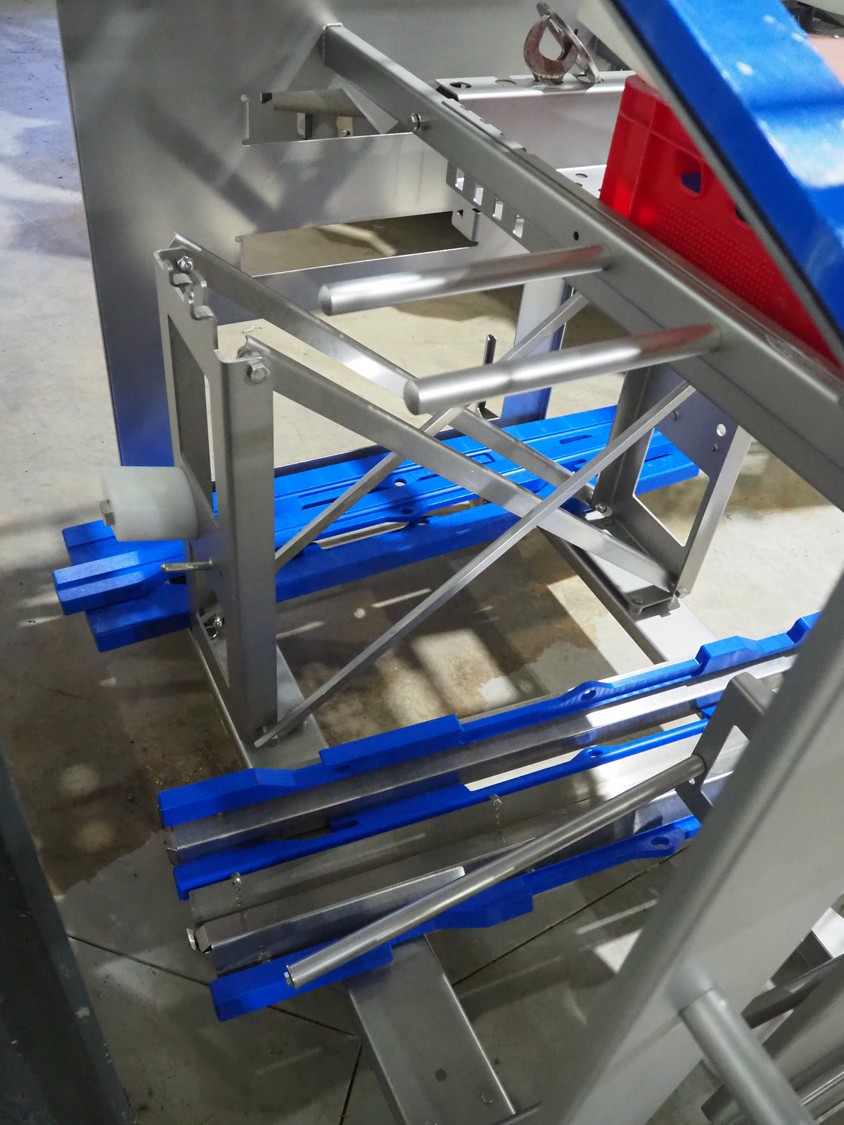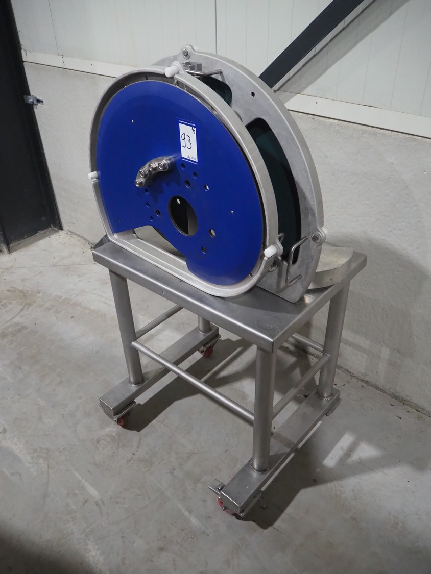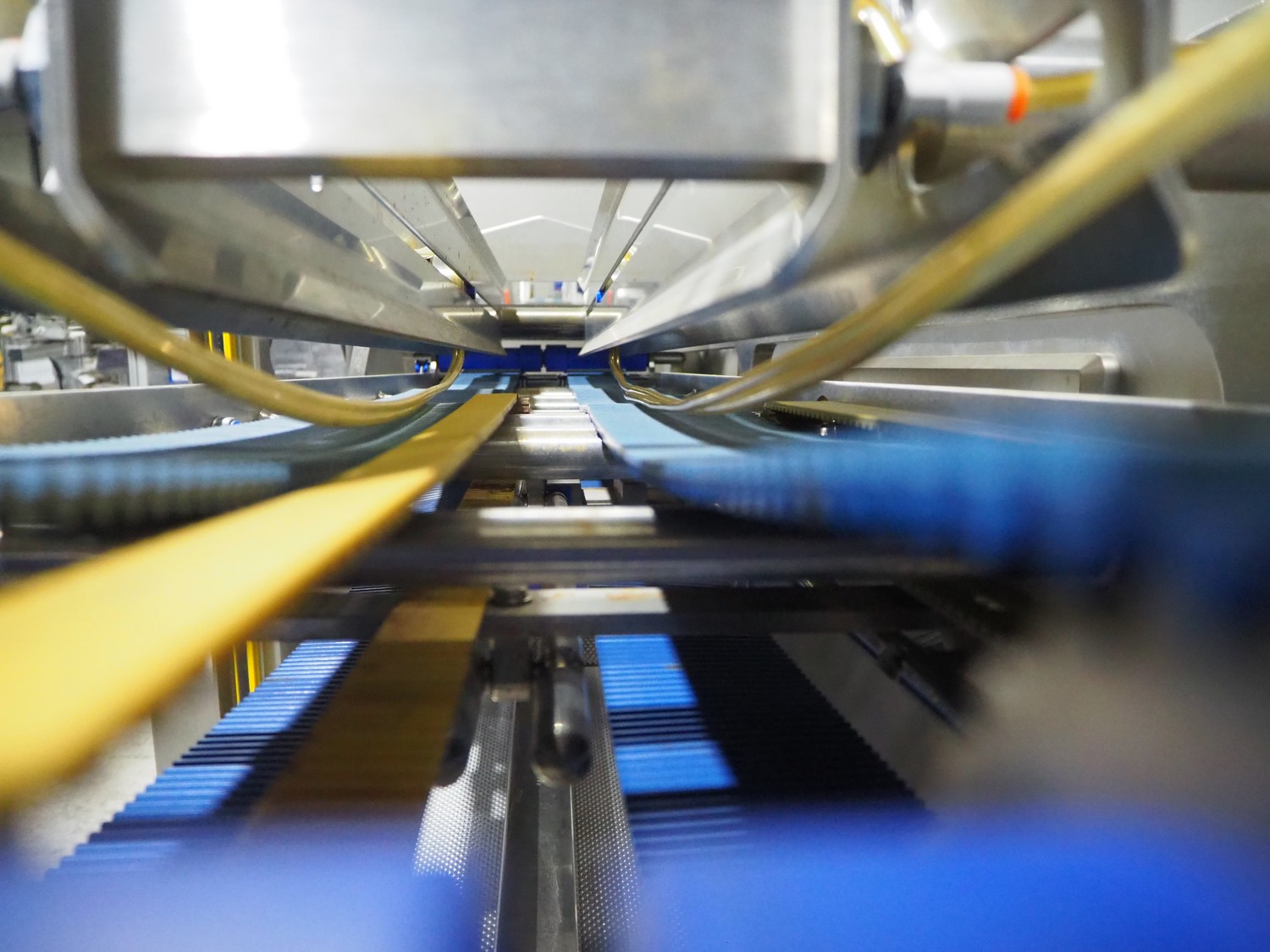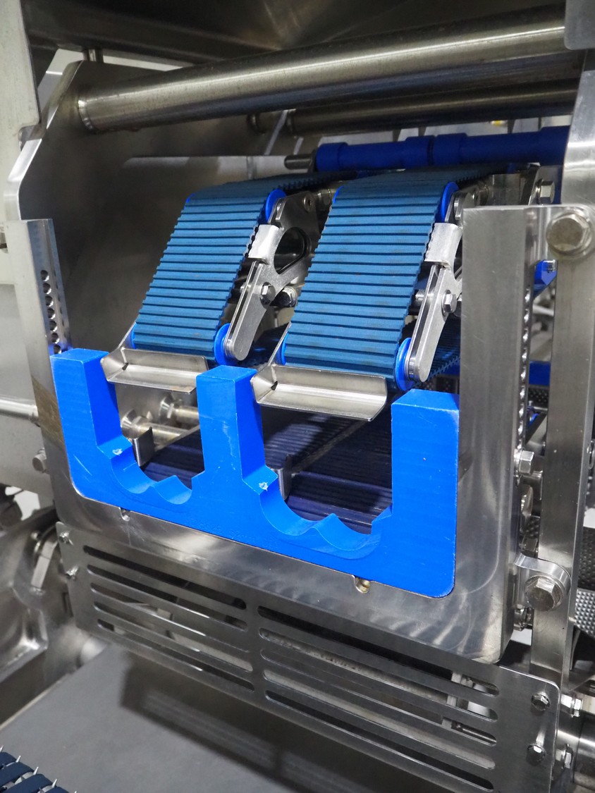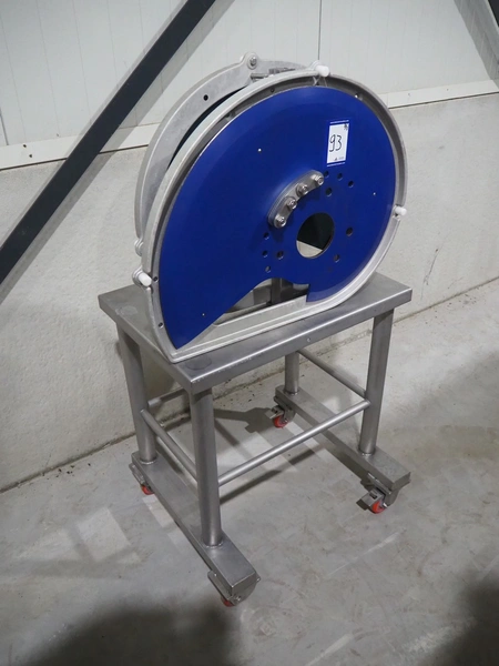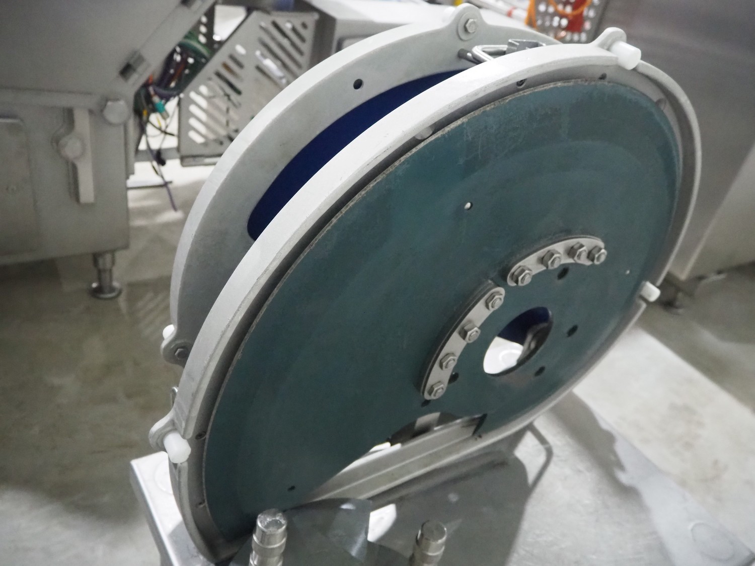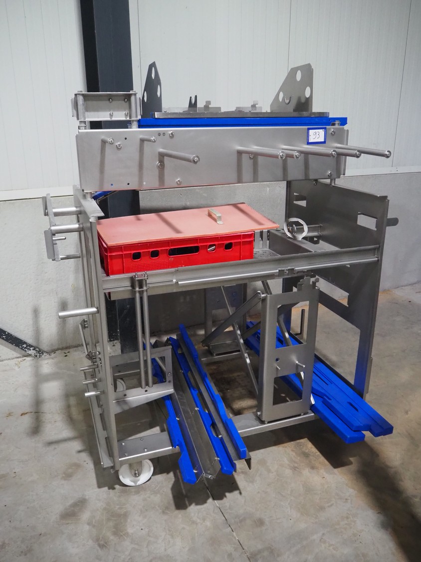 Formax slicer, model: PowerMax 3500, serial number: PX3.5-16112, 400 V, 3 Ph, 50 Hz, 29.5 A, 18.5 kW, plastic belt, belt width: (2x) 100 mm, plastic wire belt, belt width: 390 mm, total dimensions: 3900 mm x 1500 mm x 2250 mm. Including trolley with knife holder, dimensions: 770 mm x 600 mm x 1350 mm.