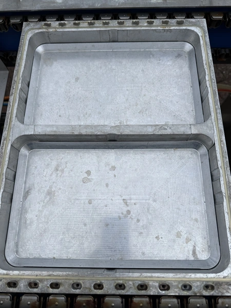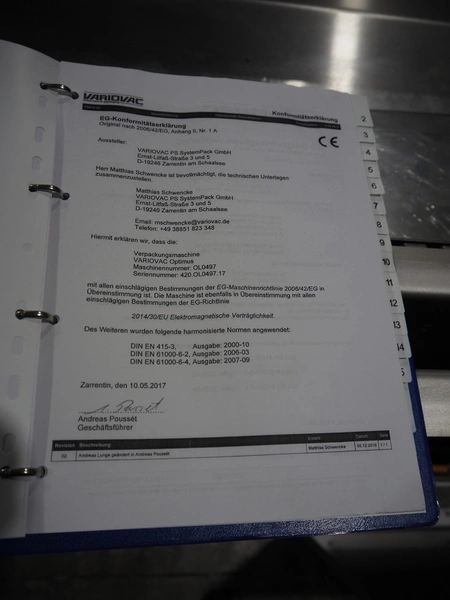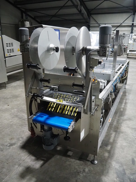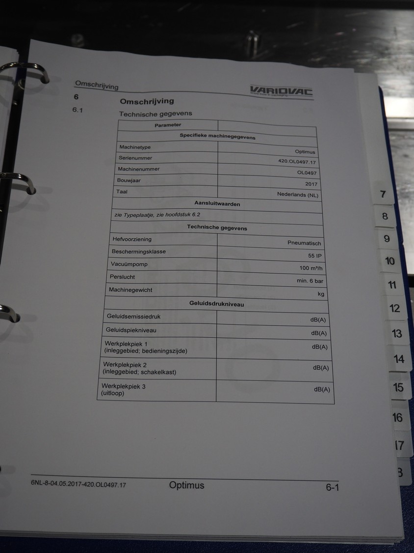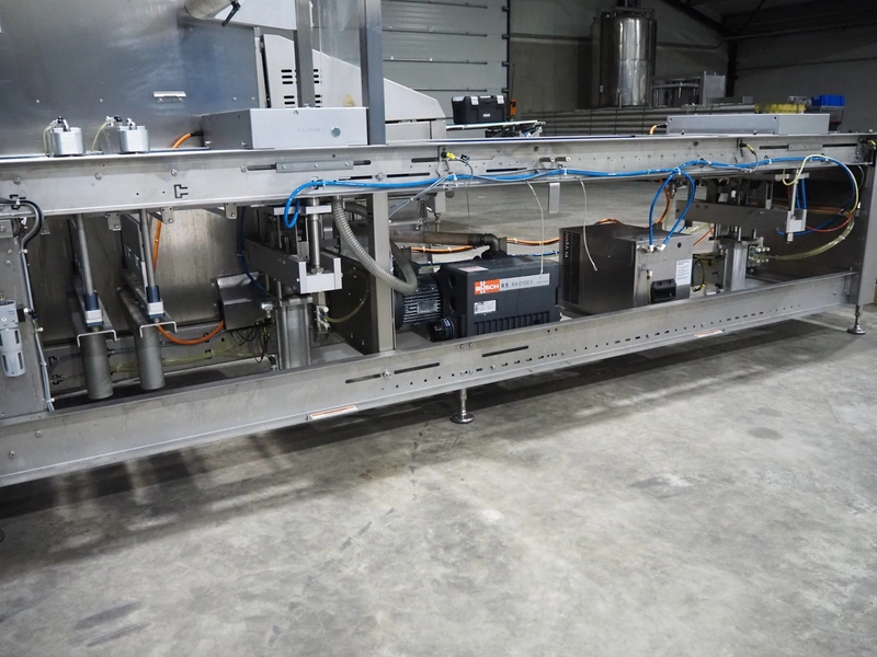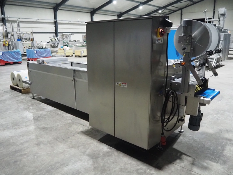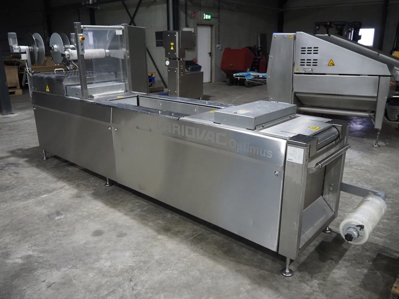 Variovac thermoformer, type: OPTIMUS, serial number: 420.OL0497.17, year of construction: 2017, 230/400 V, 50 Hz, 21 A, 13 kW, soft film, film width: 420 mm, dye: (2x) 172 mm x 255 mm, total dimensions: 4500 mm x 1100 mm x 1700 mm. Including pallet with foil, dimensions pallet: 850 mm x 600 mm x 550 mm.