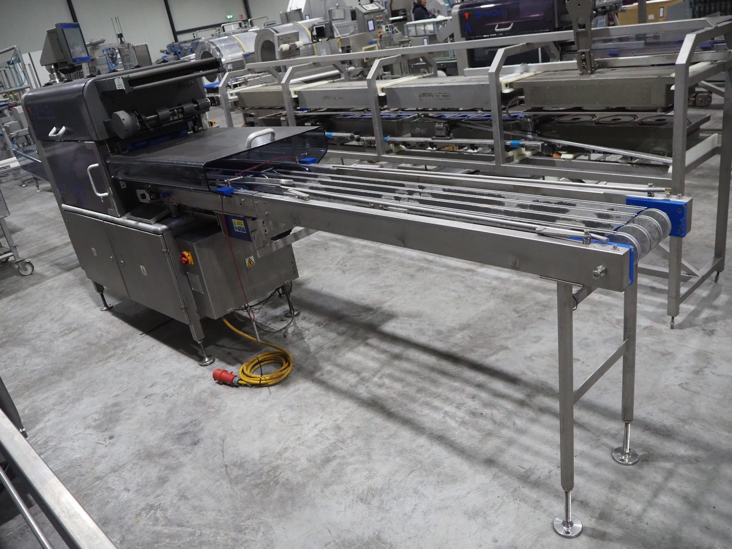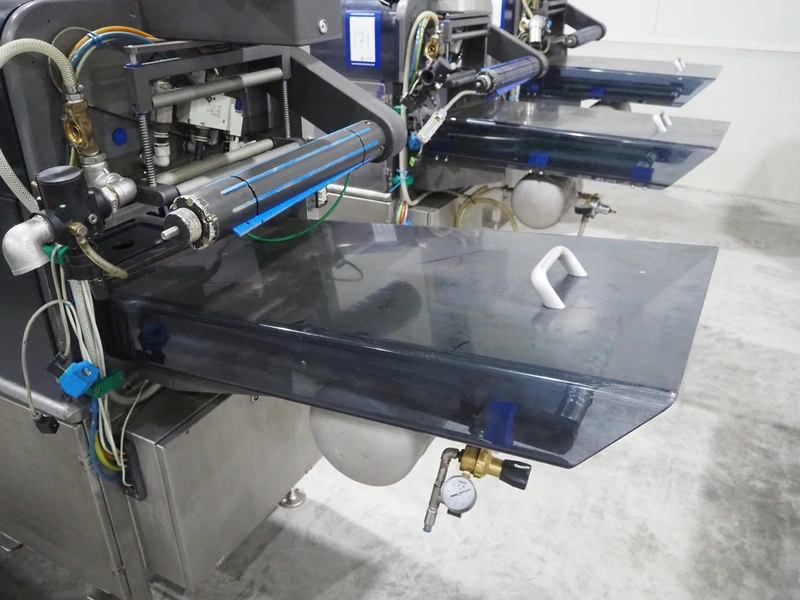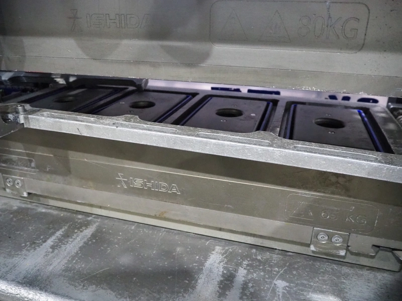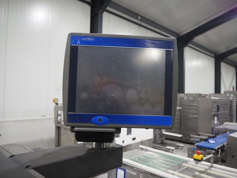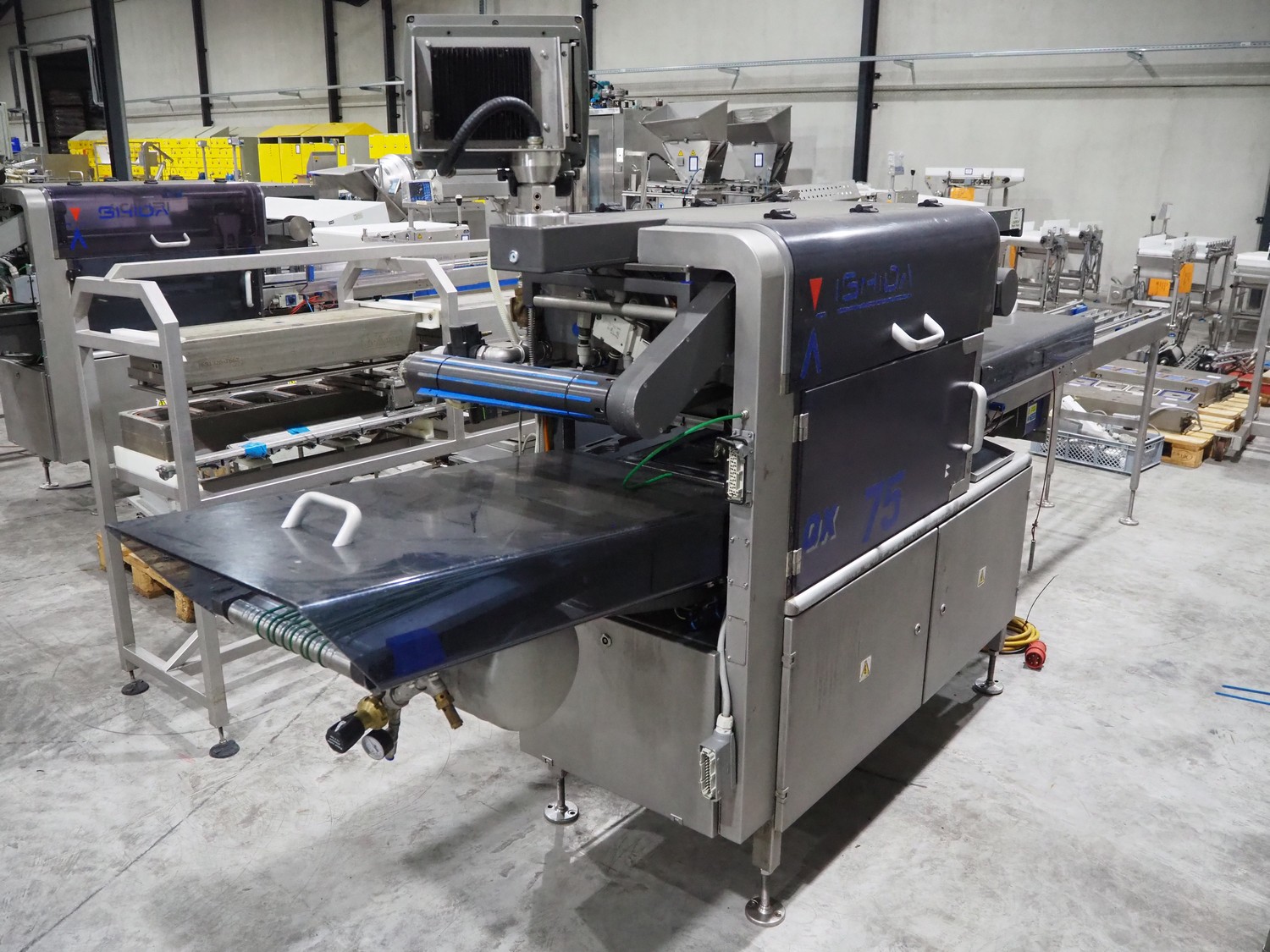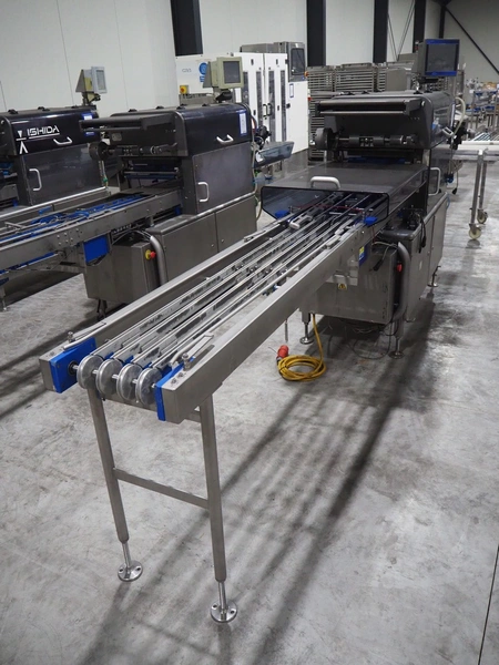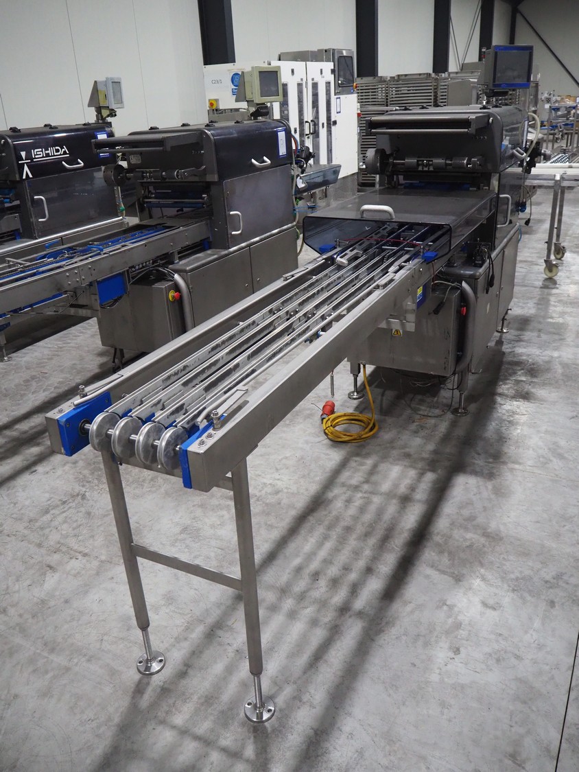 Ishida traysealer, model: QX775, serial number: 557811, year of construction: 10/2007, 415 V, 3 Ph, 50 Hz, 16 A, 830 kg, dimensions dye: (4x) 265 mm x 165 mm, total dimensions: 4750 mm x 800 mm x 1820 mm. Missing infeed belt.