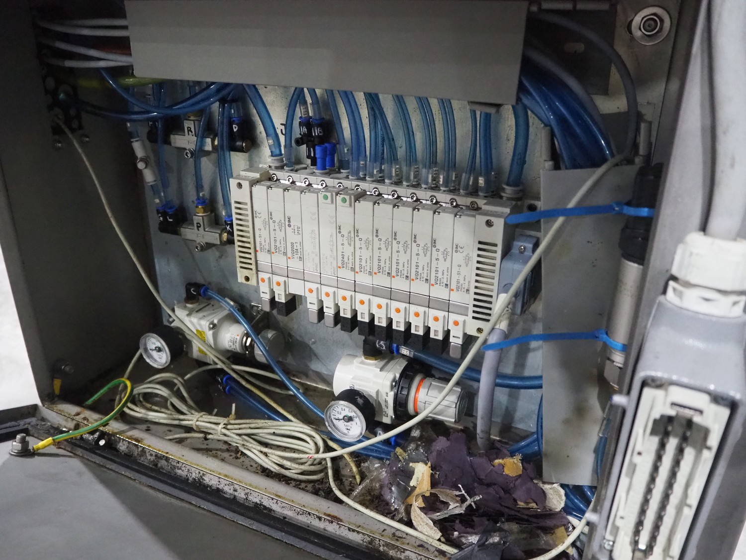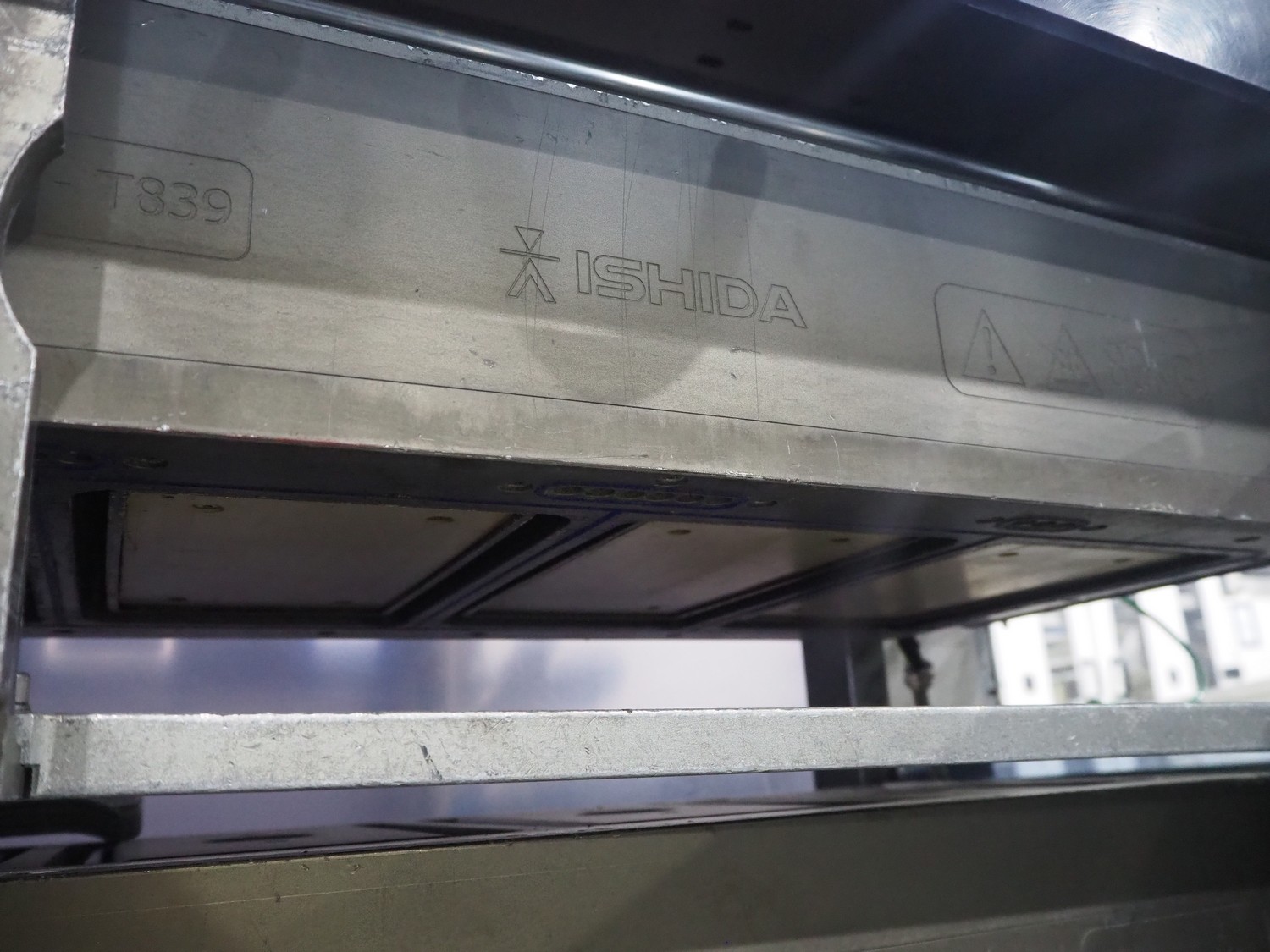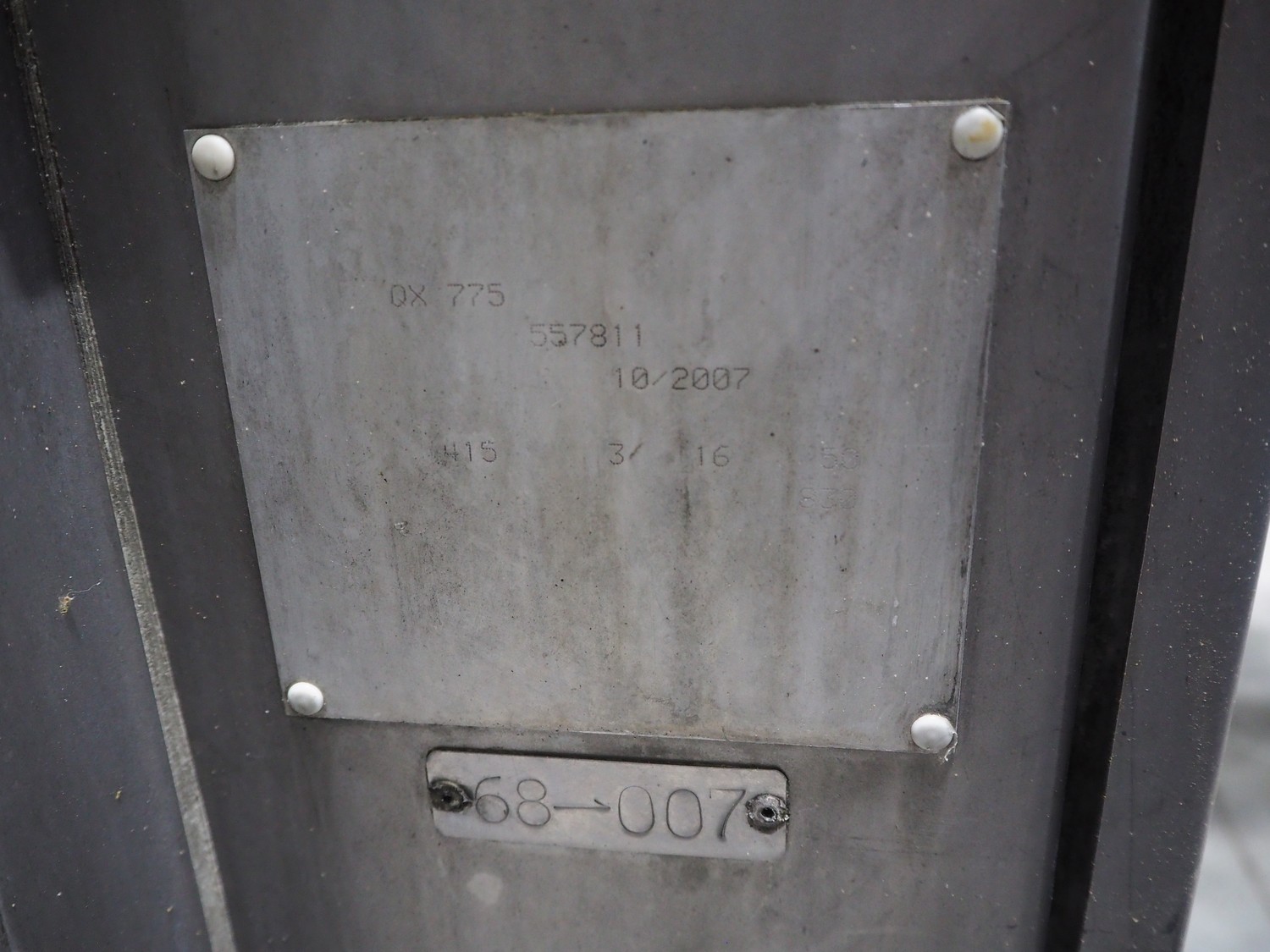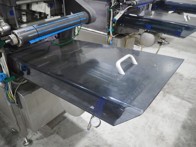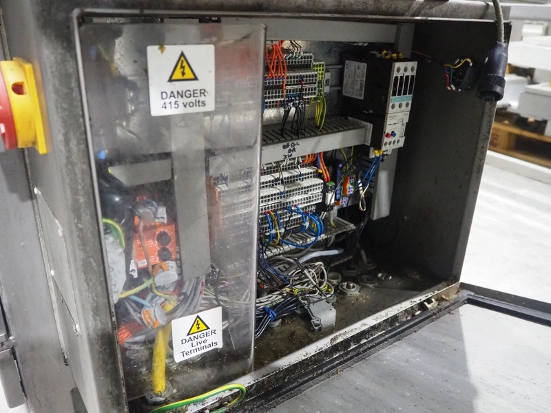 Ishida traysealer, model: QX775, serial number: 557811, year of construction: 10/2007, 415 V, 3 Ph, 50 Hz, 16 A, 830 kg, dimensions dye: (4x) 265 mm x 165 mm, total dimensions: 4750 mm x 800 mm x 1820 mm. Missing infeed belt.
