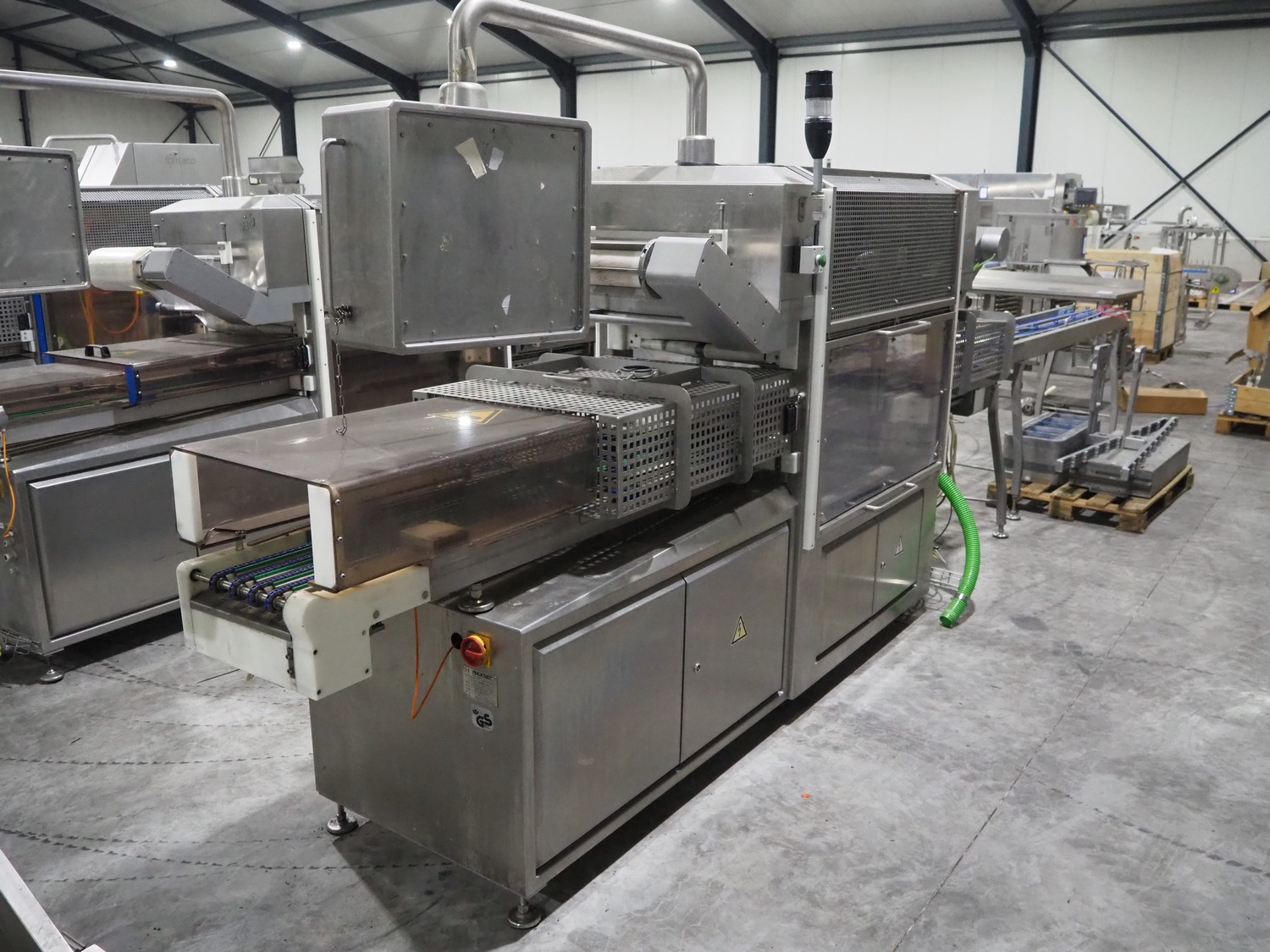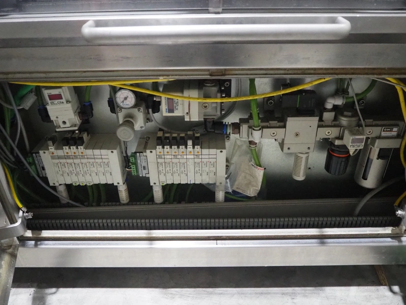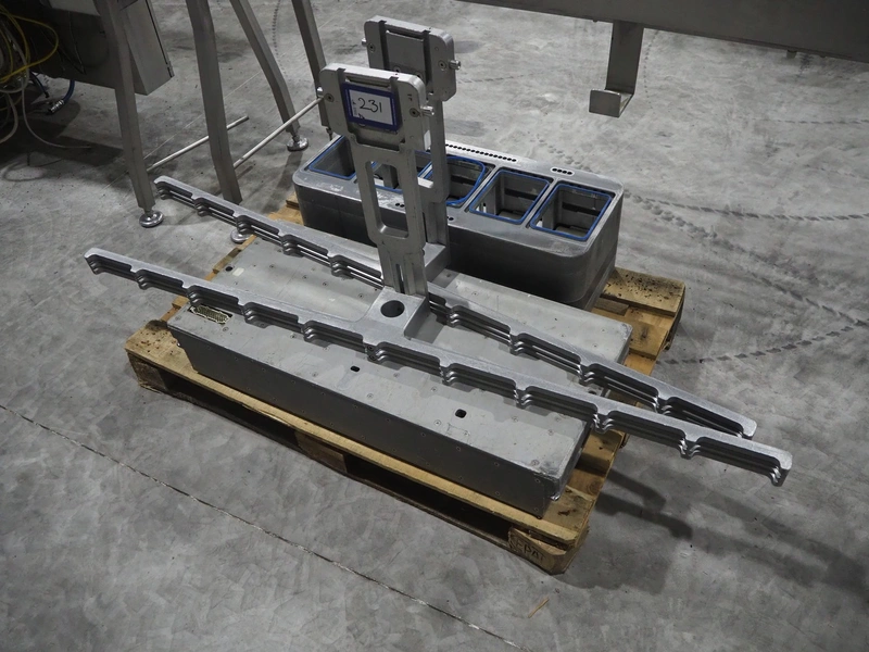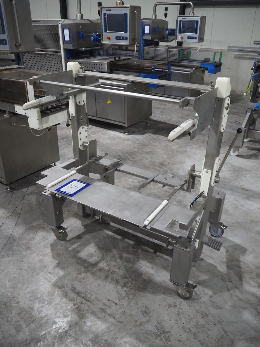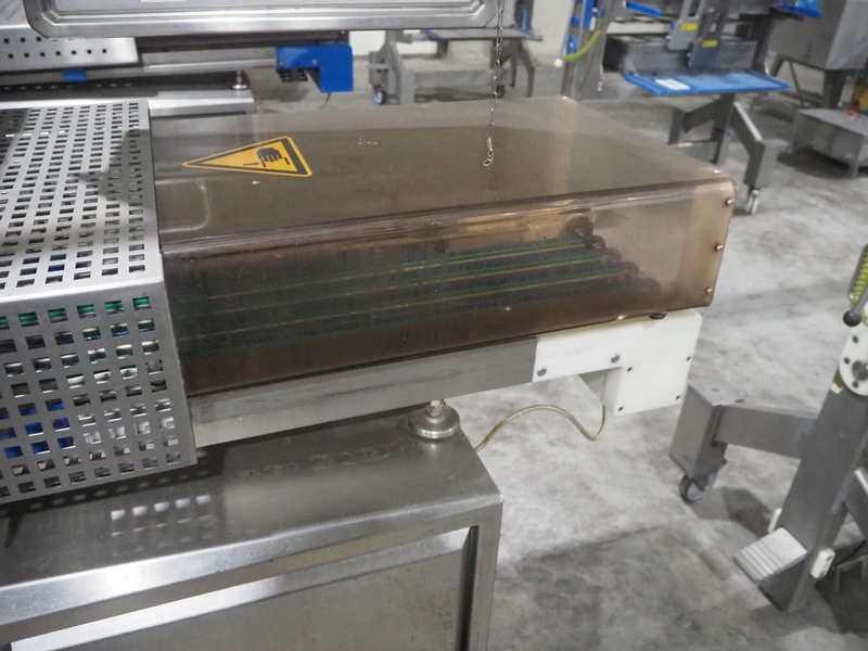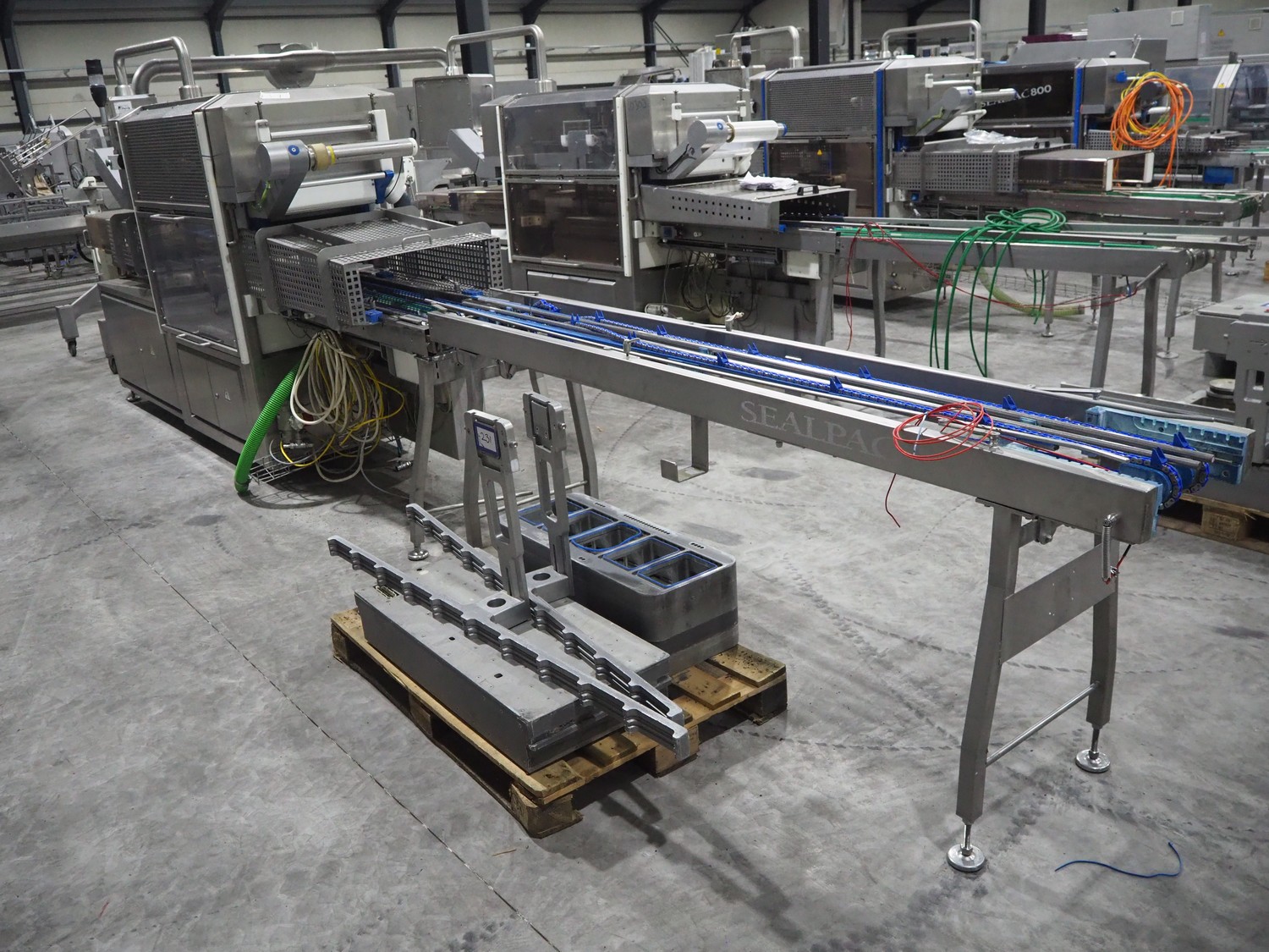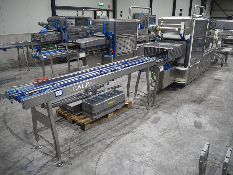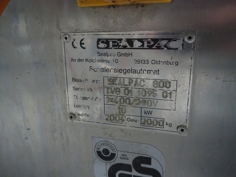 Sealpac traysealer, model: Sealpac 800, serial number: TVG 01109501, year of construction: 2004, 400/230 V, 3 Ph, 10 kW, weight: 2000 kg, dye: (6x) 258 mm x 70 mm, plastic belt, belt width: 360 mm, total dimensions: 6800 mm x 900 mm x 2100 mm. Including s/s trolley for dye's, dimensions: 1400 mm x 1000 mm x 1350 mm, pallet with dye, dye: (5x) 175 mm x 128 mm, total dimensions: 1200 mm x 800 mm x 400 mm.