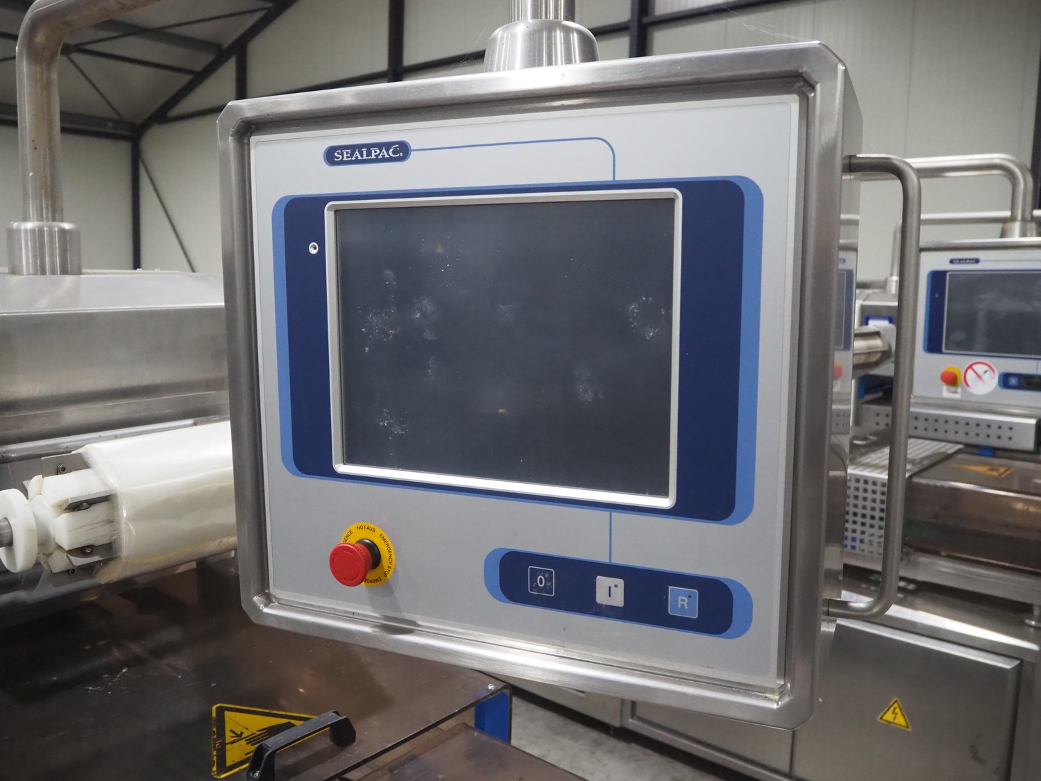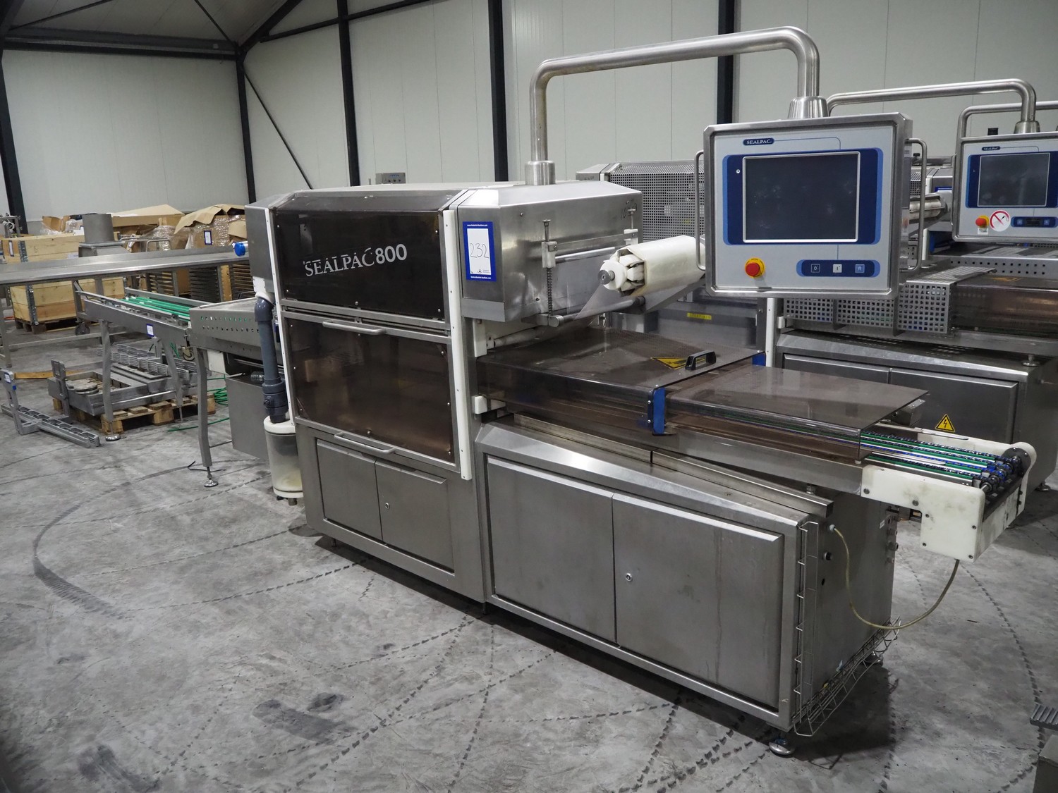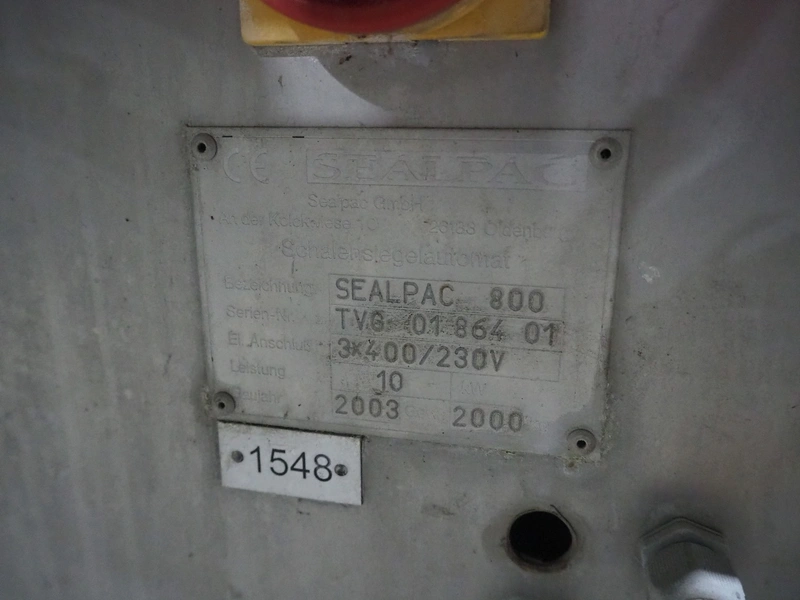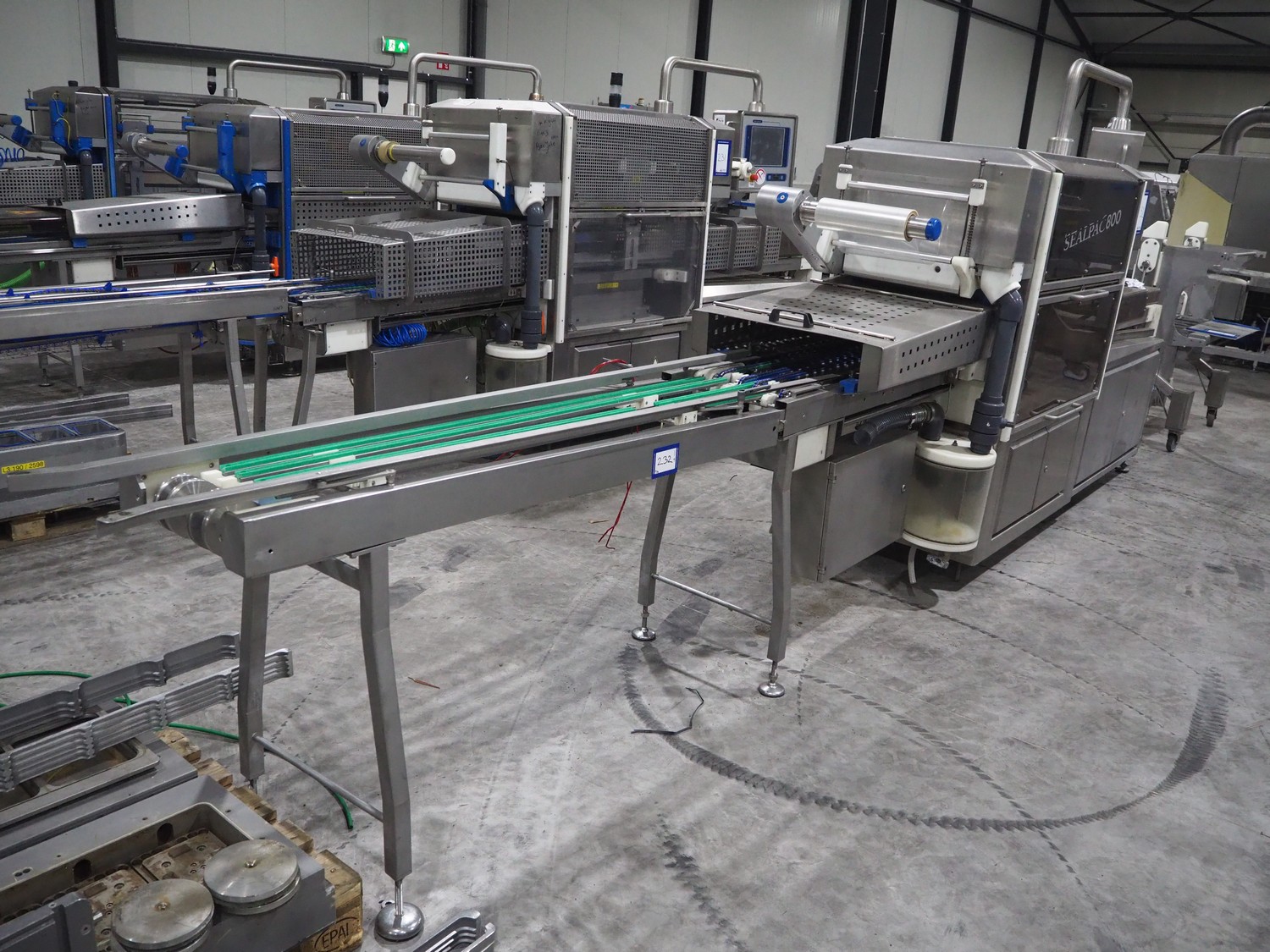 Sealpac traysealer, model: Sealpac 800, serial number: TVG 018640, year of construction: 2003, 400/230 V, 3 Ph, 10 kW, weight: 2000 kg, film width: 325 mm, dye: (4x) 260 mm x 158 mm, total dimensions: 6000 mm x 900 mm x 2100 mm. Including s/s trolley for dye's, dye: (4x) 225 mm x 178 mm, (5x) 230 mm x 168 mm, total dimensions: 1200 mm x 800 mm x 500 mm.