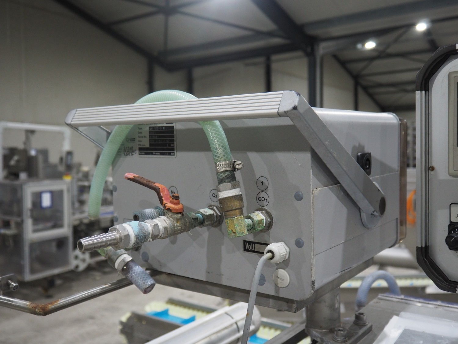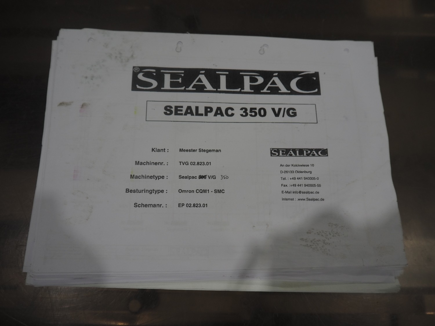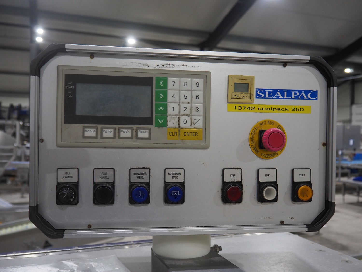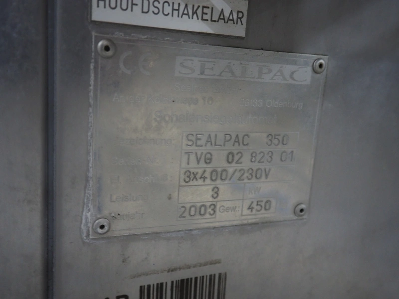 Sealpac traysealer, type: SEALPAC 350, serial number: TVG 02 823 01, year of construction: 2003, 400 V, 3 Ph, 3 kW, weight: 450 kg, dimensions dye: (2x) ø 115 mm, plastic belt, belt width: 250 mm, with Witt Gasetechnik gas mixing station total dimensions: 7000 mm x 700 mm x 1830 mm. Including s/s tool trolley, dimensions: 800 mm x 700 mm x 1350 mm.