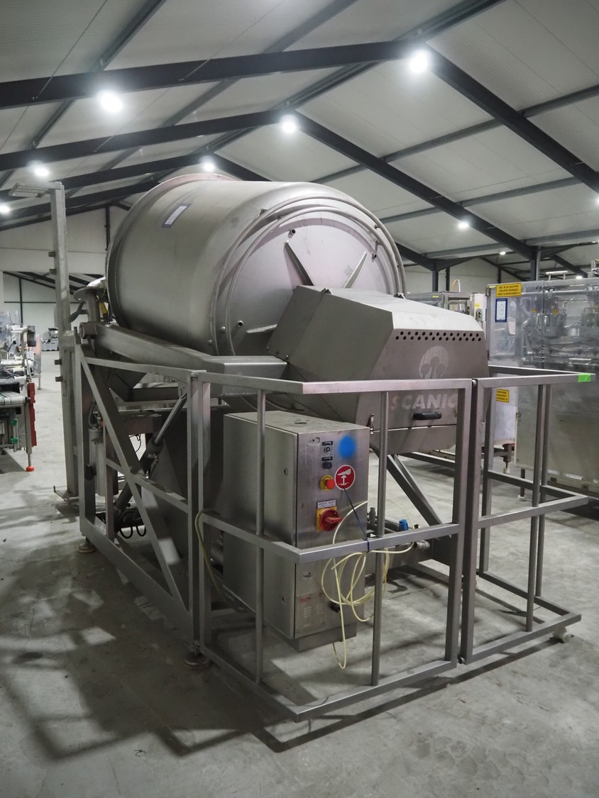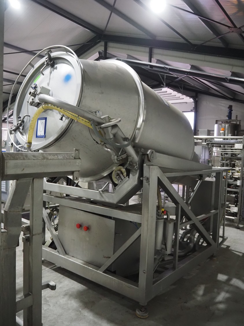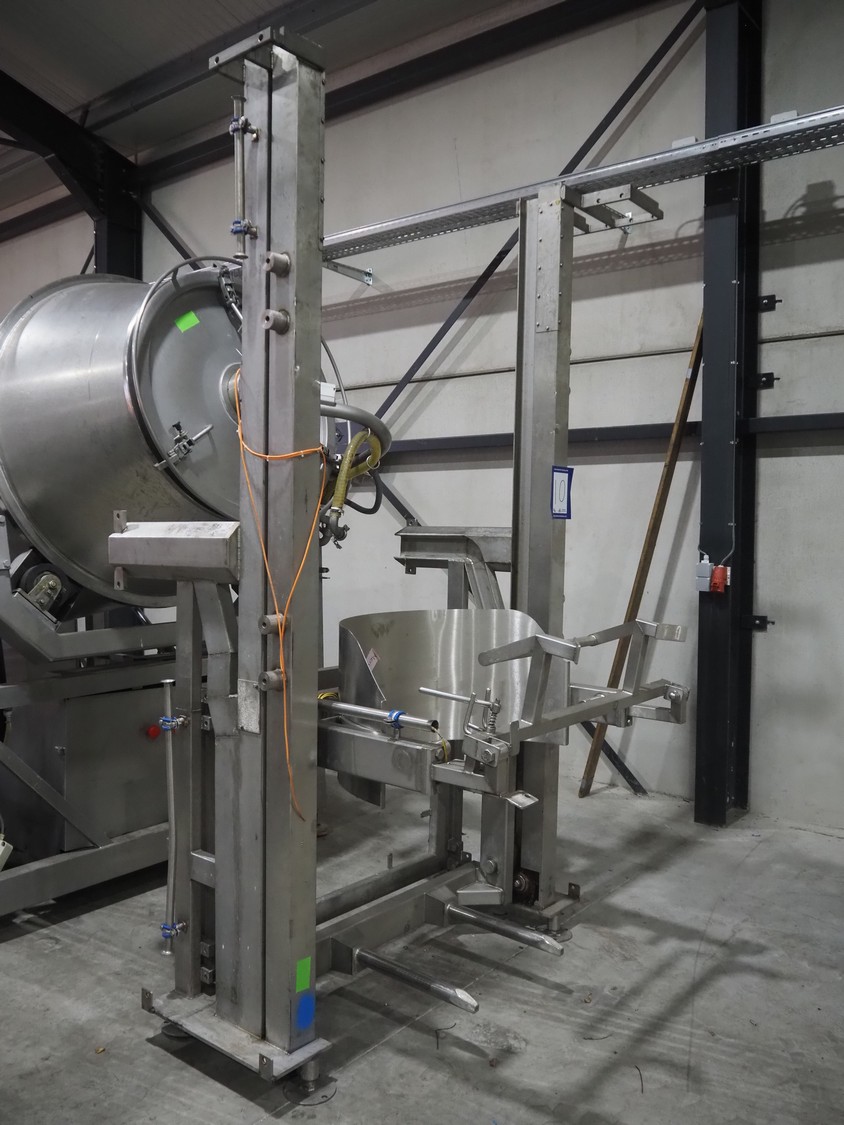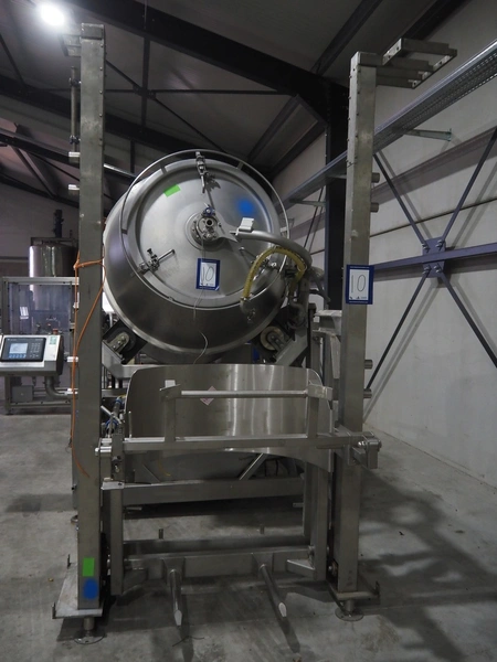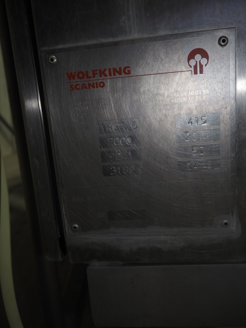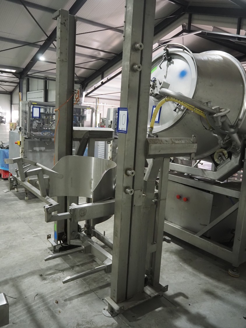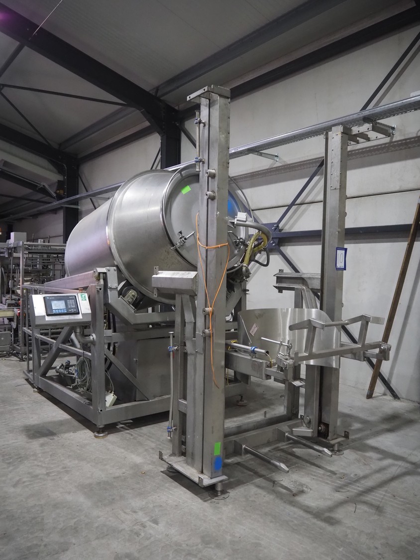 Wolfking Scanio vacuum tumbler with lifter for 200 liter meat bins, type: TRC2.5, serial number: 9241, year of construction: 2000, 415 V, 50 Hz, 20.4 A, total dimensions: 3750 mm x 2400 mm x 2750 mm. Lifter dimensions: 1600 mm x 1550 mm x 2720 mm. Without vacuum pump.