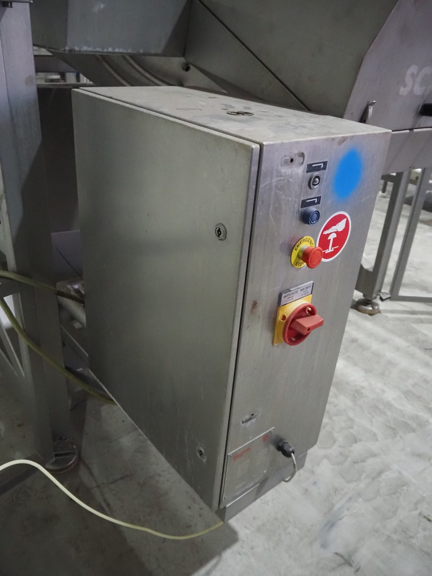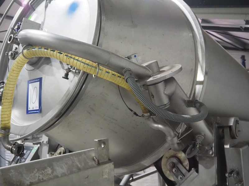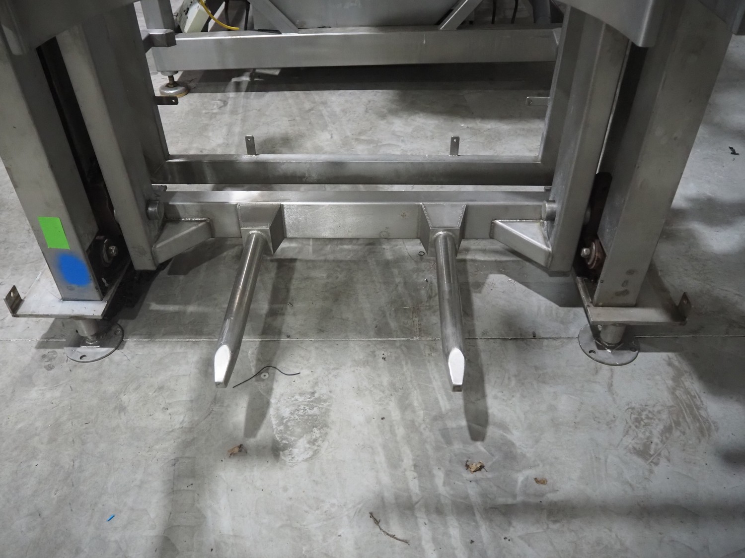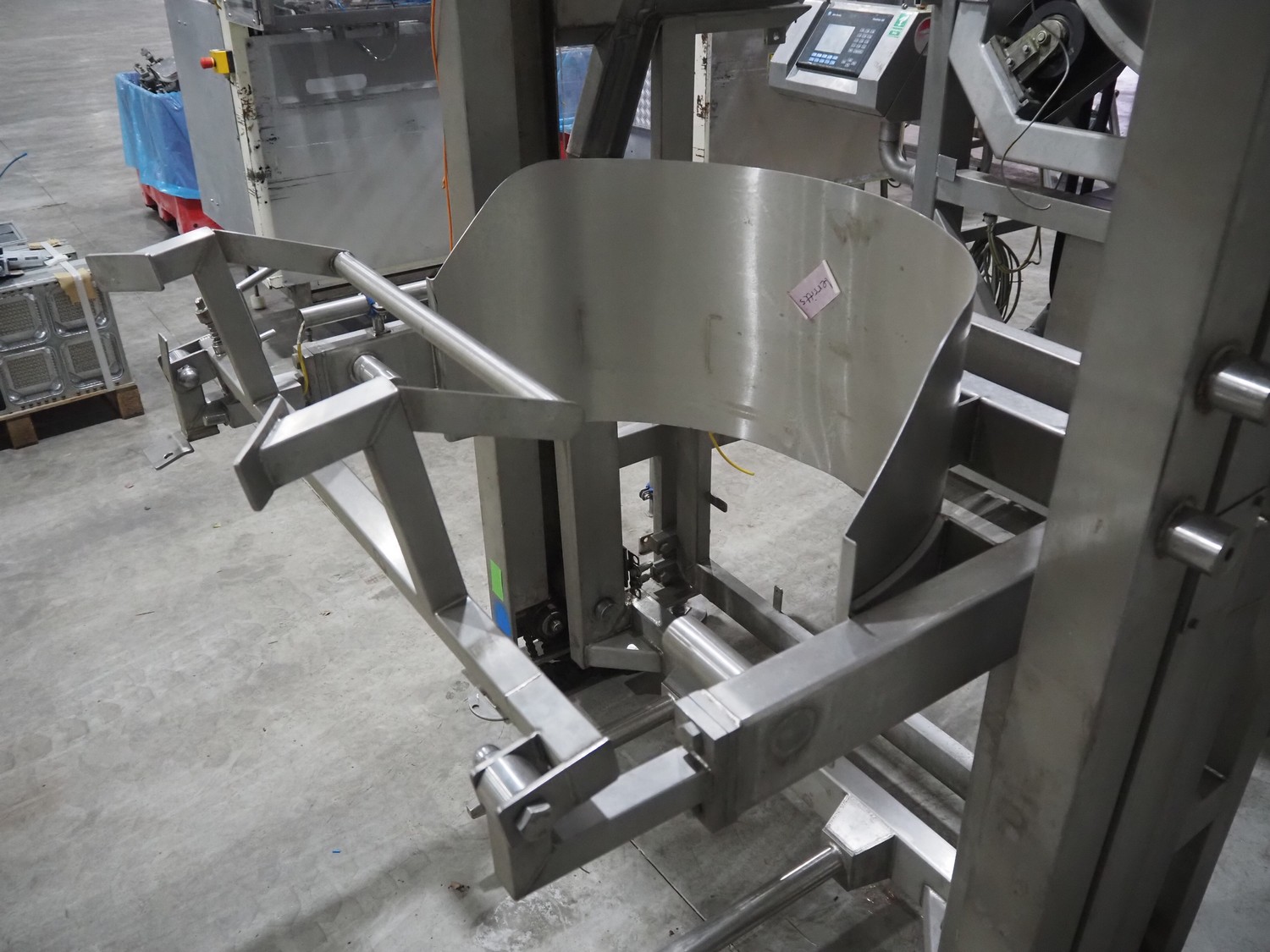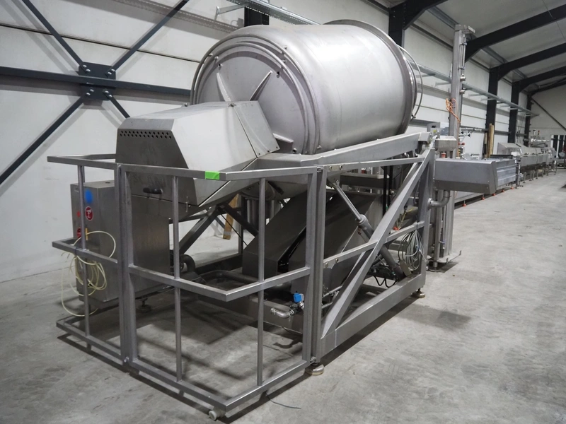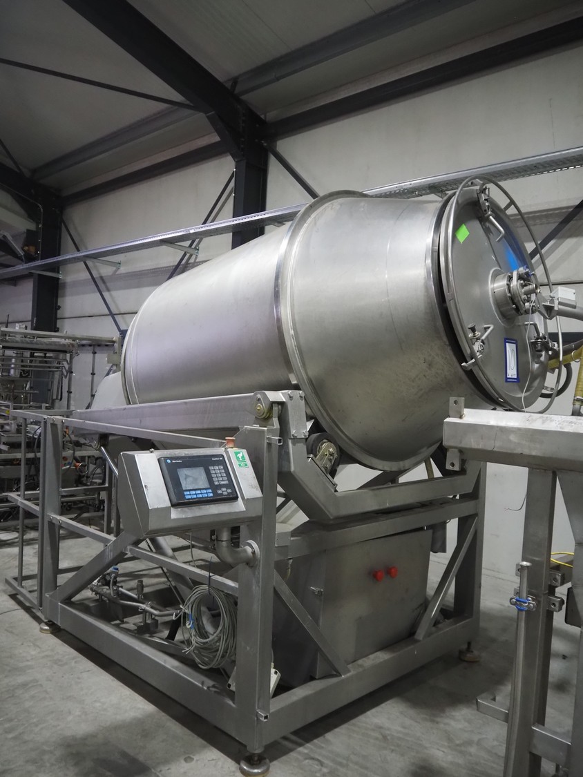Wolfking Scanio vacuum tumbler with lifter for 200 liter meat bins, type: TRC2.5, serial number: 9241, year of construction: 2000, 415 V, 50 Hz, 20.4 A, total dimensions: 3750 mm x 2400 mm x 2750 mm. Lifter dimensions: 1600 mm x 1550 mm x 2720 mm. Without vacuum pump.