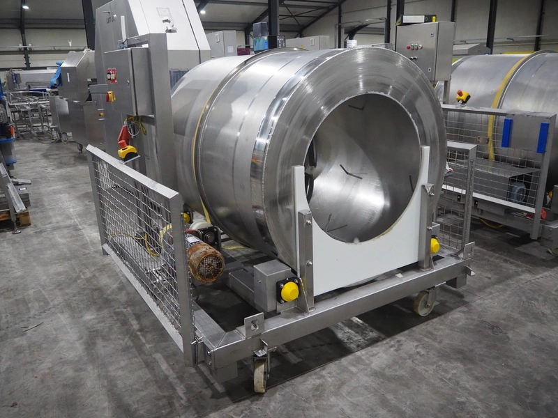 S/s mobile marinate tumbler, drum dimensions: Ø 1230 mm x 1510 mm, total dimensions: 2000 mm x 1950 mm x 1850 mm.
