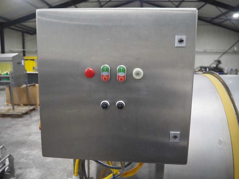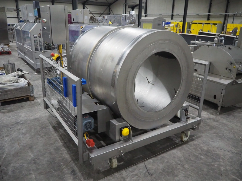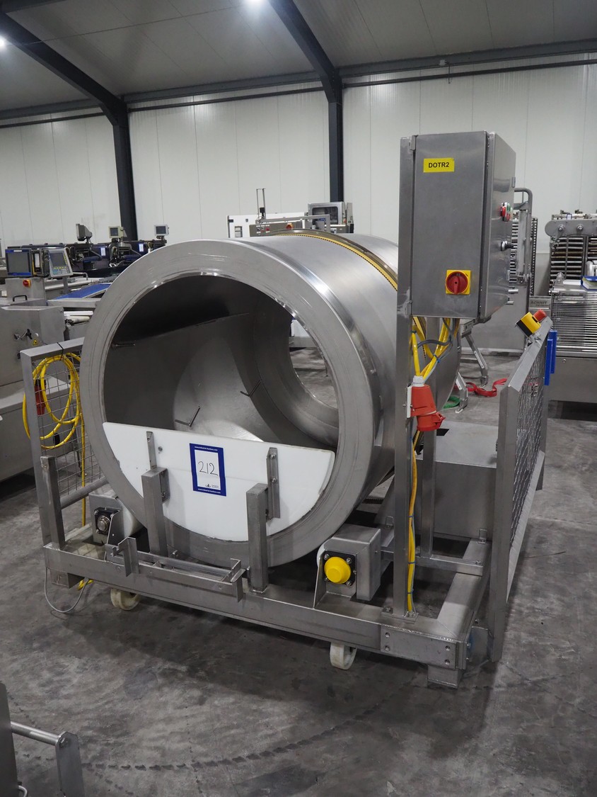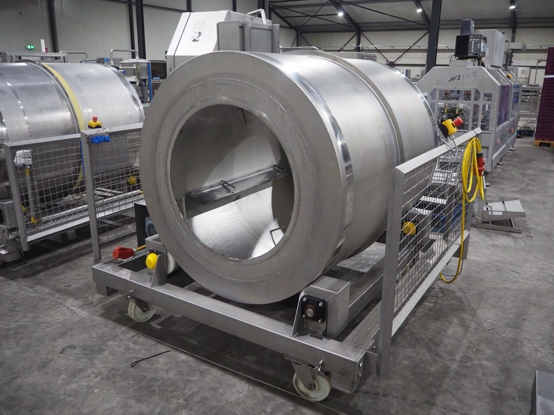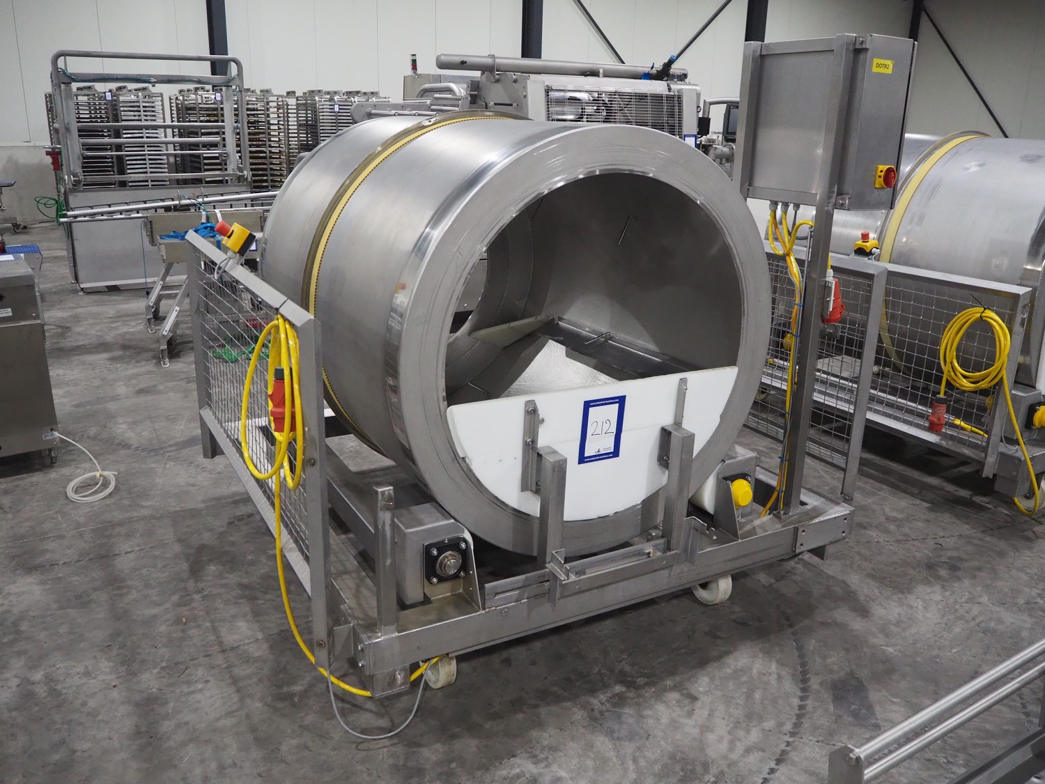 S/s mobile marinate tumbler, drum dimensions: Ø 1230 mm x 1510 mm, total dimensions: 2000 mm x 1950 mm x 1850 mm.