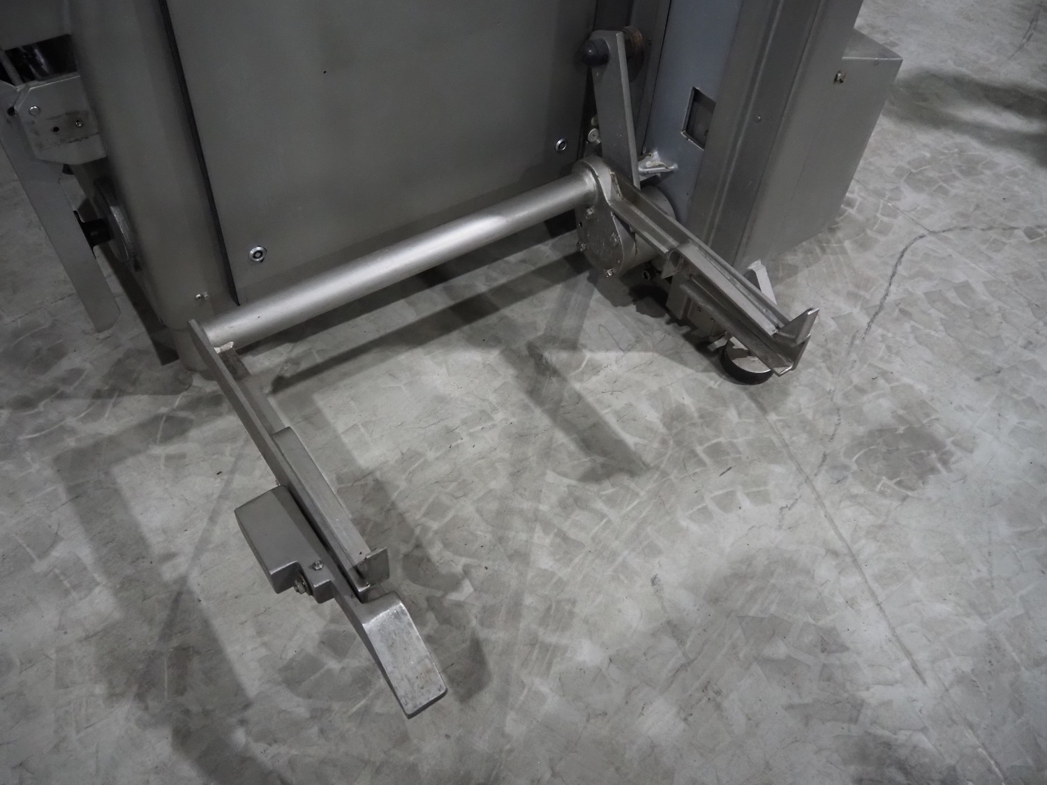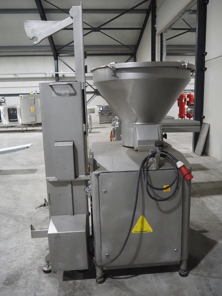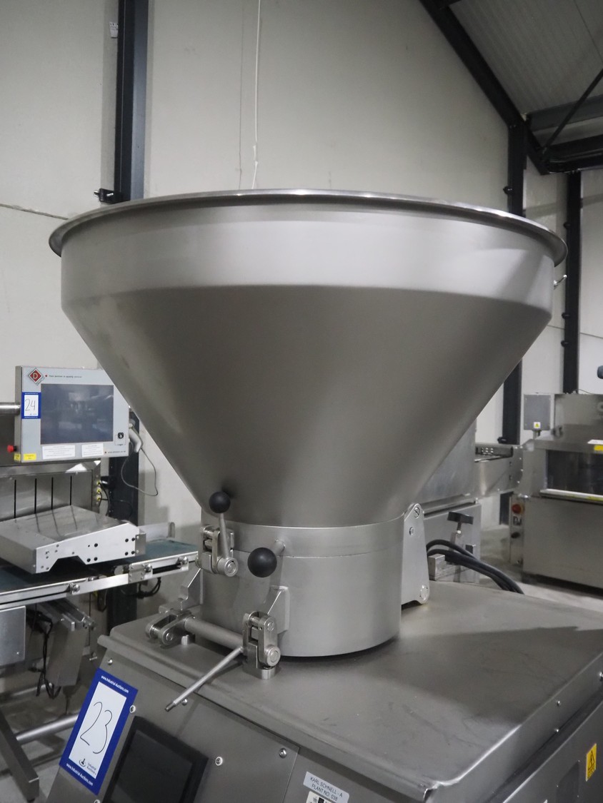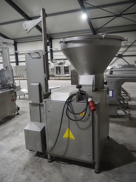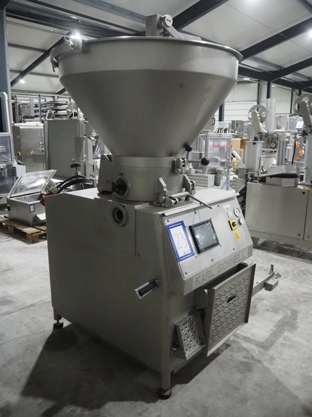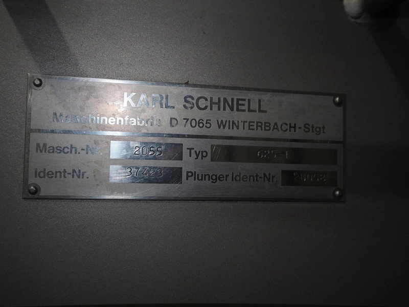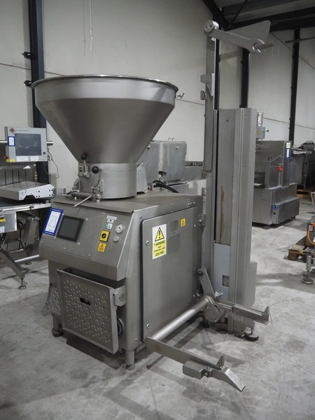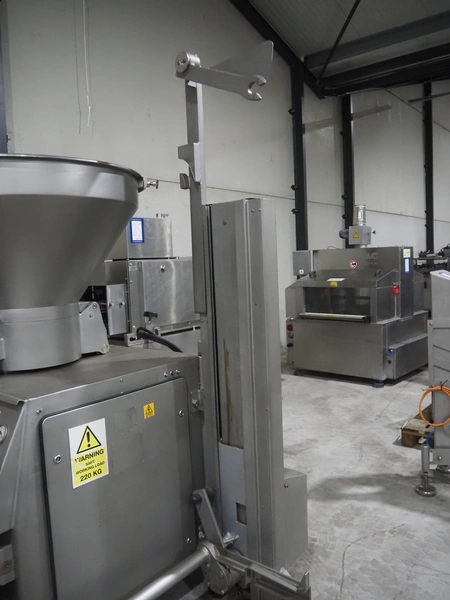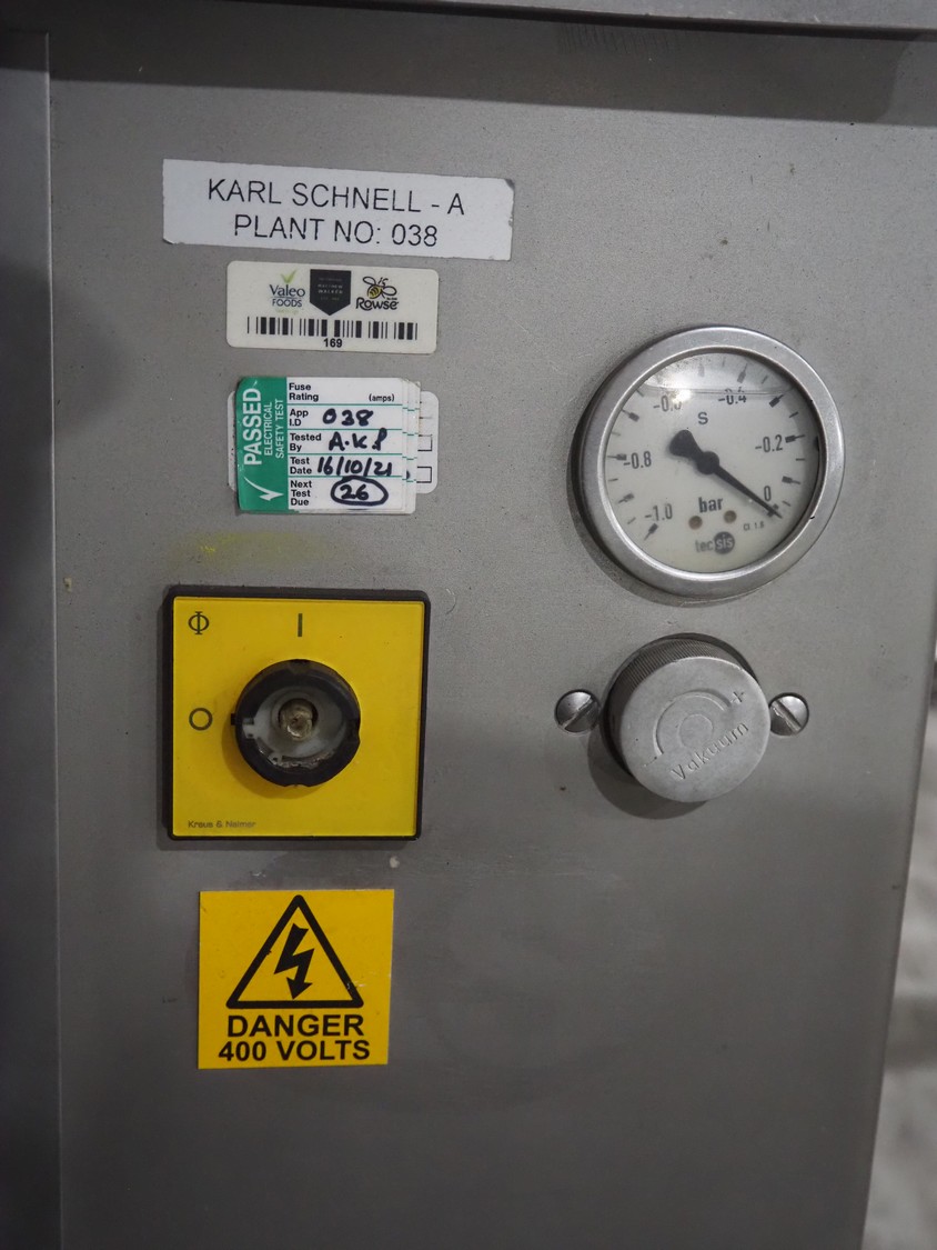 Karl Schnell vacuum filling machine with lifter for 200 liter meat bins, type: 573-SE, serial number: 20691, 380 V, 3 Ph, 50 Hz, 13.6 A, 7.3 kW, total dimensions: 2950 mm x 1100 mm x 1530 mm.