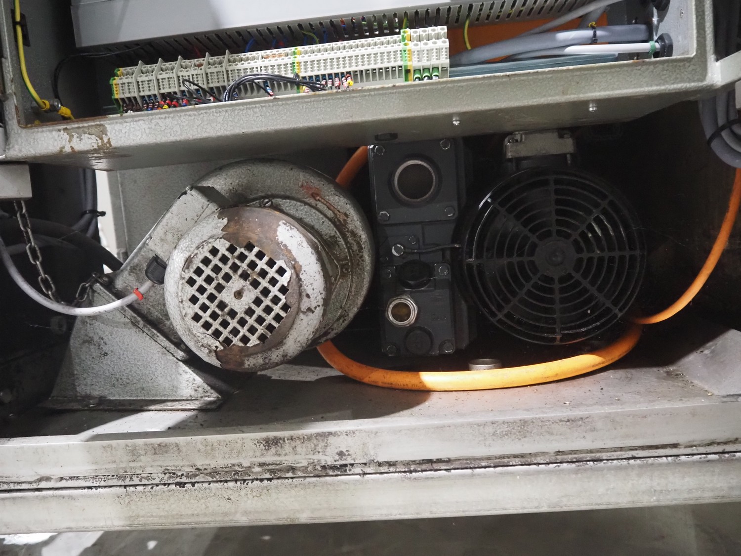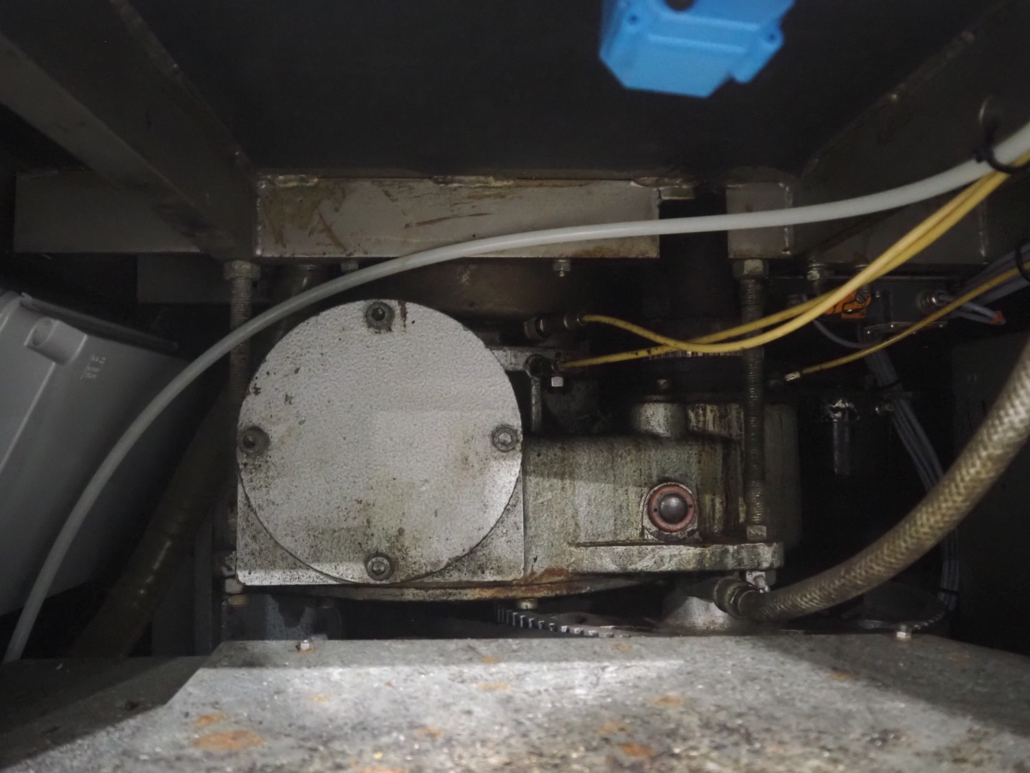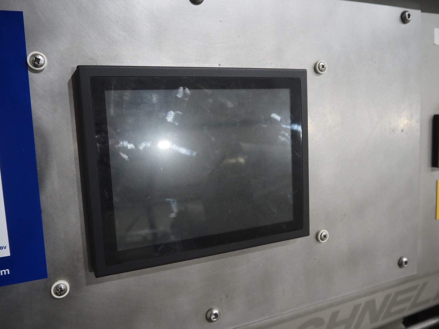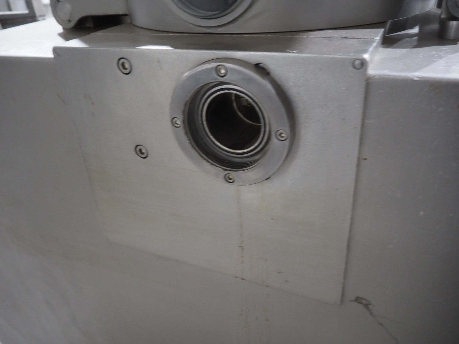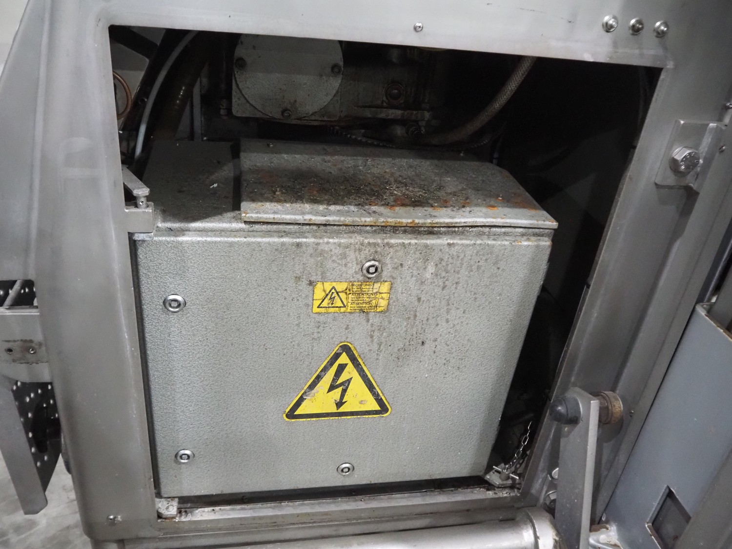 Karl Schnell vacuum filling machine with lifter for 200 liter meat bins, type: 573-SE, serial number: 20691, 380 V, 3 Ph, 50 Hz, 13.6 A, 7.3 kW, total dimensions: 2950 mm x 1100 mm x 1530 mm.