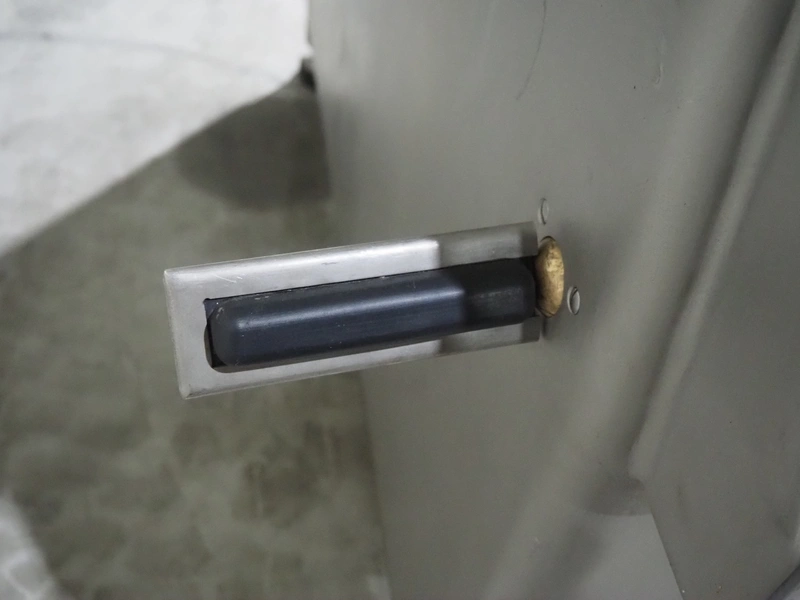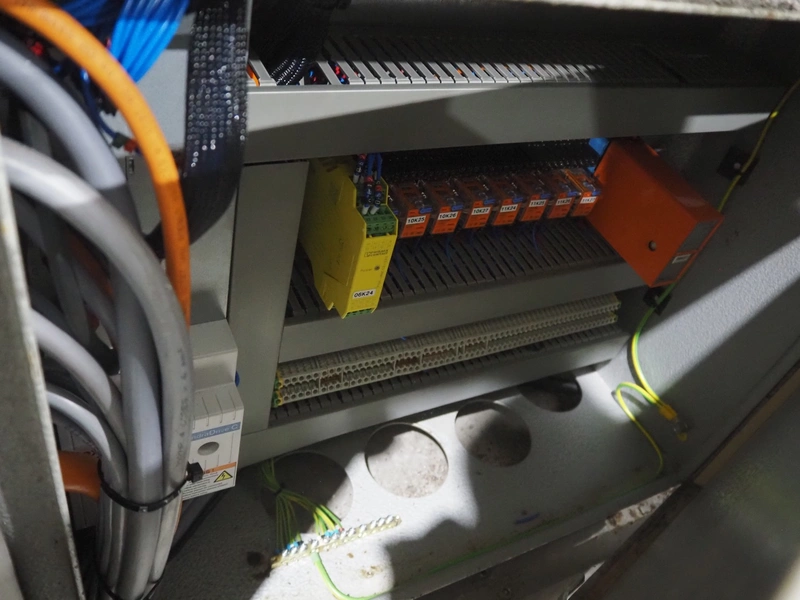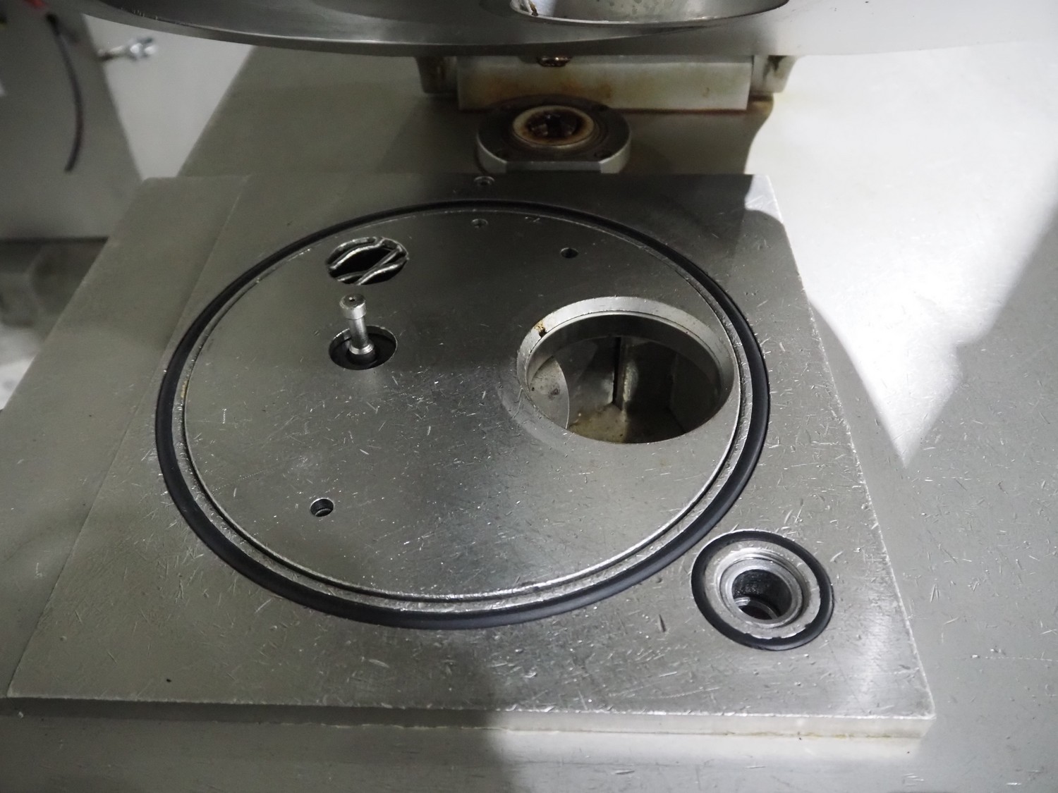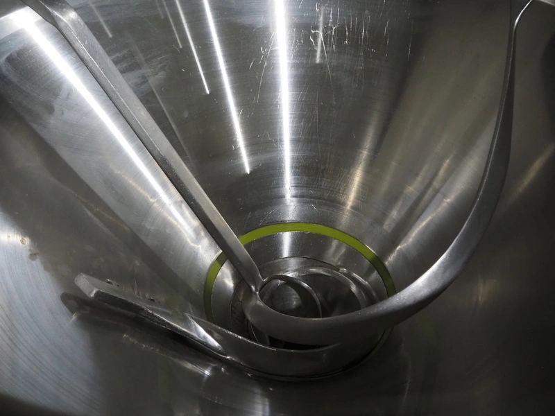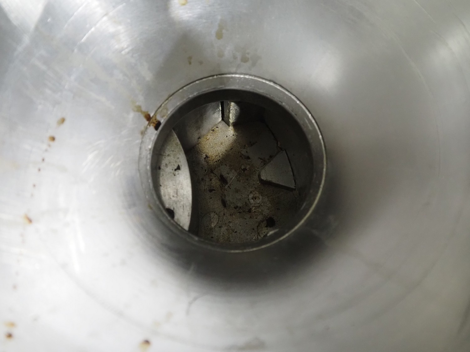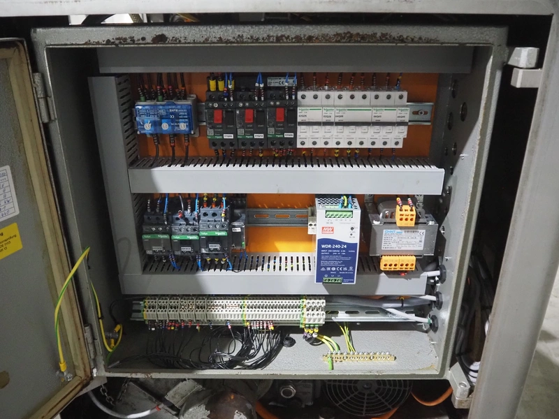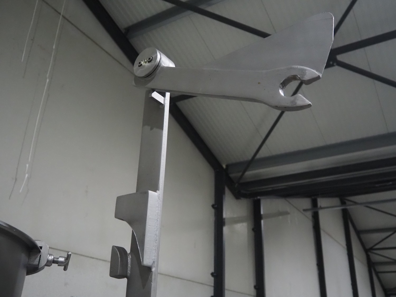 Karl Schnell vacuum filling machine with lifter for 200 liter meat bins, type: 573-SE, serial number: 20691, 380 V, 3 Ph, 50 Hz, 13.6 A, 7.3 kW, total dimensions: 2950 mm x 1100 mm x 1530 mm.
