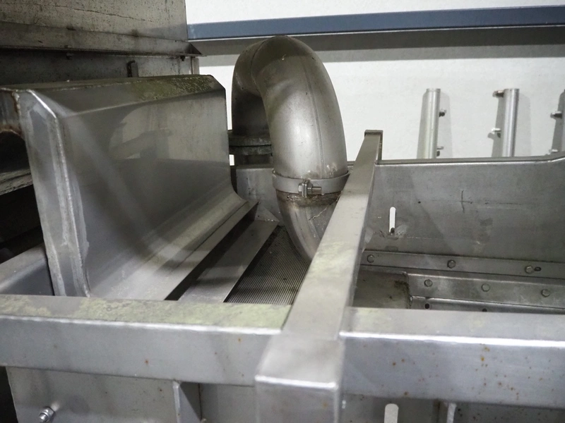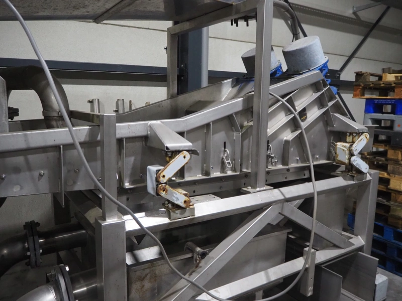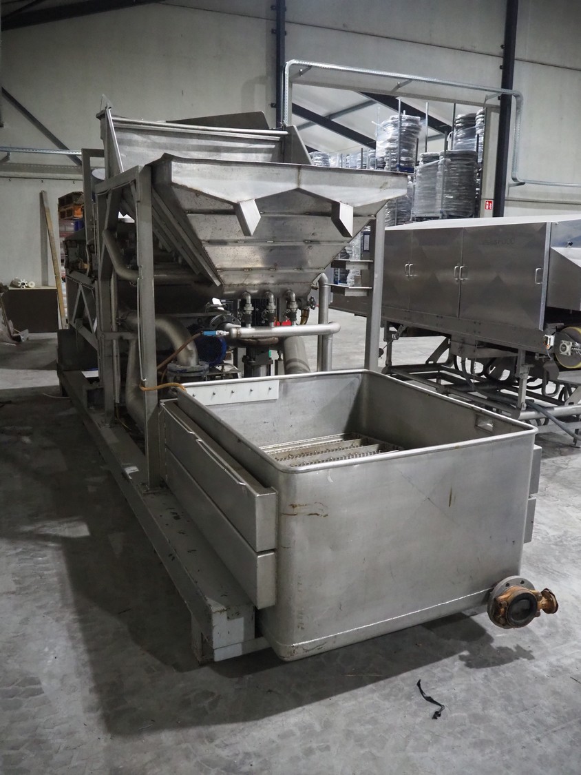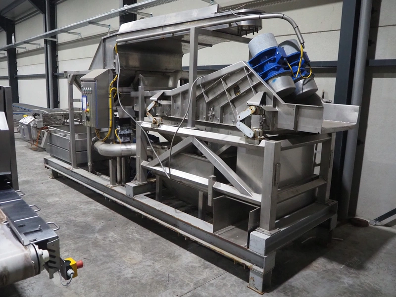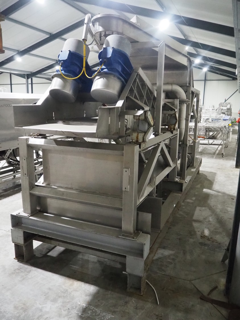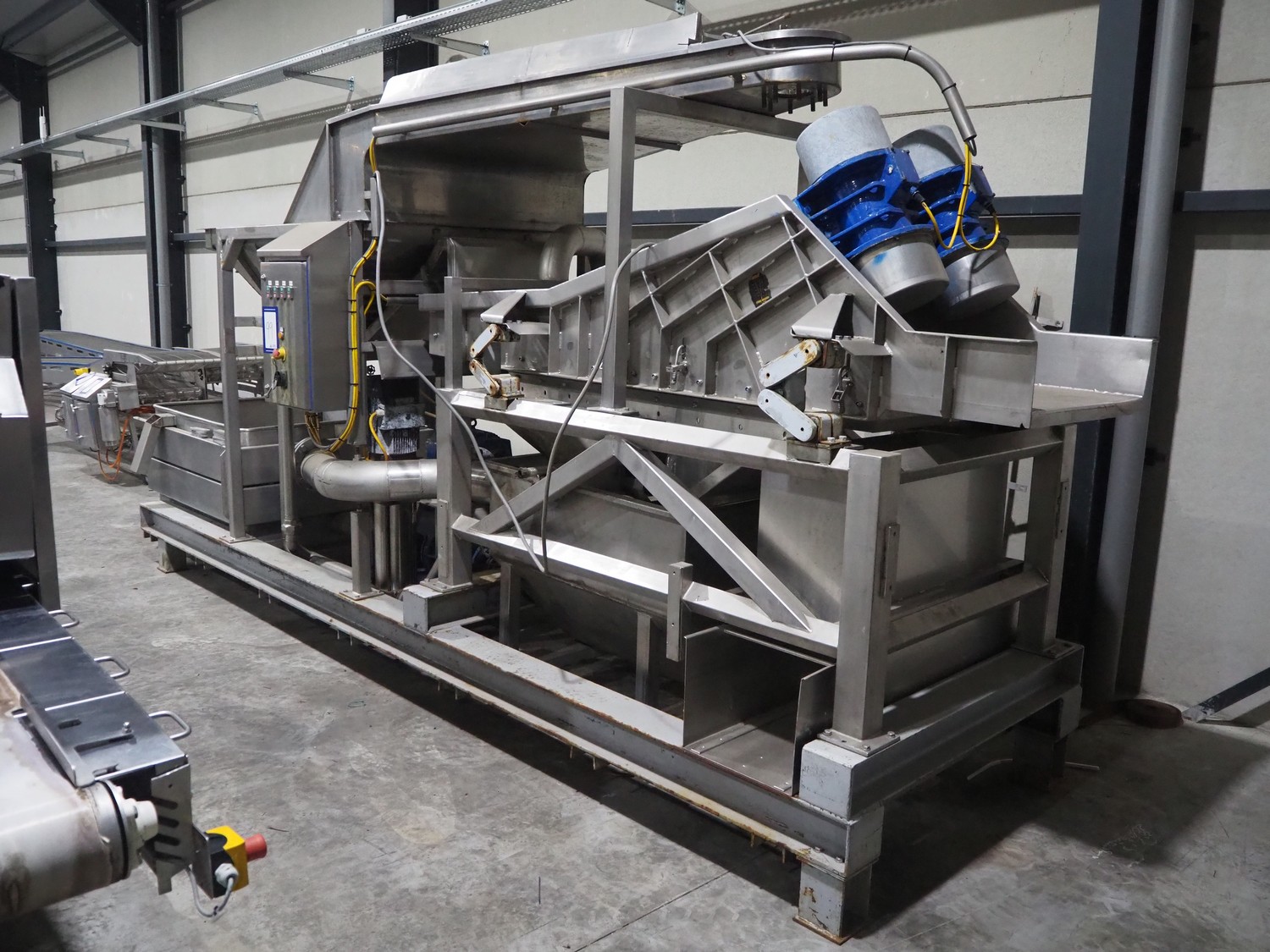 Vegetable washer with vibrating gutter, gutter width: 750 mm, perforations: Ø 5 mm, total dimensions: 5500 mm x 1600 mm x 2700 mm.