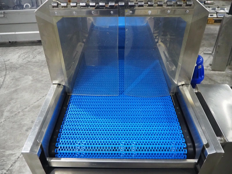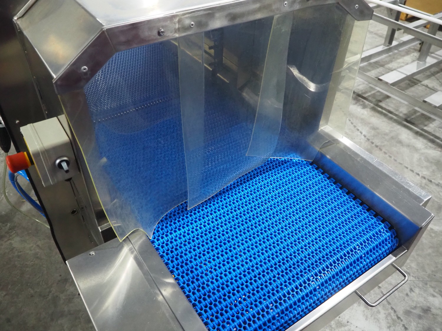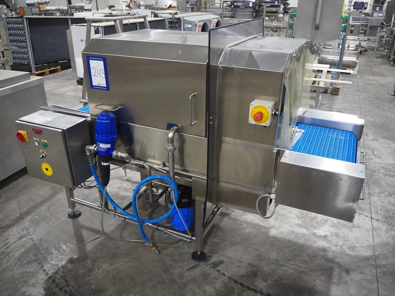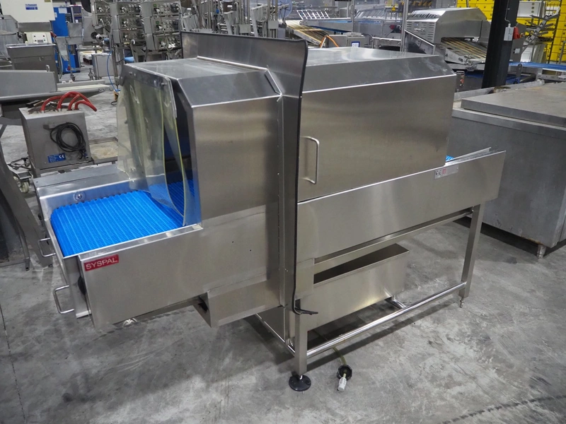Syspal washing machine, type: 512 032448, number: 0233631, year of construction: 2009, plastic mesh belt, belt width: 580 mm, clearance: 590 mm x 430 mm, total dimensions: 2100 mm x 1150 mm x 1500 mm.