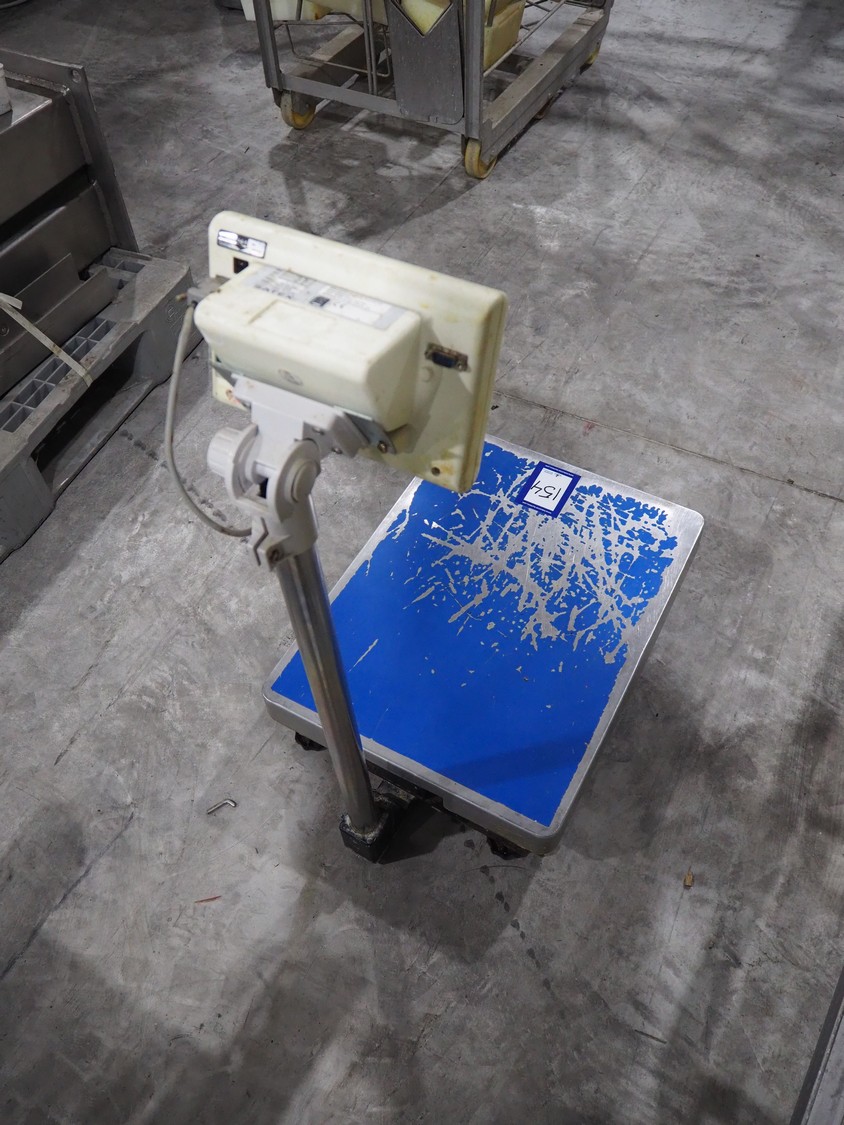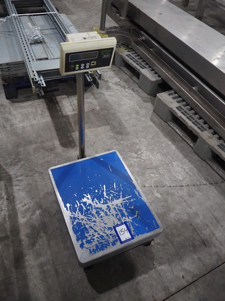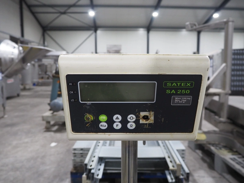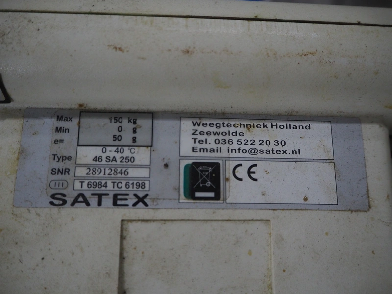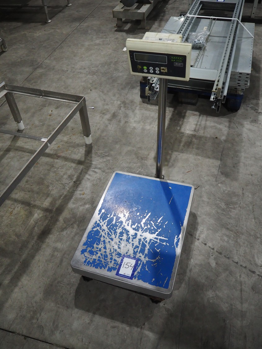 Satex weighing scale, type: 46 SA 250, serial number: 28912846, max: 150 Kg, min: 0 g, e= 50 g, scale dimensions: 600 mm x 450 mm, total dimensions: 770 mm x 450 mm x 965 mm.