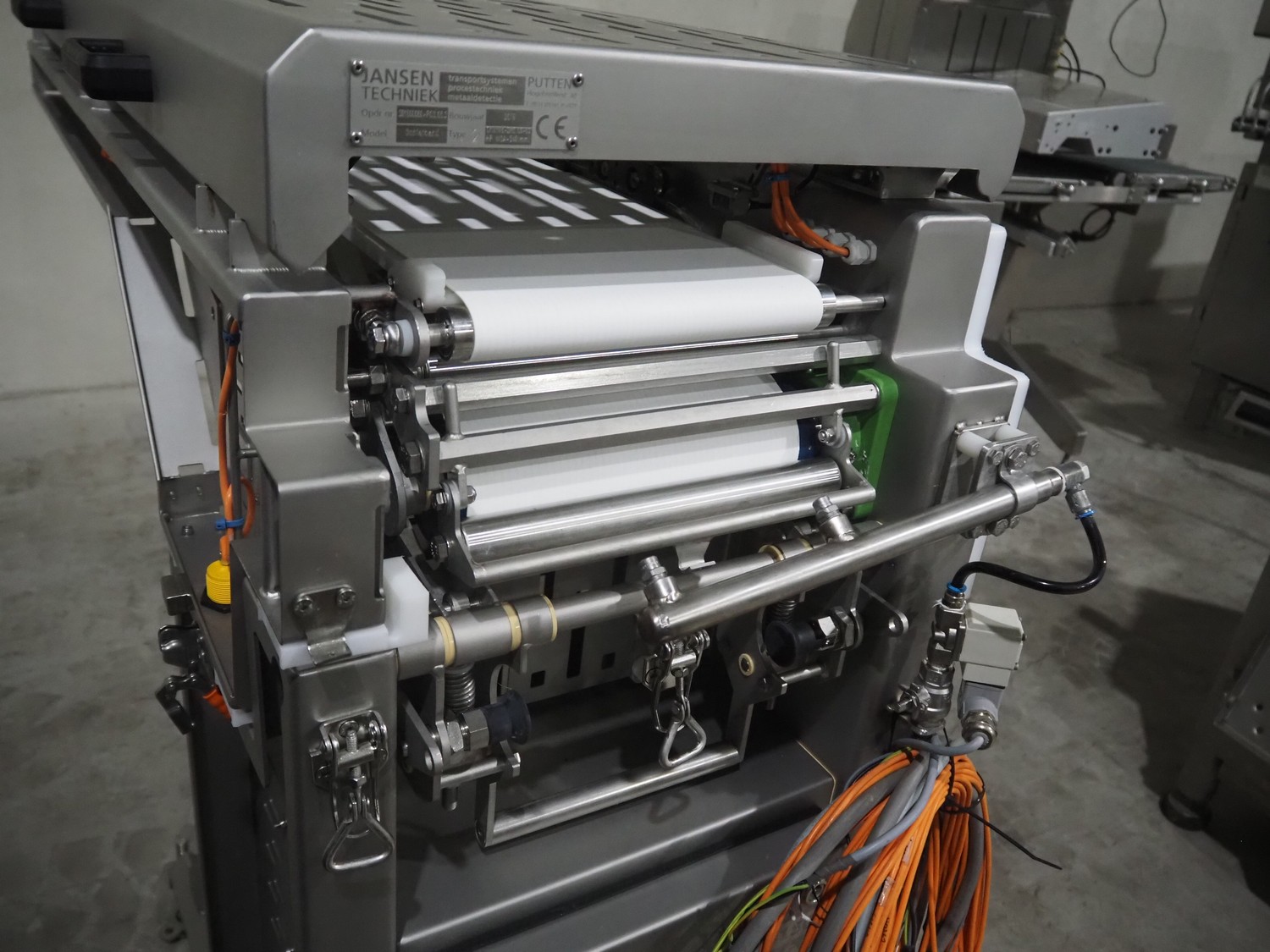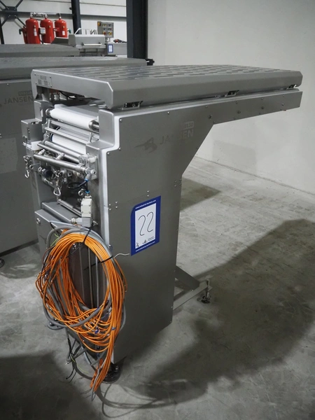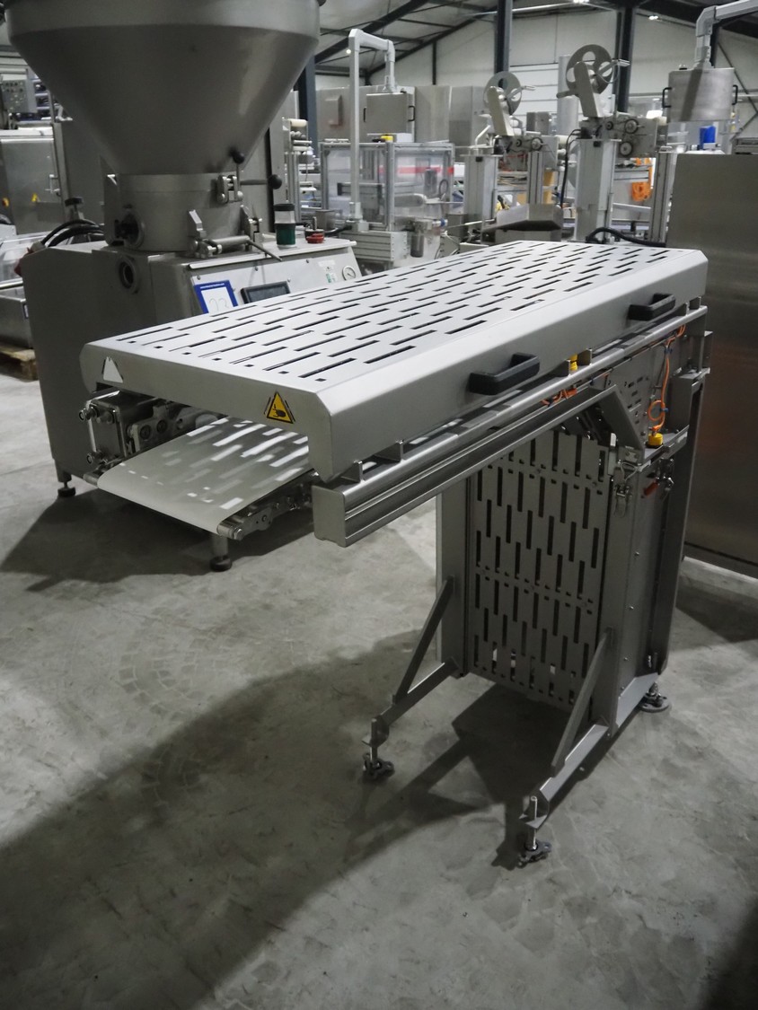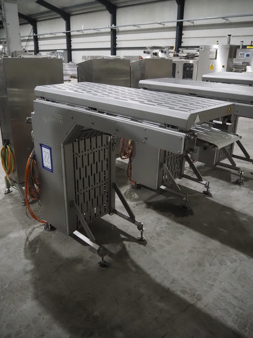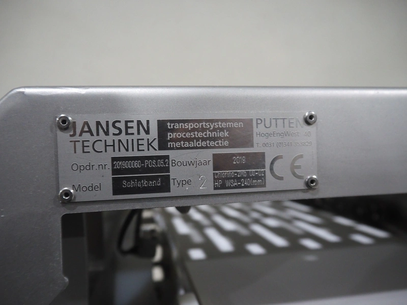 Jansen Techniek shuttle conveyor, type: SBK150, model: Schietband, year of construction: 2019, plastic belt, belt width: 240 mm, total dimensions: 1400 mm x 600 mm x 1250 mm. Including switch cabinet, dimensions: 700 mm x 500 mm x 1250.
