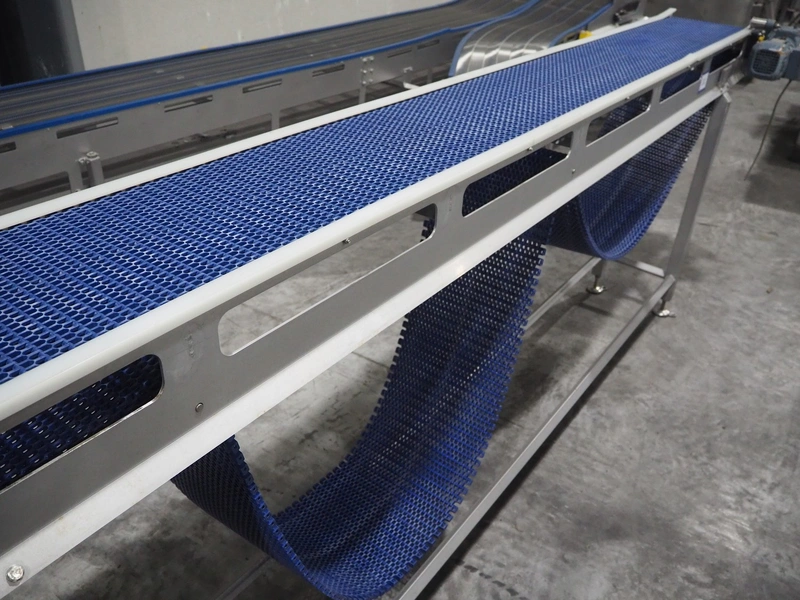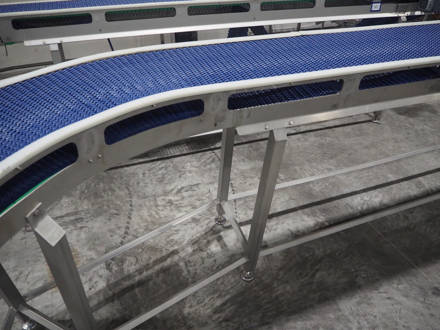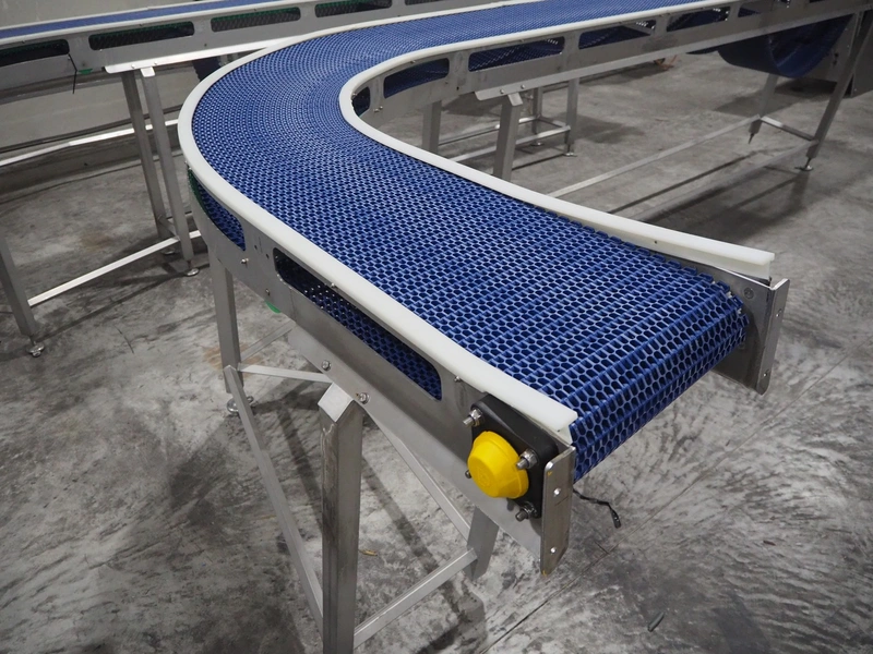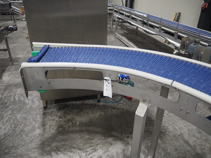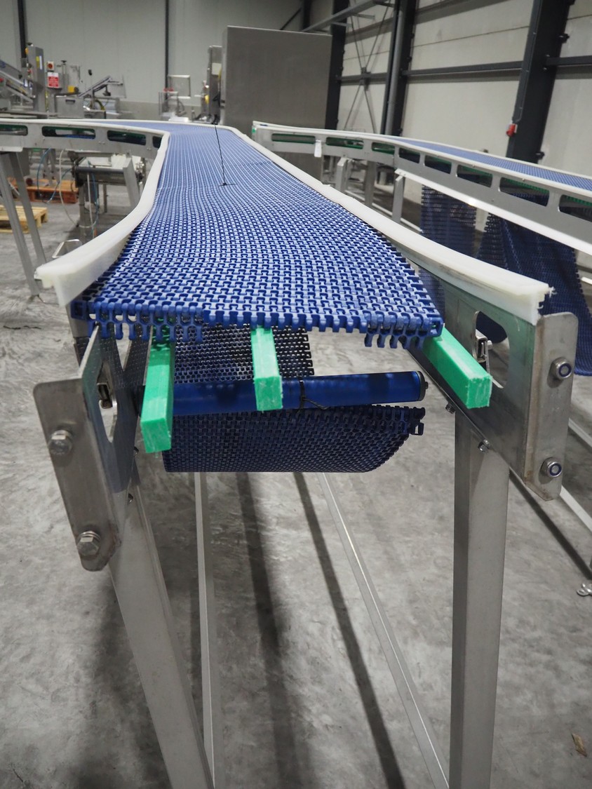 De Jager BV 180º curve conveyor, type: 11-0608-08, year of construction: 01/2012, plastic mesh belt, belt width: 355, total dimensions: 6100 mm x 4900 mm x 1250 mm.