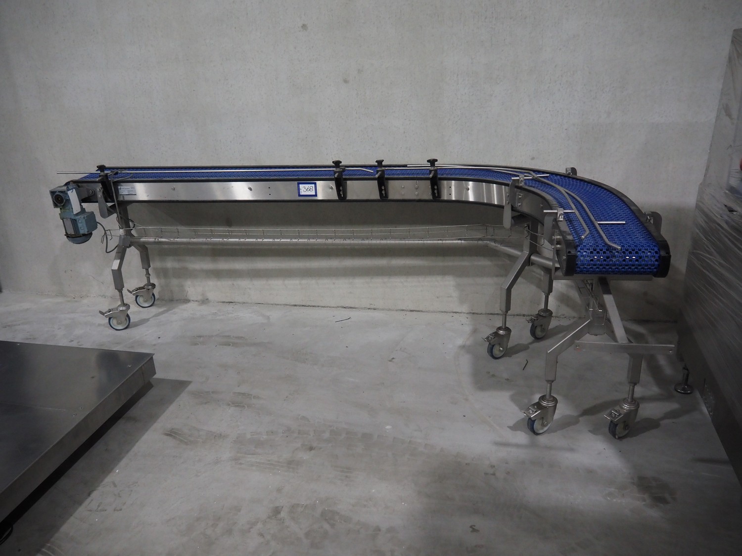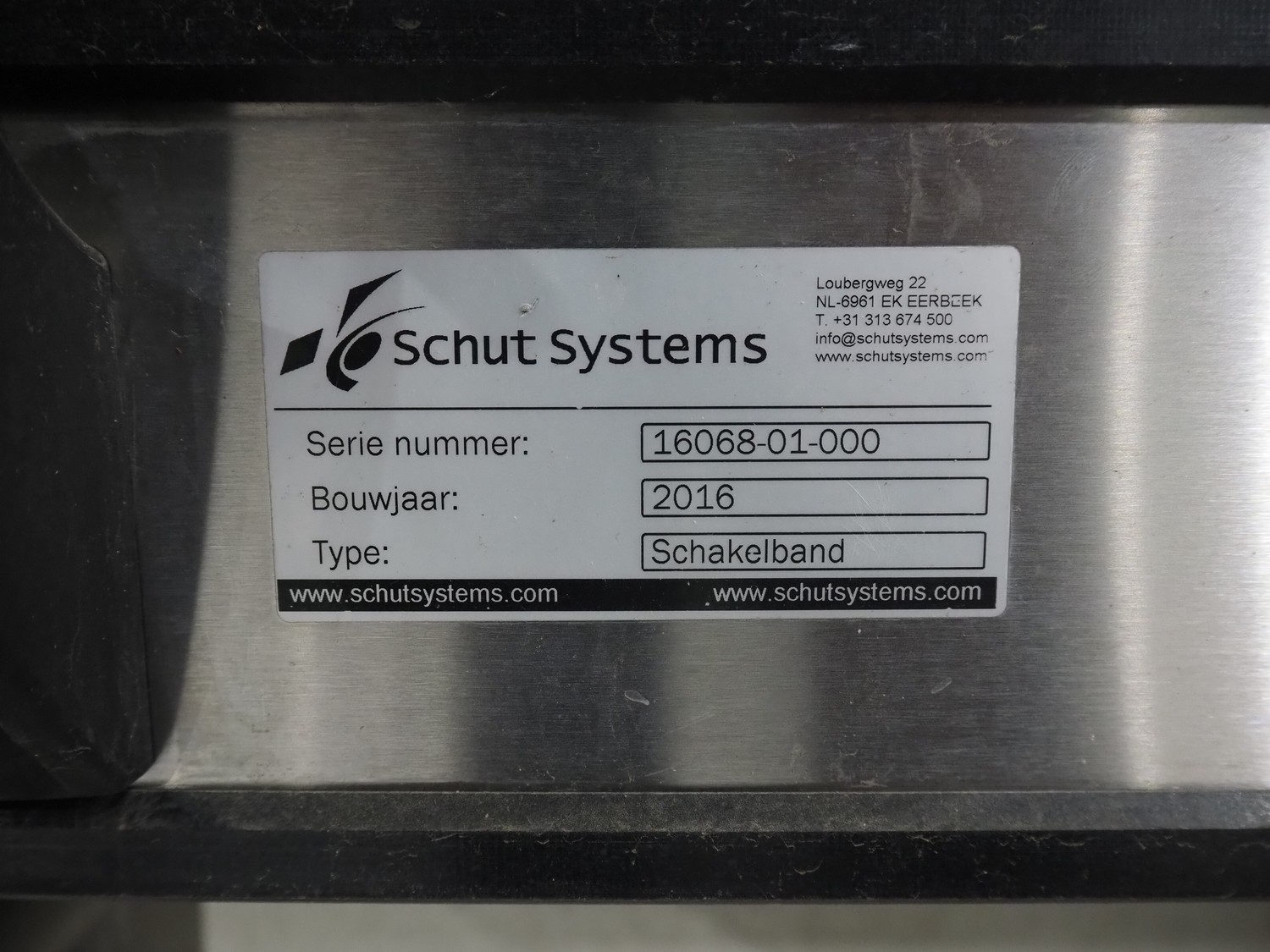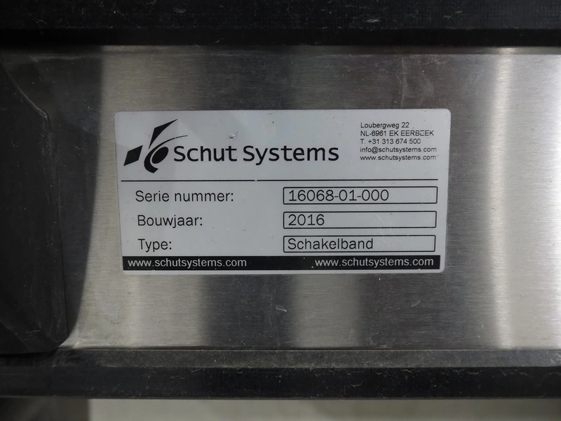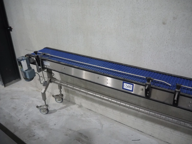 Mobile transport belt, type: Schakelband, serial number: 16068-01-000, year of construction: 2016, plastic mesh belt, belt width: 280 mm, working width: 260 mm, total dimensions: 3000 mm x 1550 mm x 1000 mm.