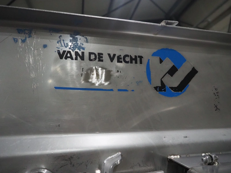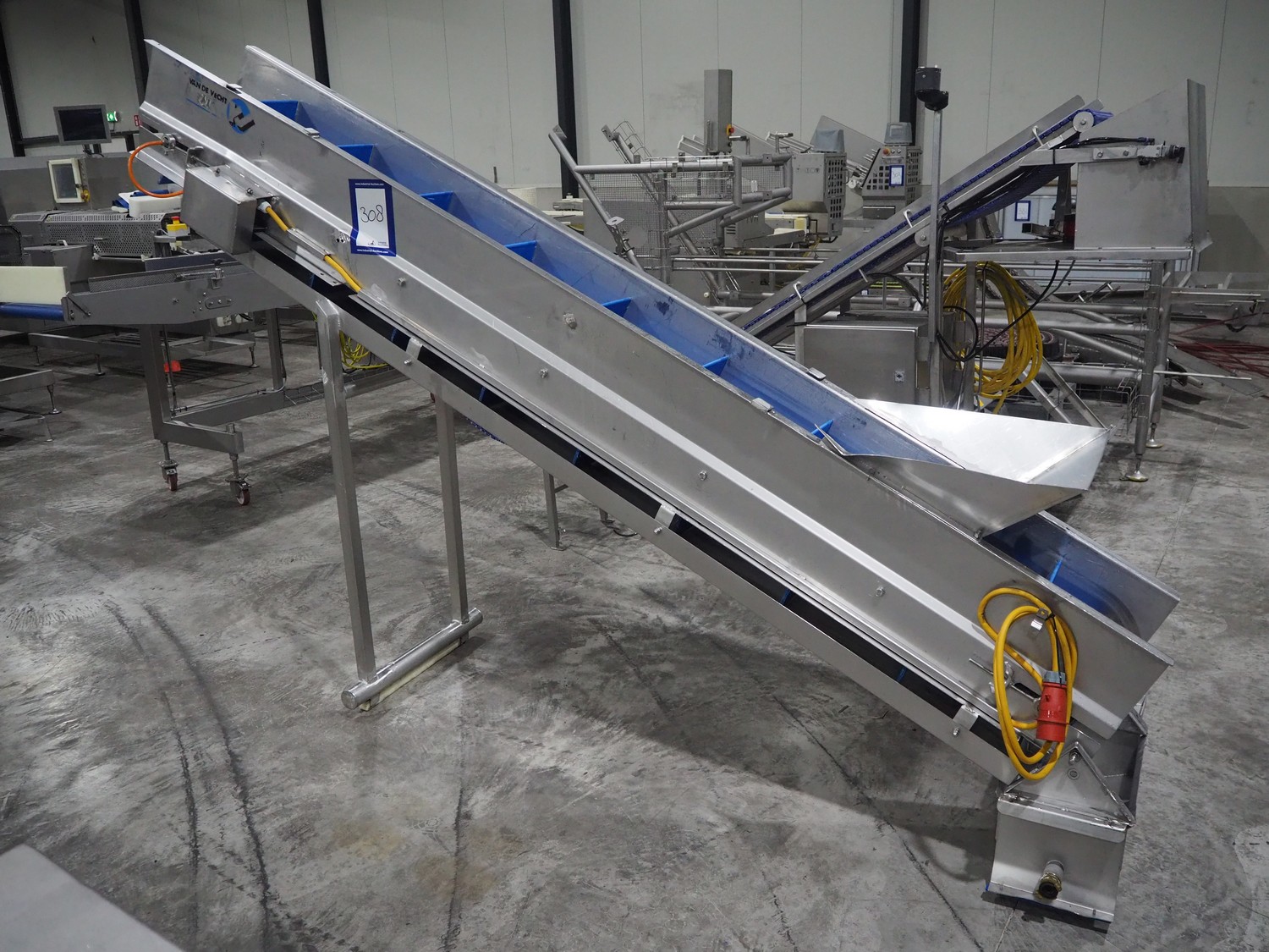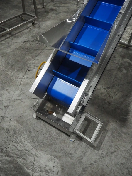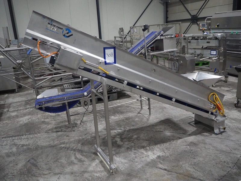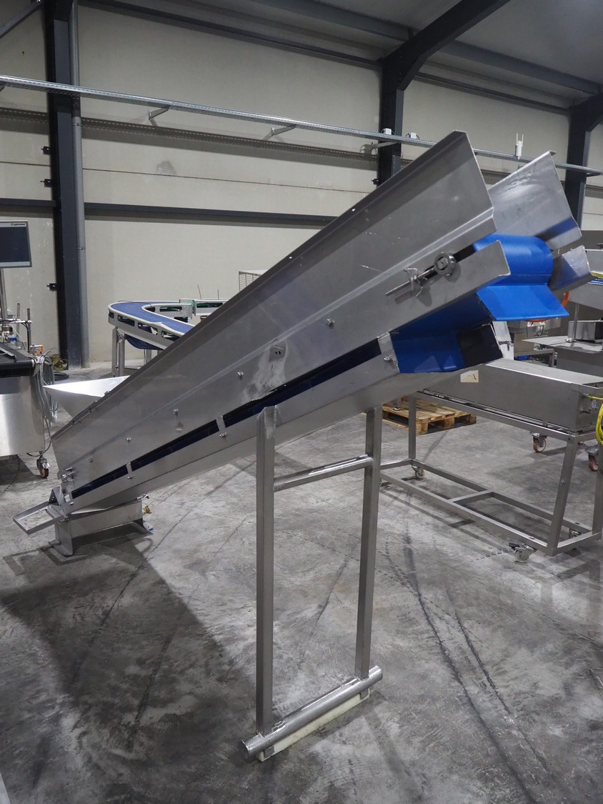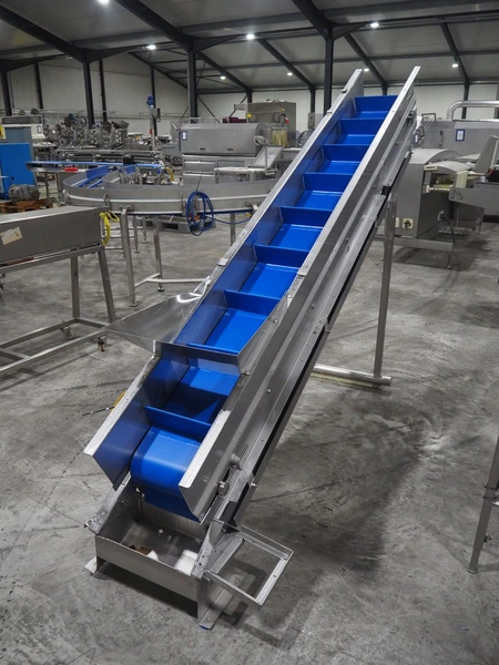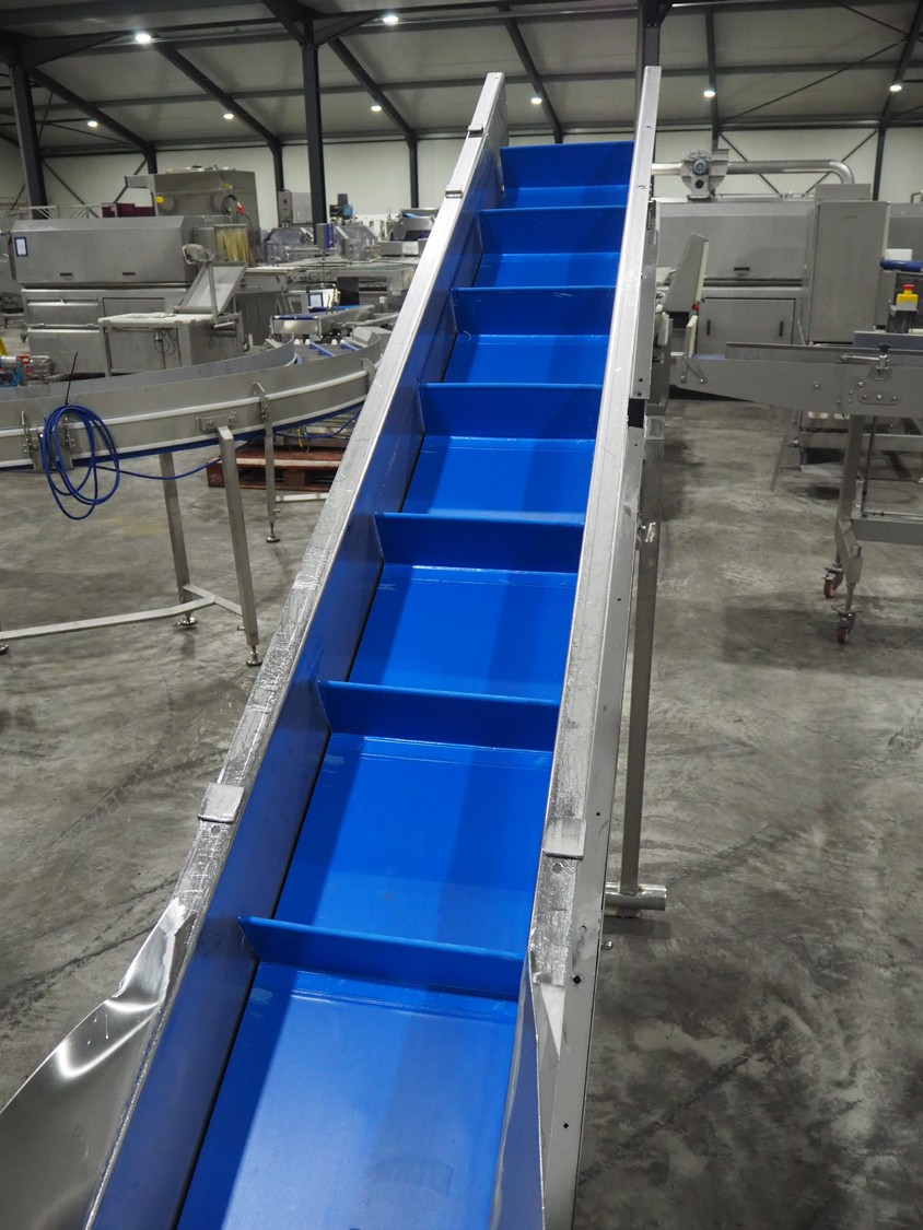 Van de Vecht elevating belt, plastic belt, belt width: 300 mm, divider height: 10 mm, distance between dividers: 310 mm, elevating height: 1700 mm, total dimensions: 2800 mm x 750 mm x 1900 mm.