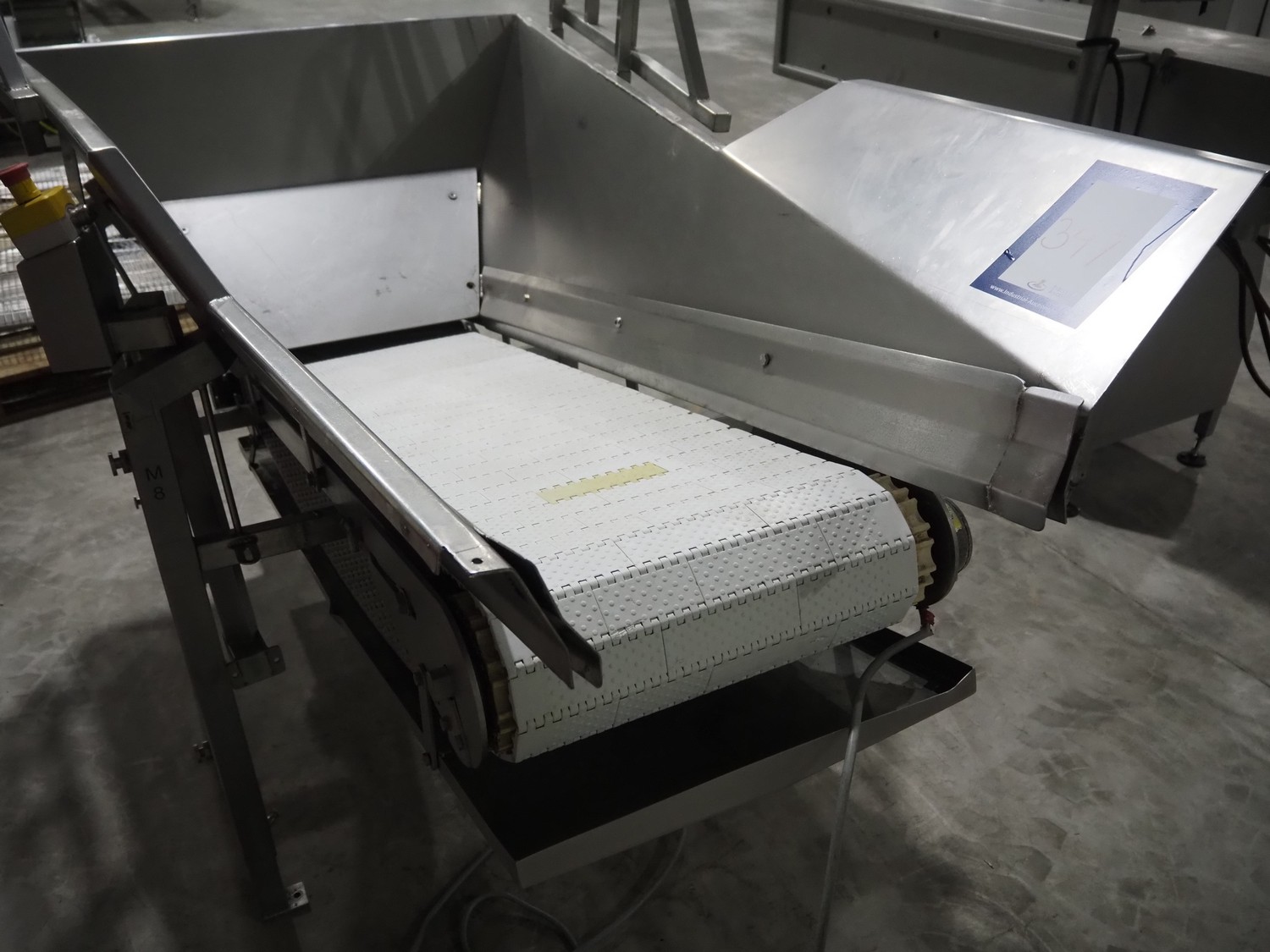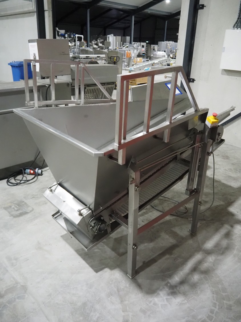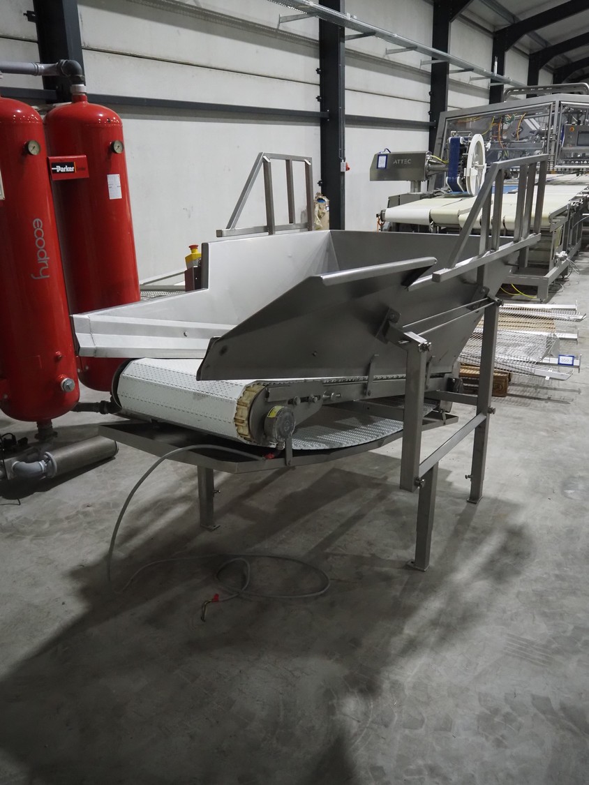 Elevating belt with infeed hopper, s/s frame, plastic belt, belt width: 455 mm, total dimensions: 1900 mm x 1200 mm x 1540 mm.