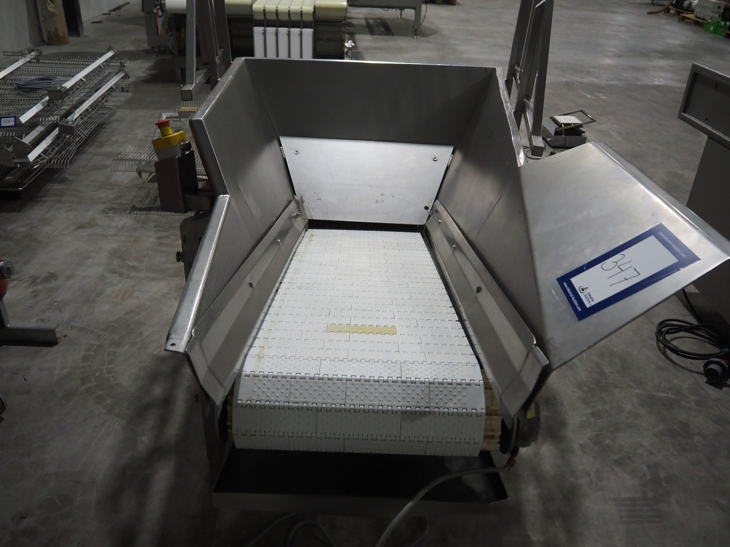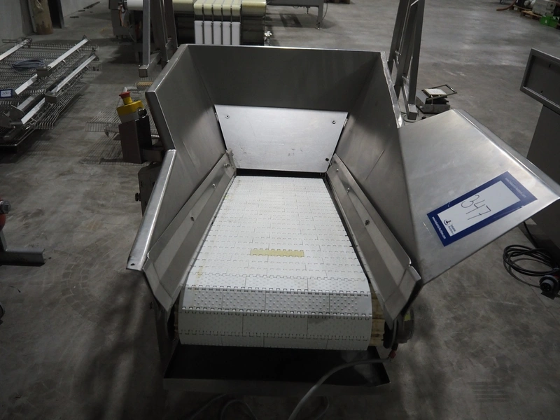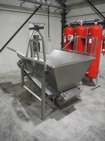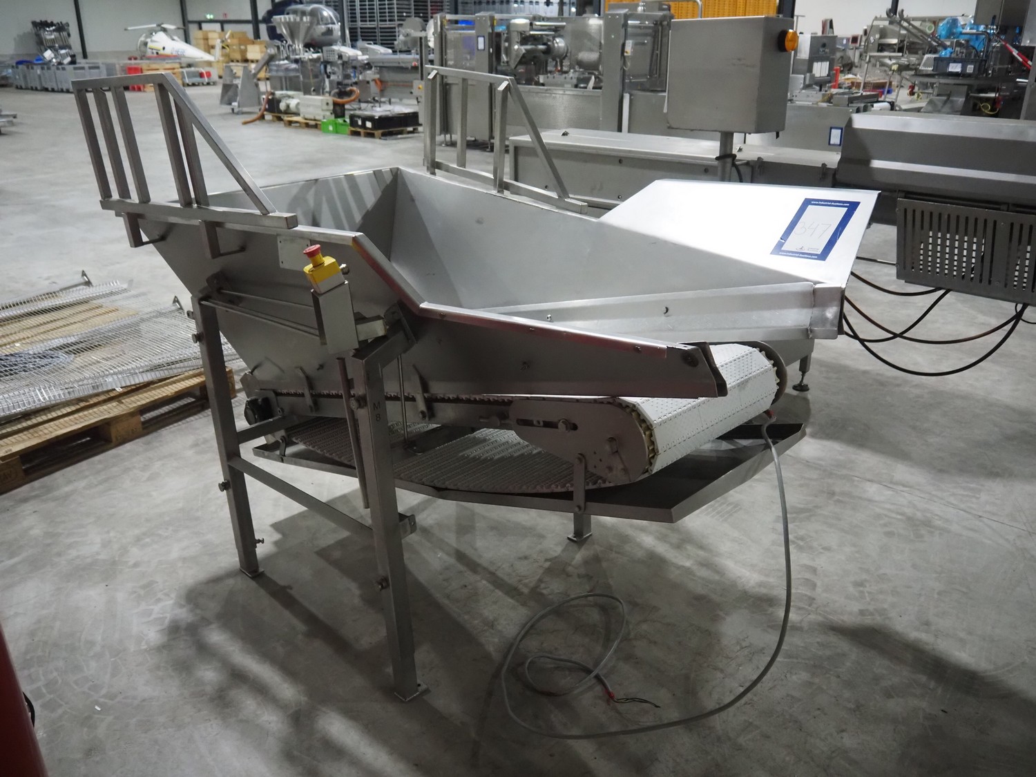 Elevating belt with infeed hopper, s/s frame, plastic belt, belt width: 455 mm, total dimensions: 1900 mm x 1200 mm x 1540 mm.
